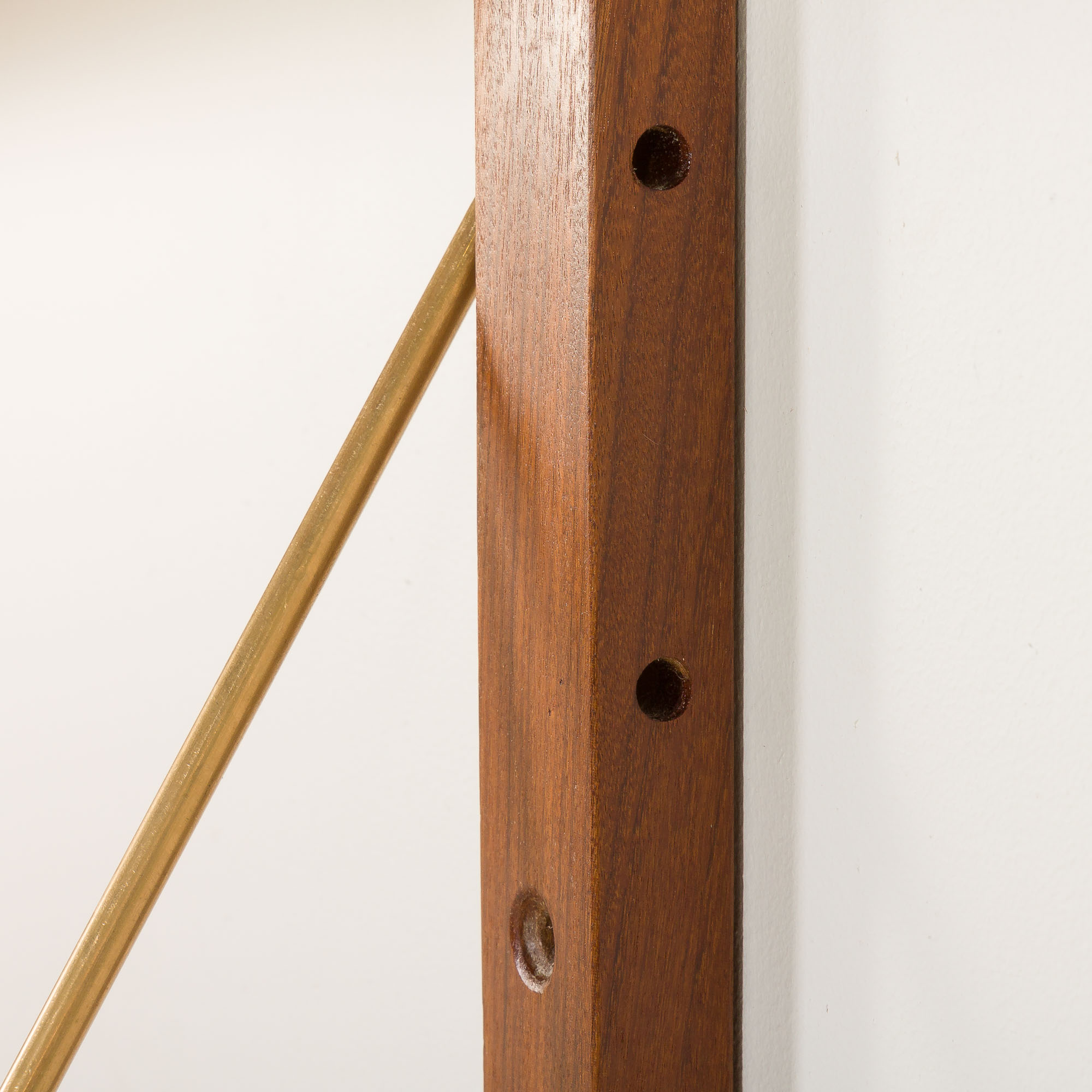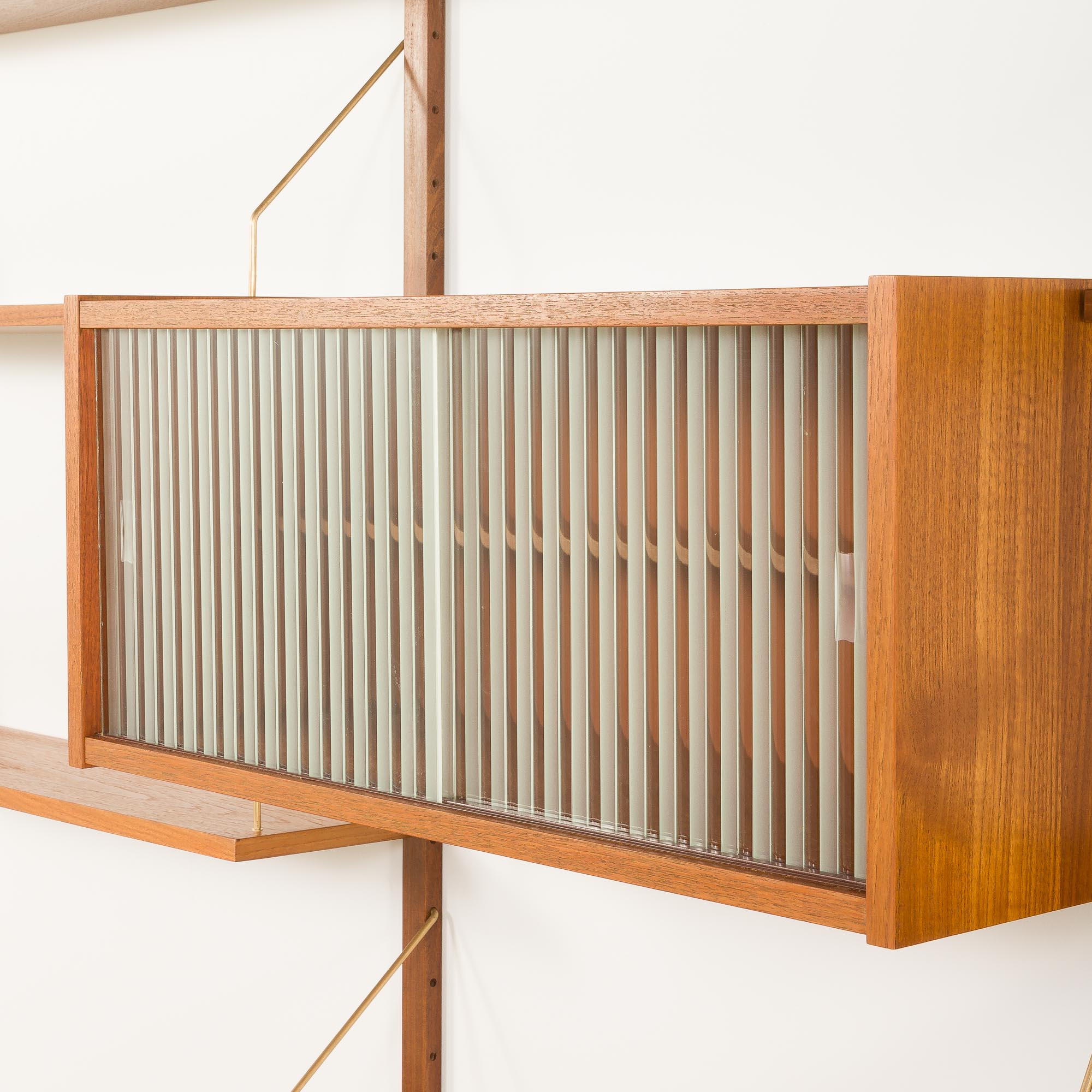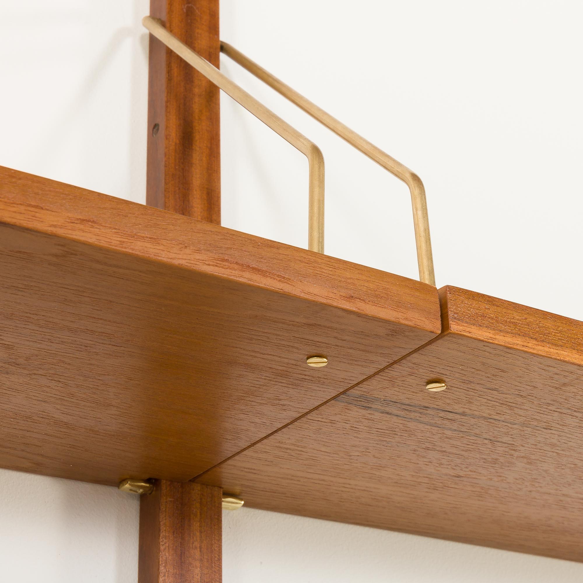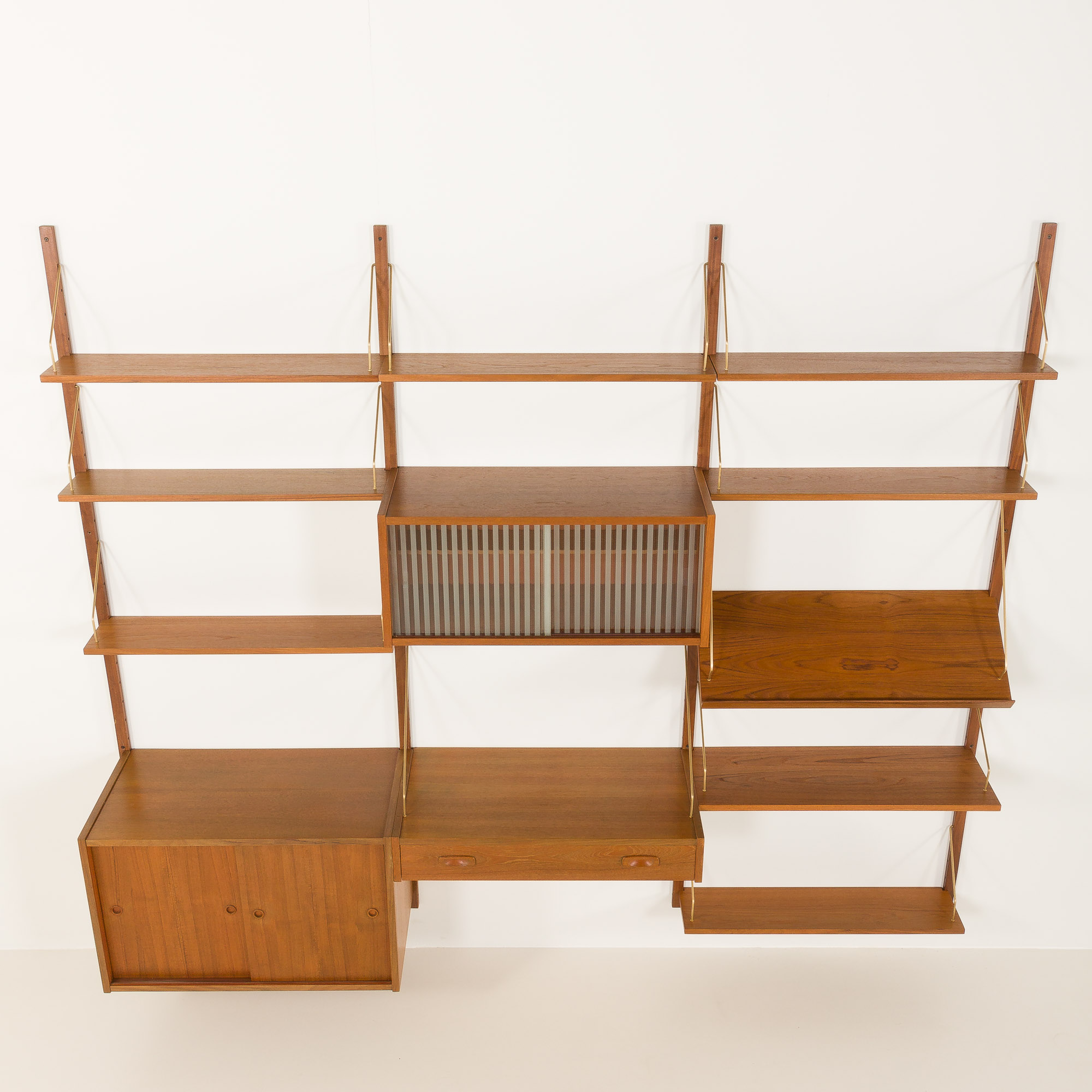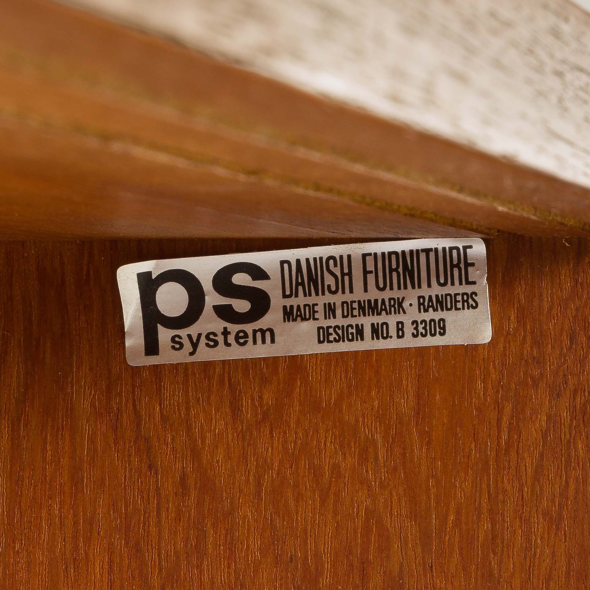 Extremely functional modular shelving and wall unit system designed by Preben Sørensen in the 1960s and made by PS systems, Randers. Made from teak wood and teak veneer—materials known for their warm color, durability, and longevity—it is built to last for many more decades. The variety of components offers a versatile mix of display and storage options. Adjustable shelves allow for the display of personal items or art, regardless of size.