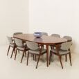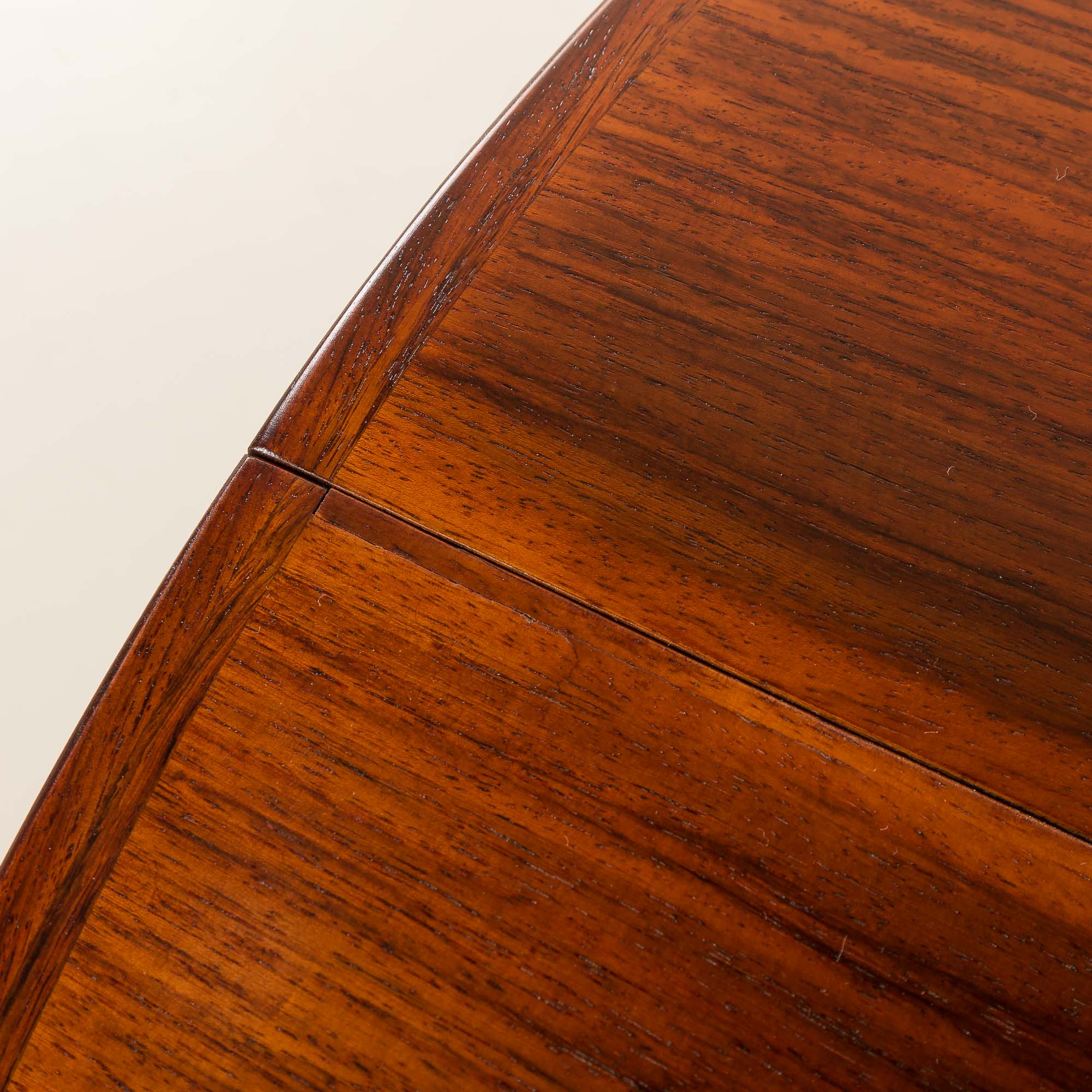 La table a été rénovée. La surface a été soigneusement repeinte avec de nouvelles couches de laque satinée, révélant la profondeur du grain du bois de rose. Le mécanisme d'extension a été vérifié et fonctionne correctement. L'étiquette d'origine du fabricant est conservée sur le fond. Cette pièce reste en excellent état vintage avec des signes d'utilisation absolument mineurs.