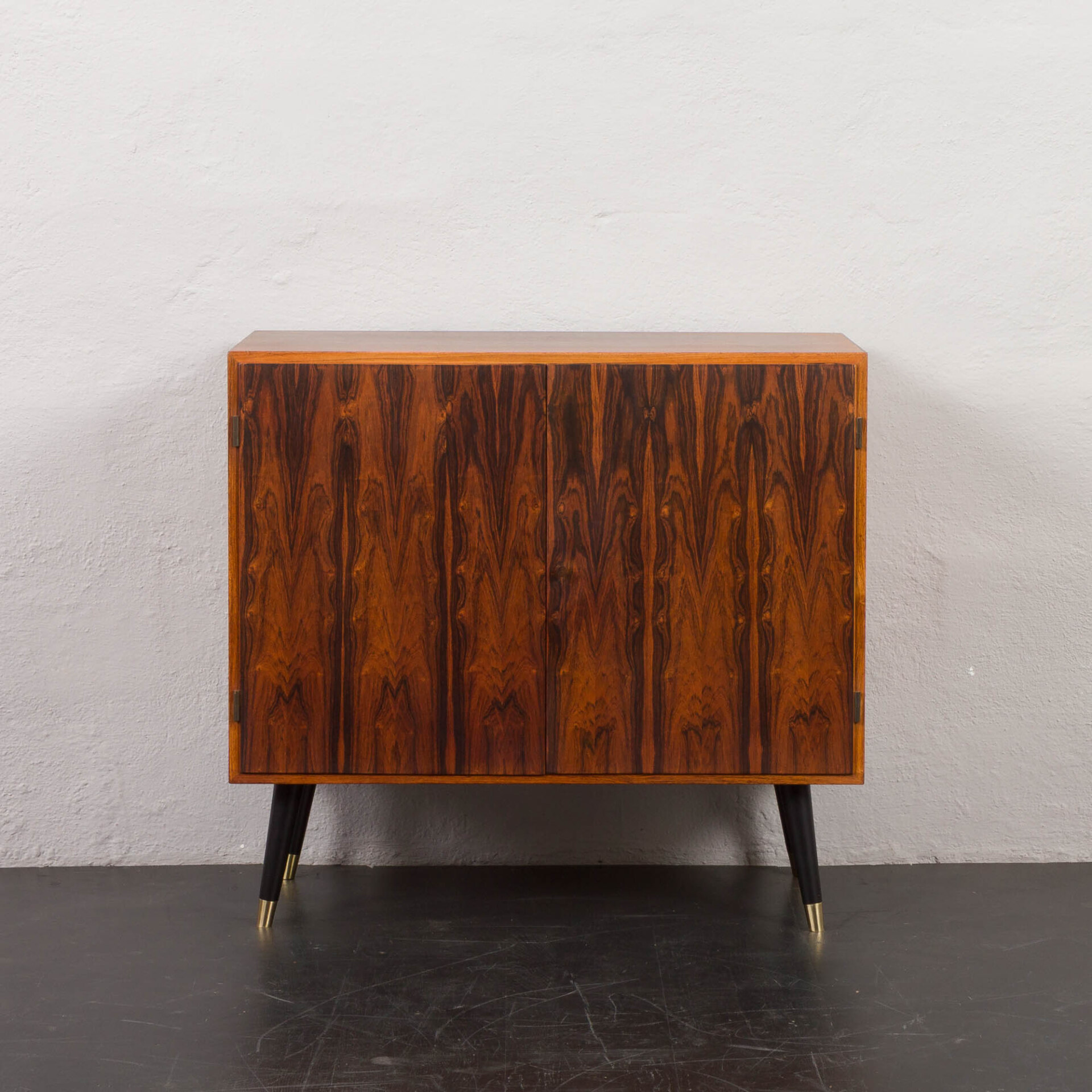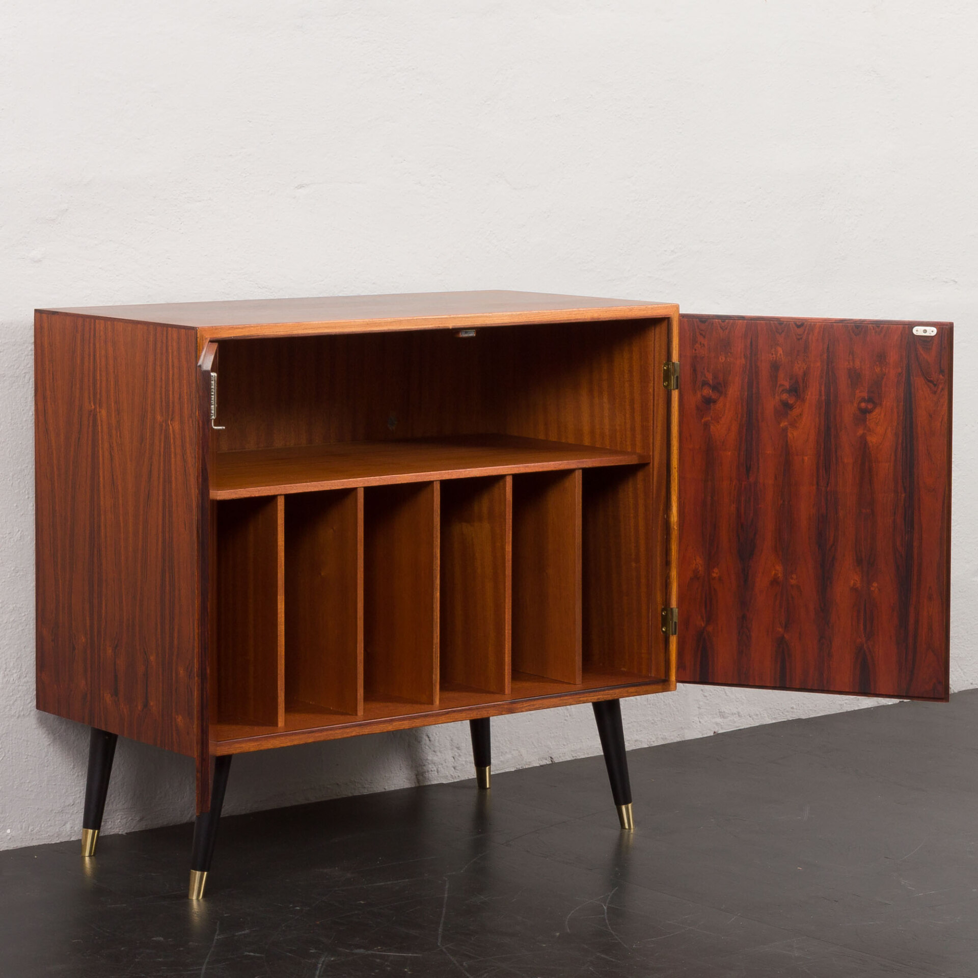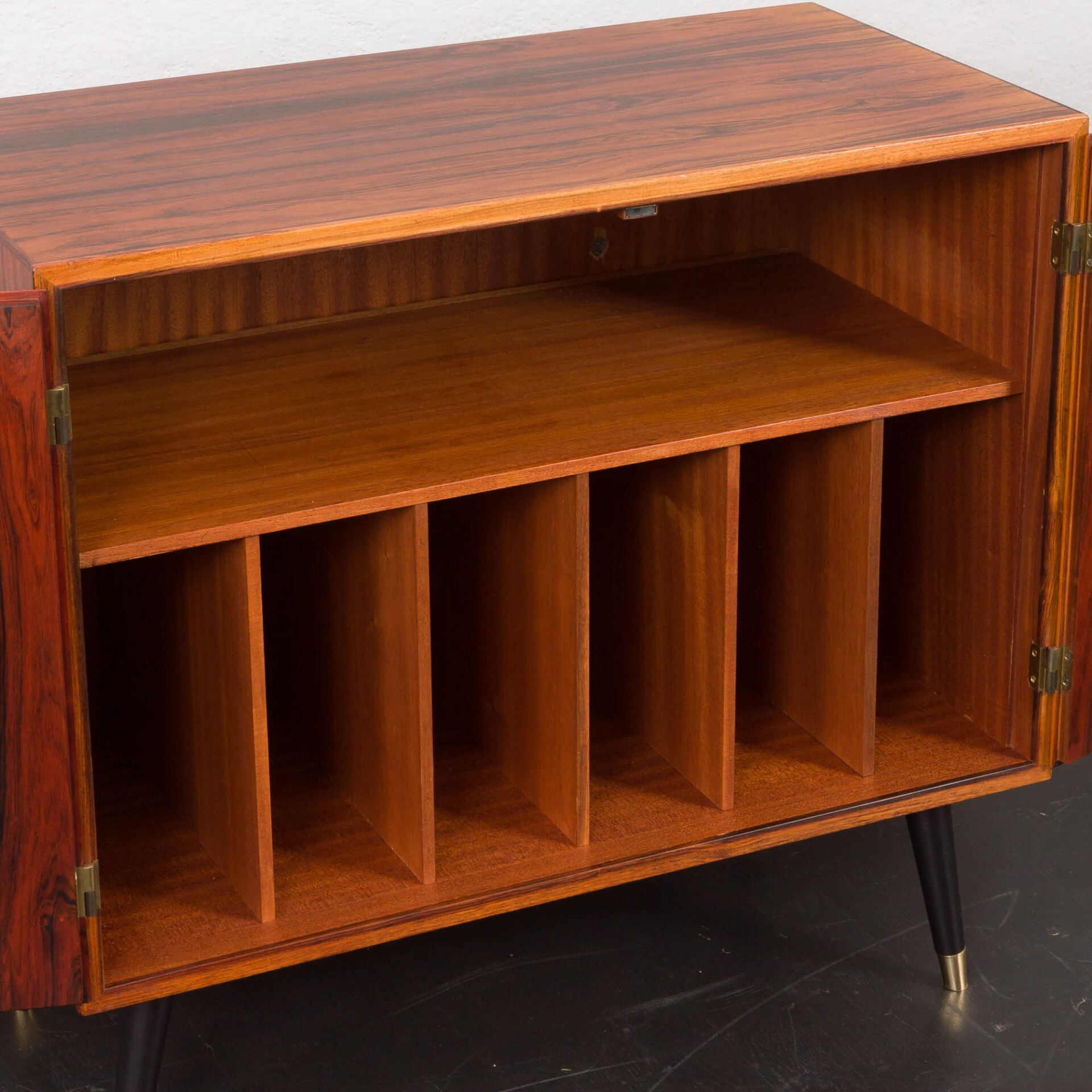 Le meuble vintage en bois de rose pour disques vinyles, fabriqué au Danemark dans les années 1960, est un meuble parfait pour les amateurs de vinyles ou de magazines. Ce meuble vintage témoigne de la maîtrise du design danois - fonctionnalité et beauté, visibles dans les grains parfaitement assortis du placage de bois de rose. Ce buffet de taille moyenne repose sur des pieds peints en noir avec une élégante terminaison en laiton et comporte des portes à charnières en laiton. L'intérieur comporte six compartiments pour les disques vinyles et une étagère pour le matériel audio. Les étagères mesurent 32 cm de haut et 39 cm de profondeur.