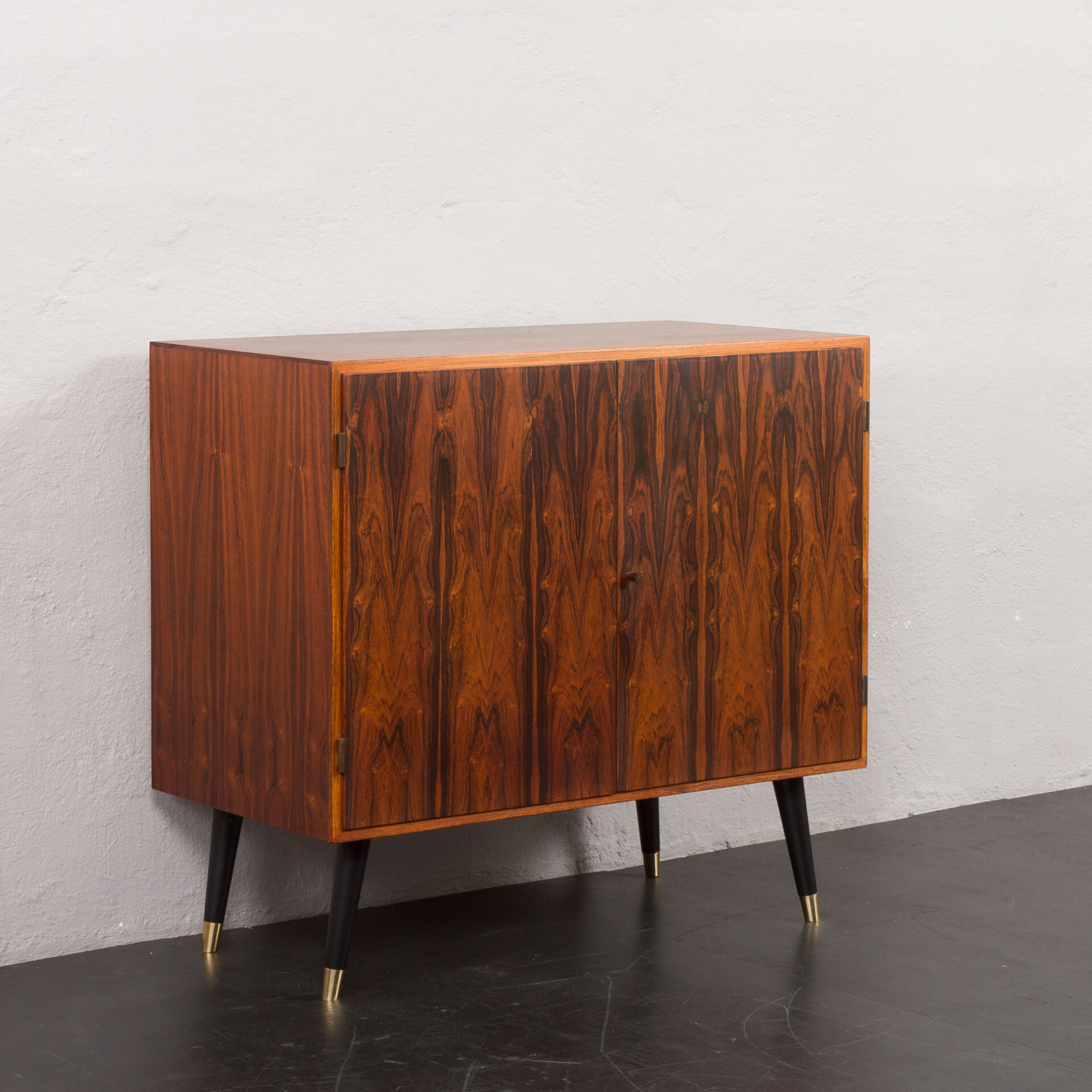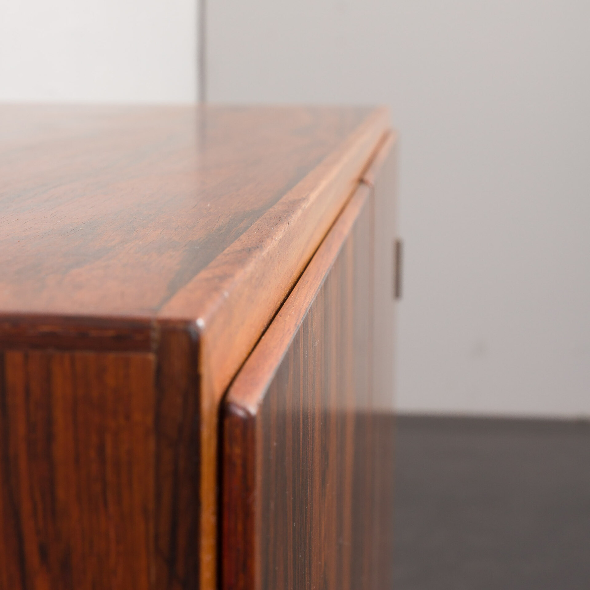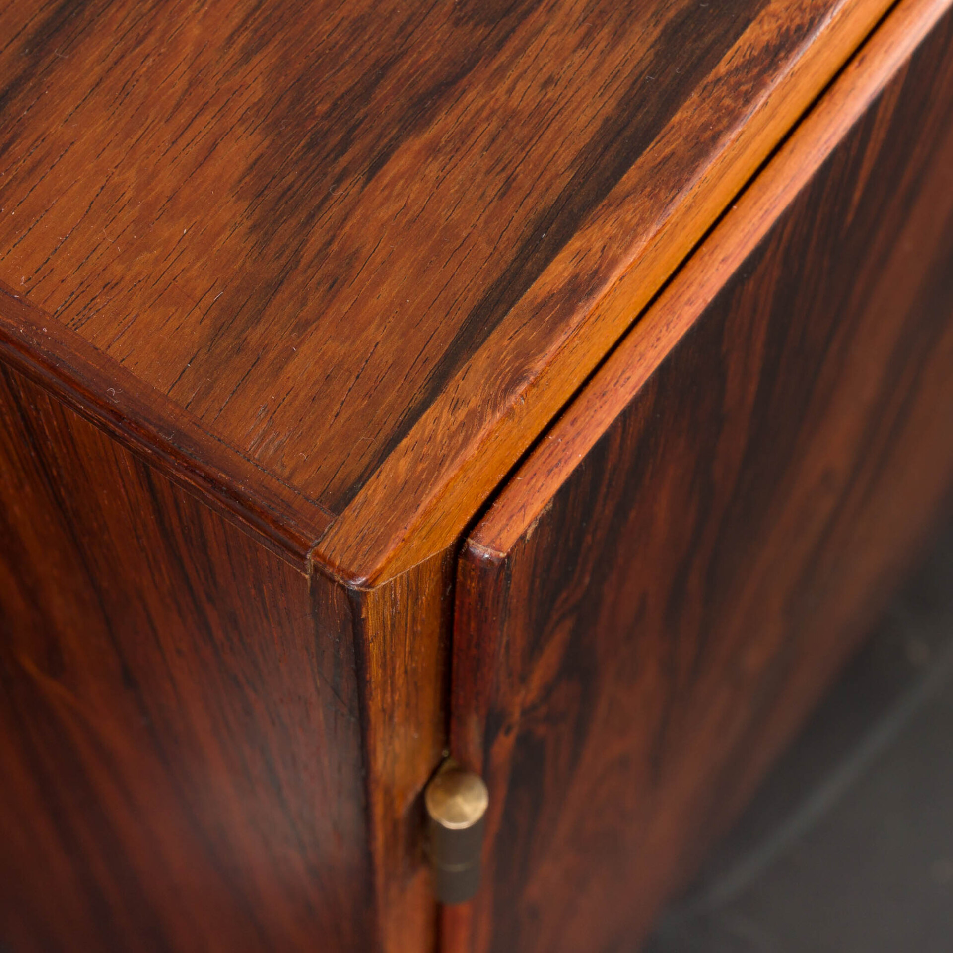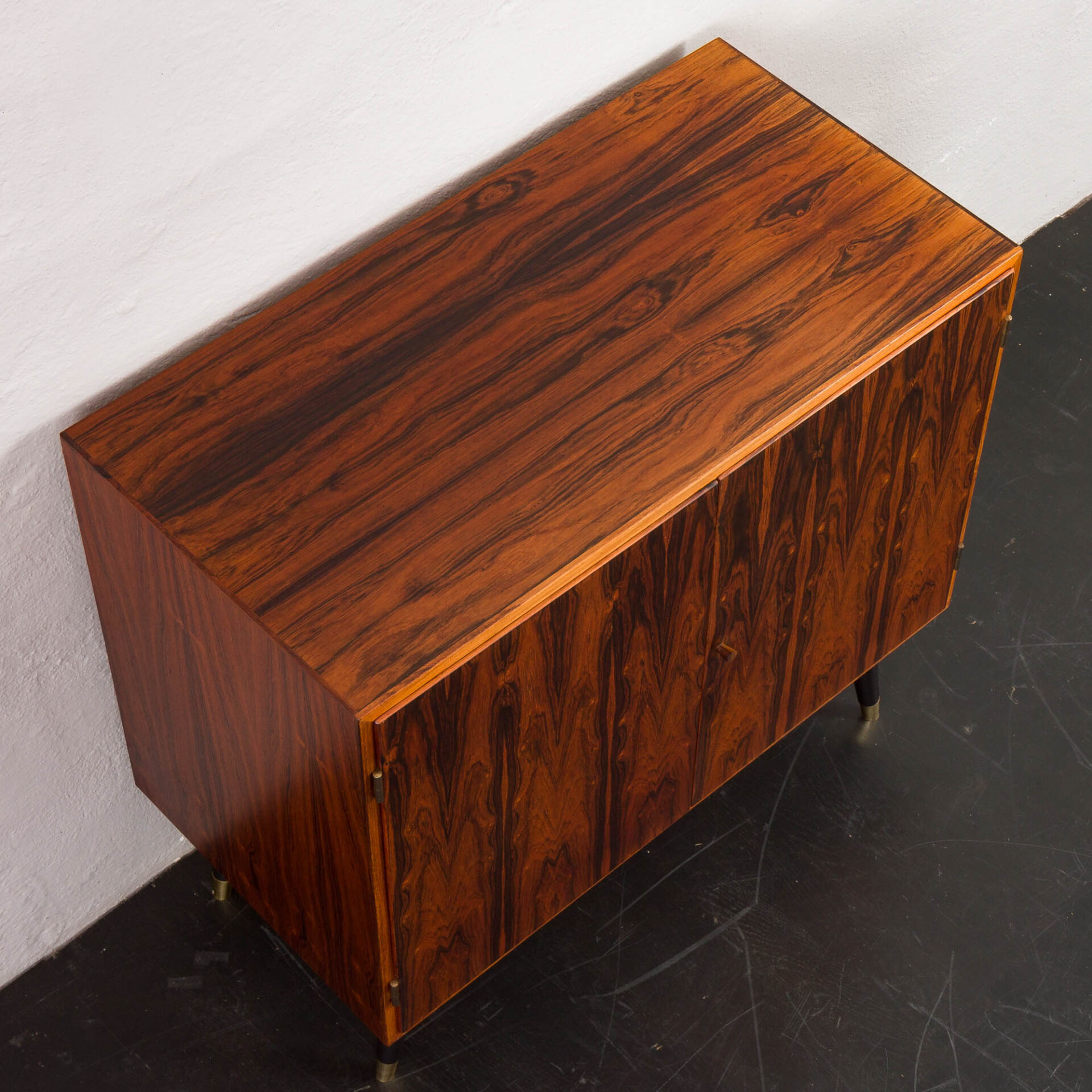 Le meuble vintage en bois de rose pour disques vinyles, fabriqué au Danemark dans les années 1960, est un meuble parfait pour les amateurs de vinyles ou de magazines. Ce meuble vintage témoigne de la maîtrise du design danois - fonctionnalité et beauté, visibles dans les grains parfaitement assortis du placage de bois de rose. Ce buffet de taille moyenne repose sur des pieds peints en noir avec une élégante terminaison en laiton et comporte des portes à charnières en laiton. L'intérieur comporte six compartiments pour les disques vinyles et une étagère pour le matériel audio. Les étagères mesurent 32 cm de haut et 39 cm de profondeur.