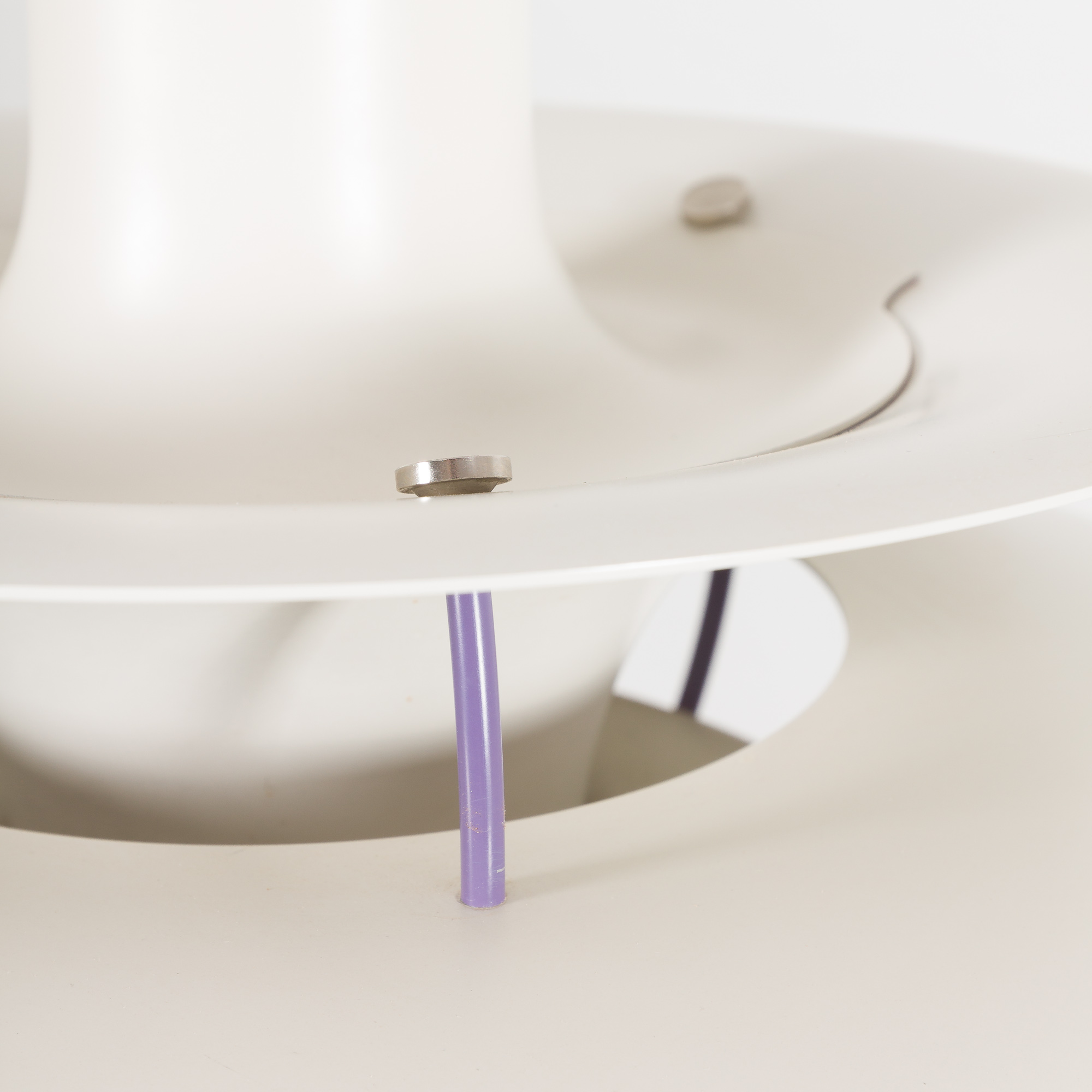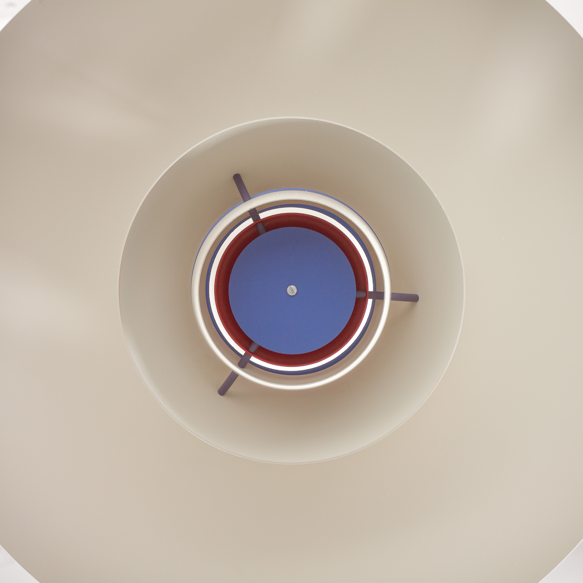 The lamps also feature a curved, trumpet-shaped reflector, which directs light downwards, creating a soft, warm glow. Over the years, Louis Poulsen has produced the PH5 in various colors, with the most famous being white, and later editions in blue, red, and orange. The presented set is in white and features violet details in the construction.