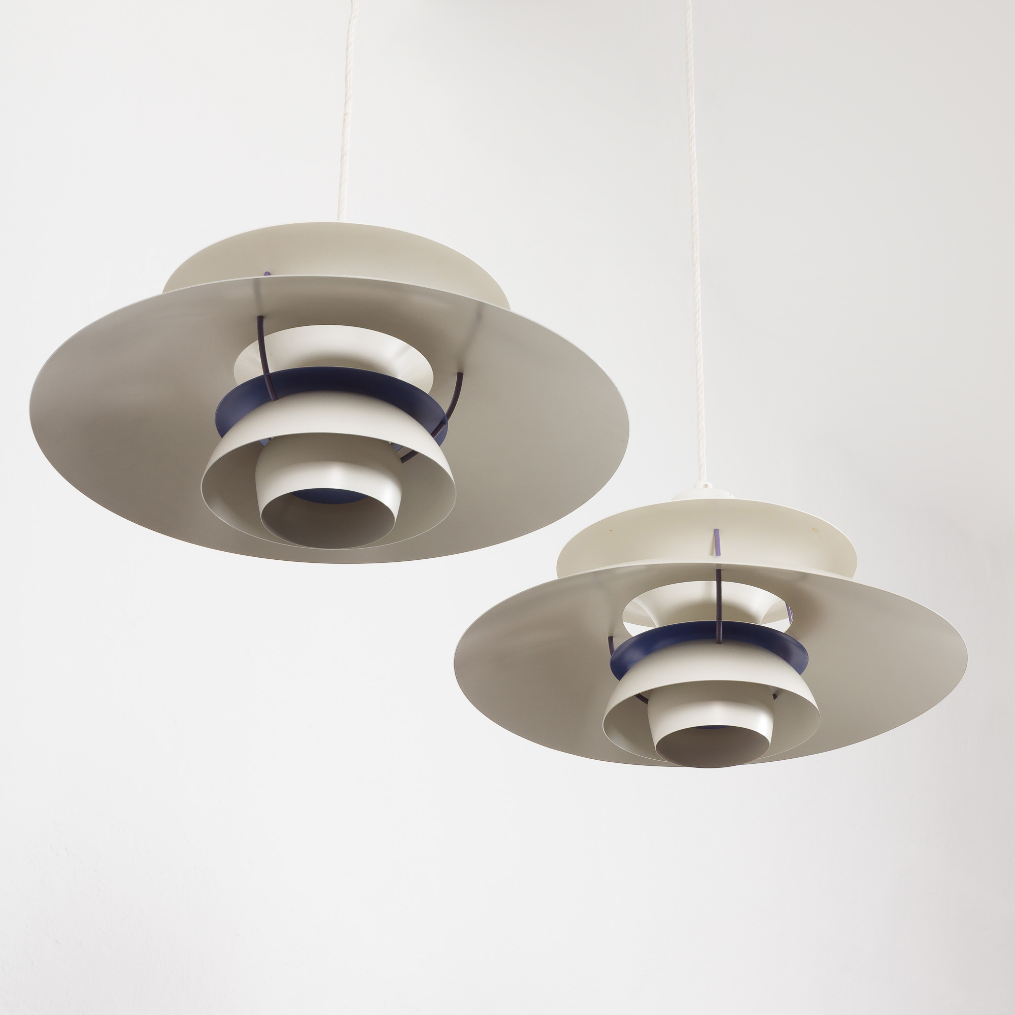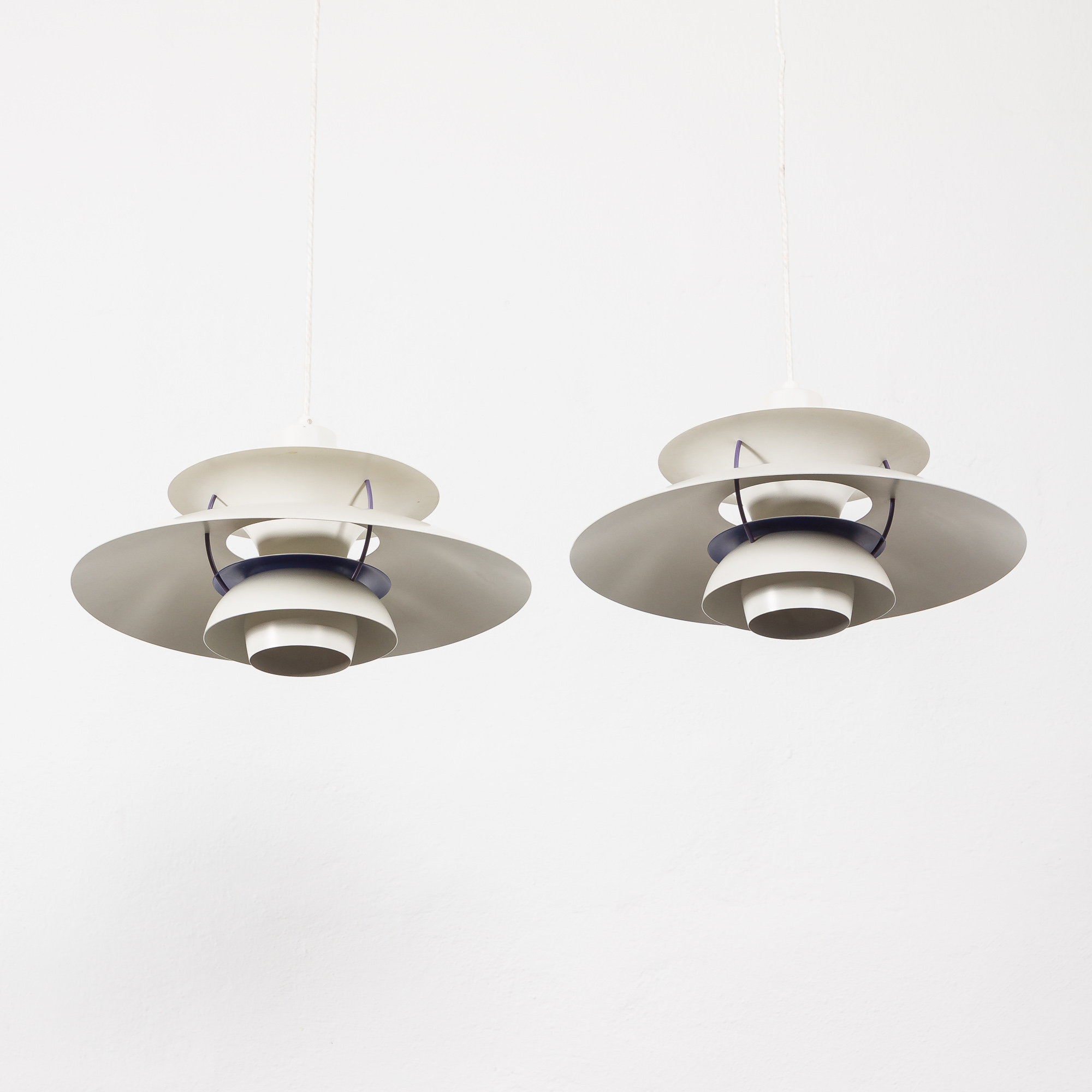 The set of two white PH5 lamps which is one of the most famous pendant lamp designs hailing from Denmark, created by architect Poul Henningsen for the lighting manufacturer Louis Poulsen. First introduced in 1958, the PH5 has since become an iconic piece of mid-century modern design. The purpose of the PH5 design was to provide glare-free lighting, achieved by the lampshade with several concentric shades working together to diffuse the light and prevent any harsh glare.