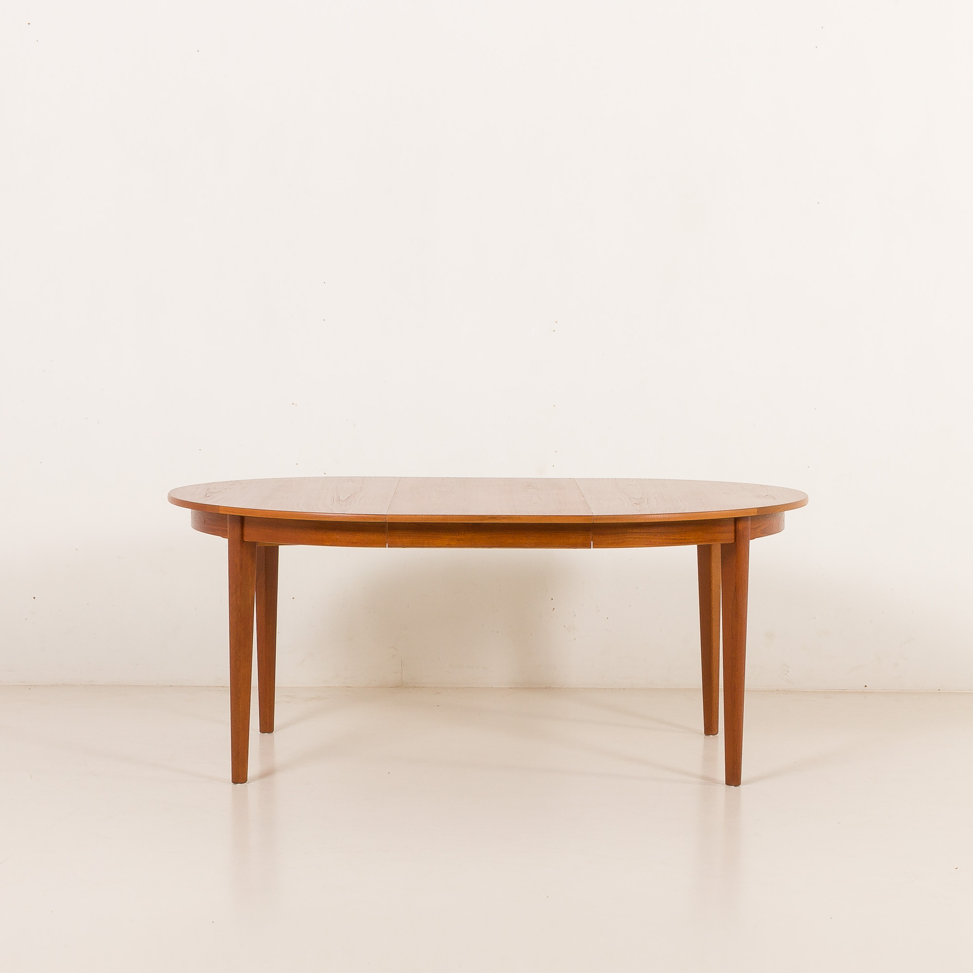 The table features a beautifully grained teak top with a warm tone and smooth finish, resting on solid teak legs with refined, minimalist proportions. It includes four additional leaves (each 50 cm wide), allowing the table to extend to the impressive 330 cm! Where one can comfortably sit 10 people. One of them has an apron, and the other does not. The extension mechanism operates smoothly, and there is a support leg that automatically unfolds when multiple extension leaves are in use.