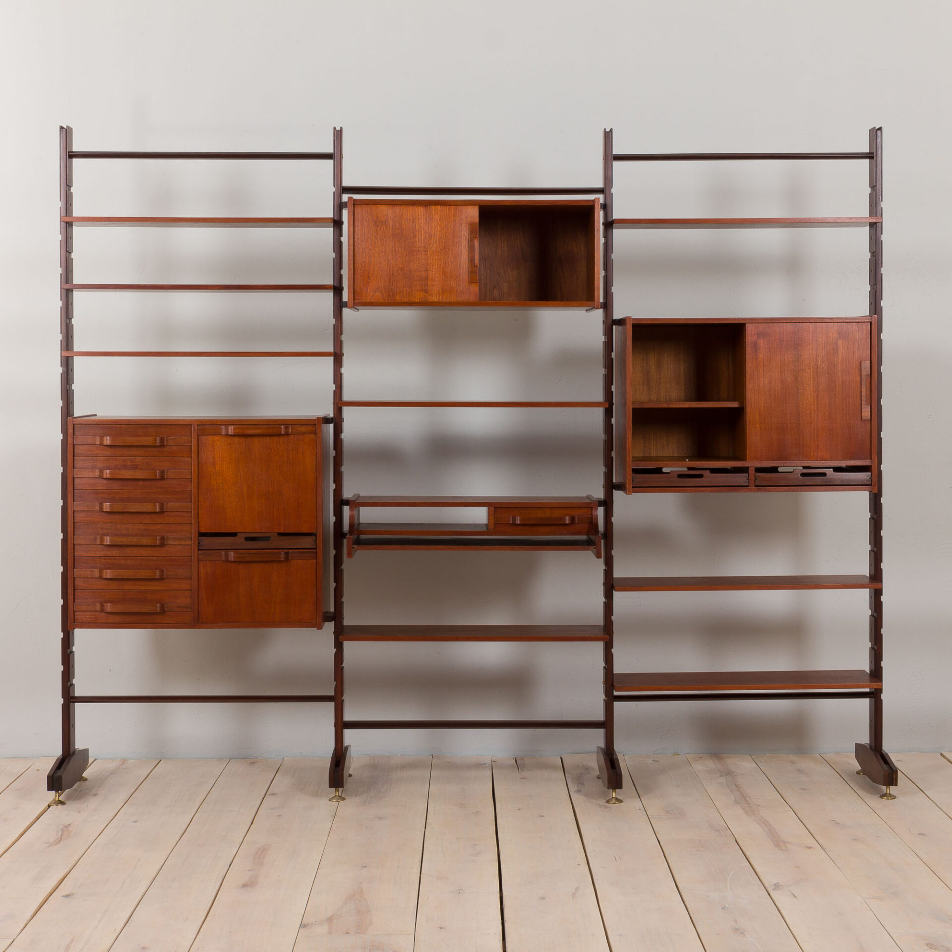 An extraordinary vintage teak wall unit designed by Ico Parisi in Italy in the end of the 50s. It is completely double-sided and can be a great separation of a part of the room or a very decorative and functional separation wall of a large room. Magnificent carpentry in teak wood with additions of black formica and brass details.