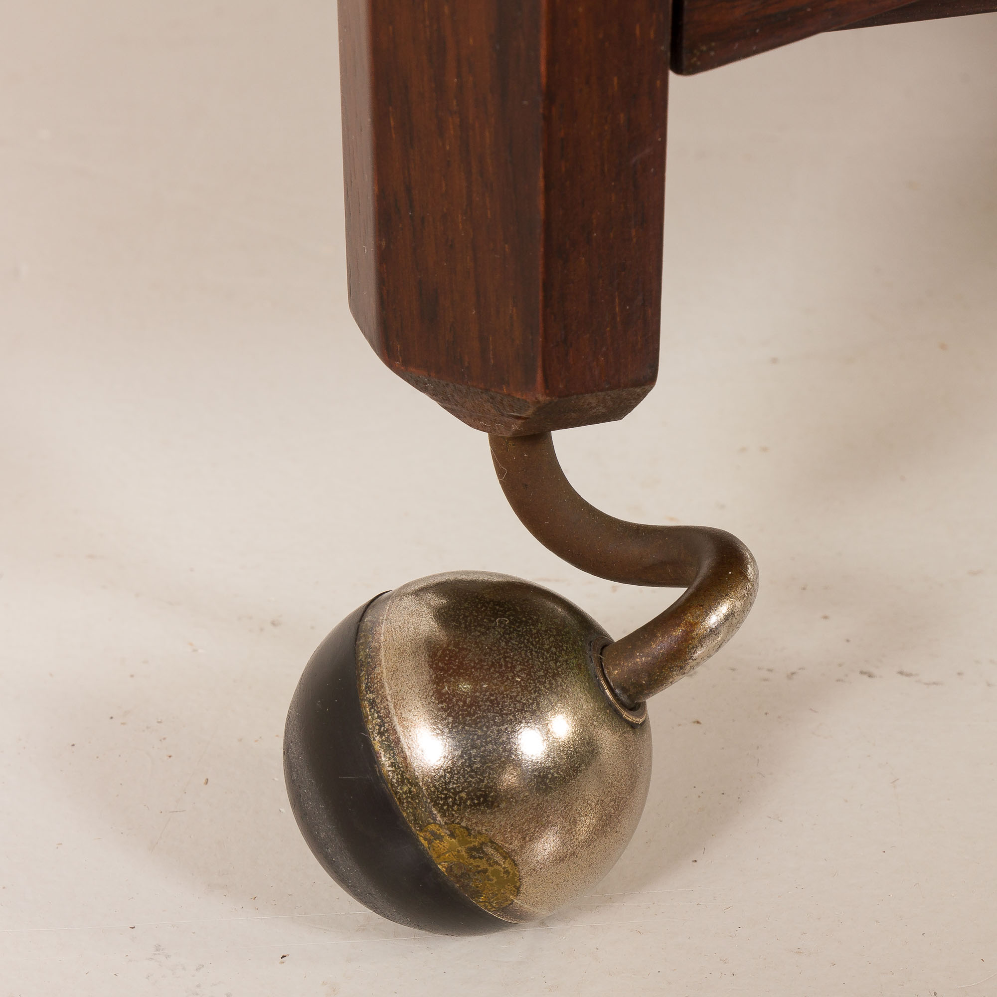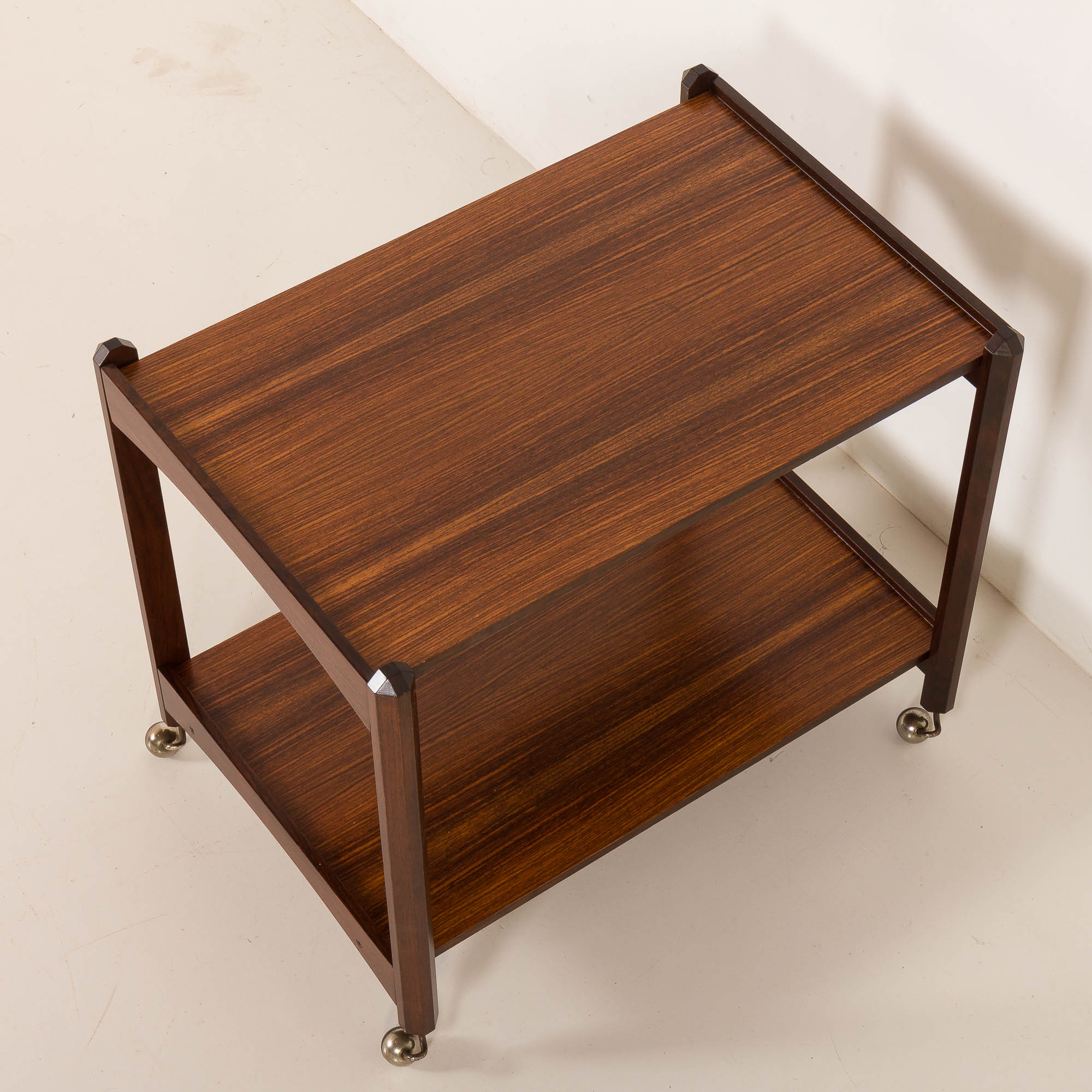 The trolley features a removable upper tray and beautifully executed corner joints—a subtle yet striking detail that highlights the quality of its construction. The cart stands on four funny, curved brass swivel casters, now with an attractive aged patina, allowing smooth mobility while adding vintage charm.