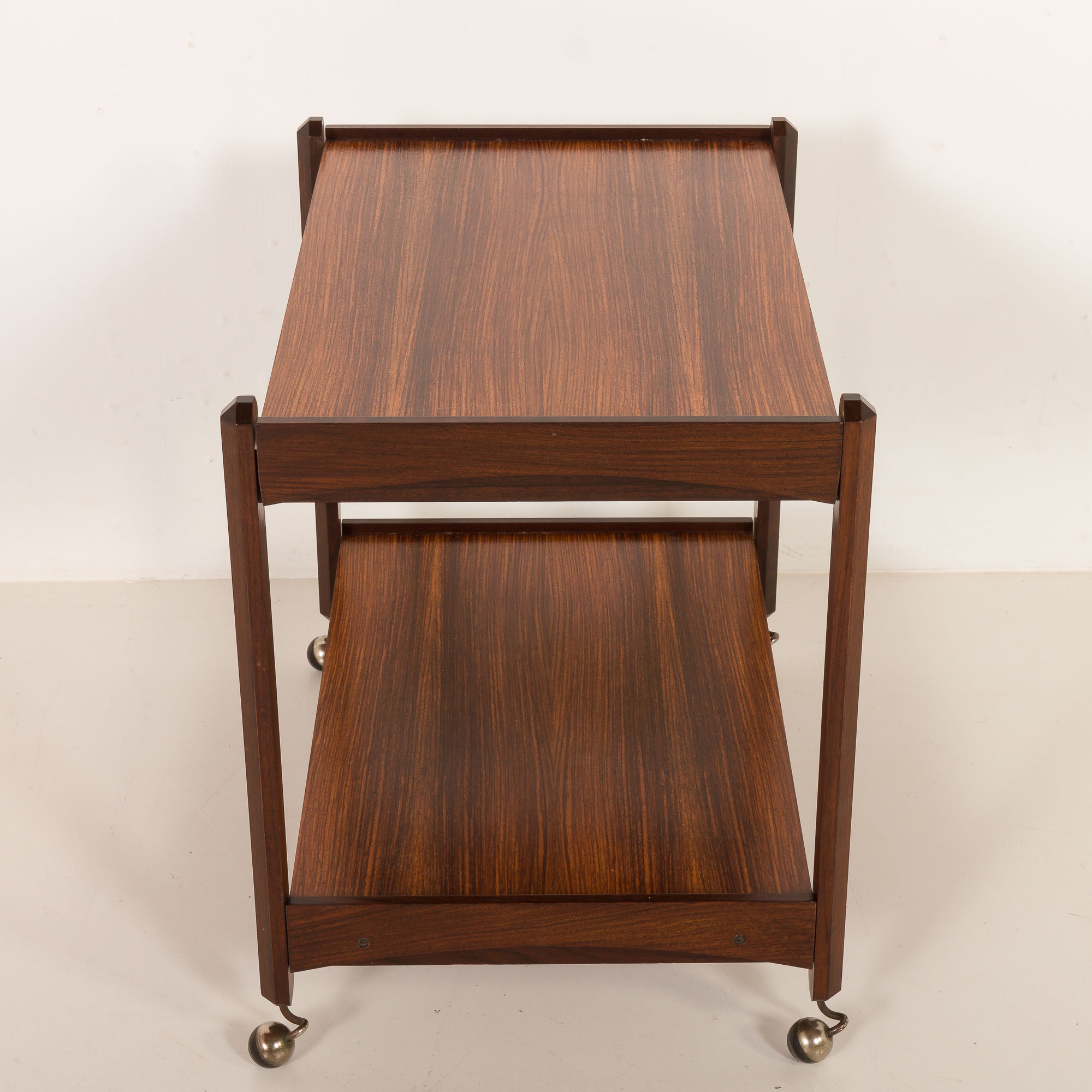 A perfect combination of practicality and sculptural elegance, this piece works beautifully as a serving trolley or as a decorative accent in a living or dining interior. The very sophisticated carpentry and the use of rosewood indicate one of the Italian designers, or at least a high-end manufacturer.