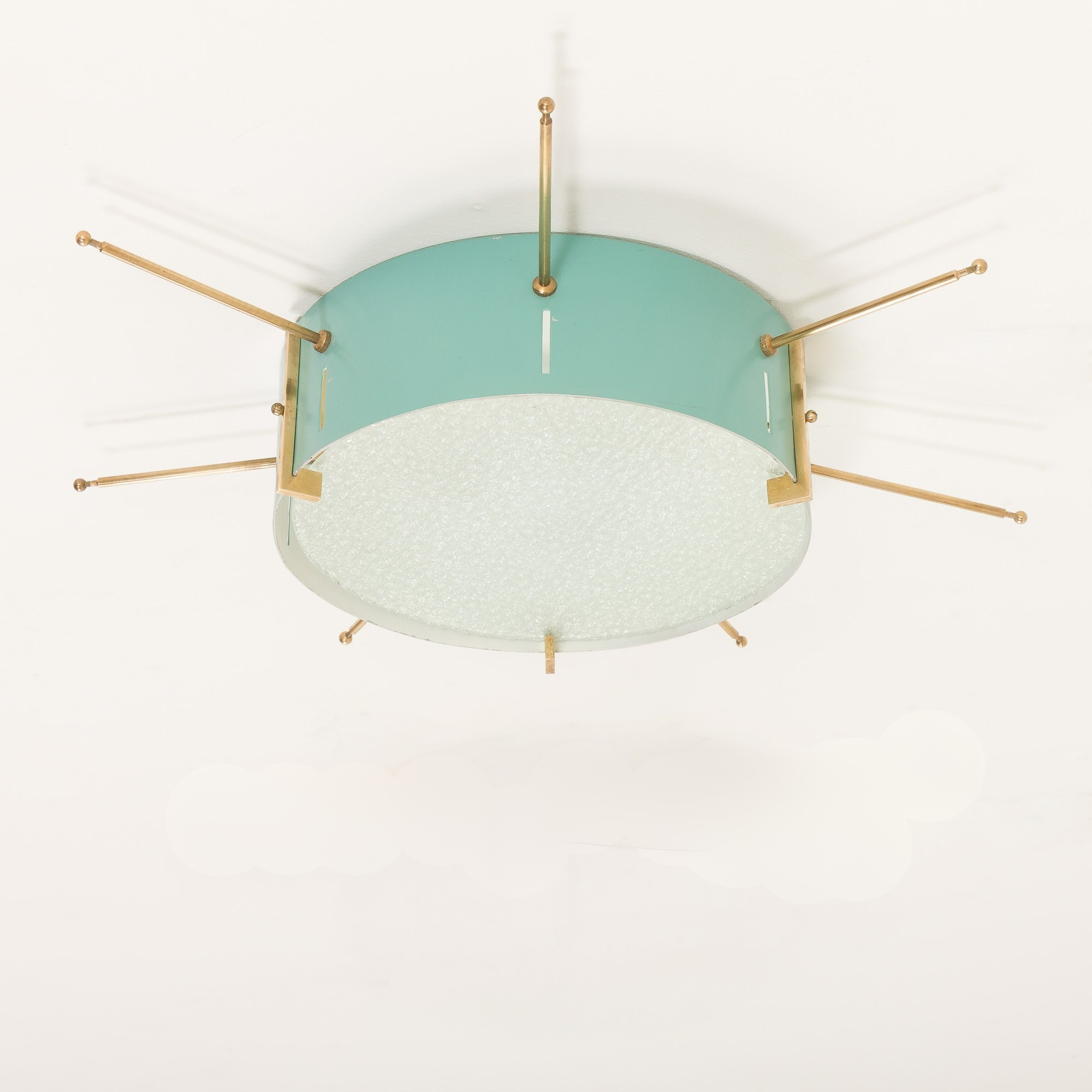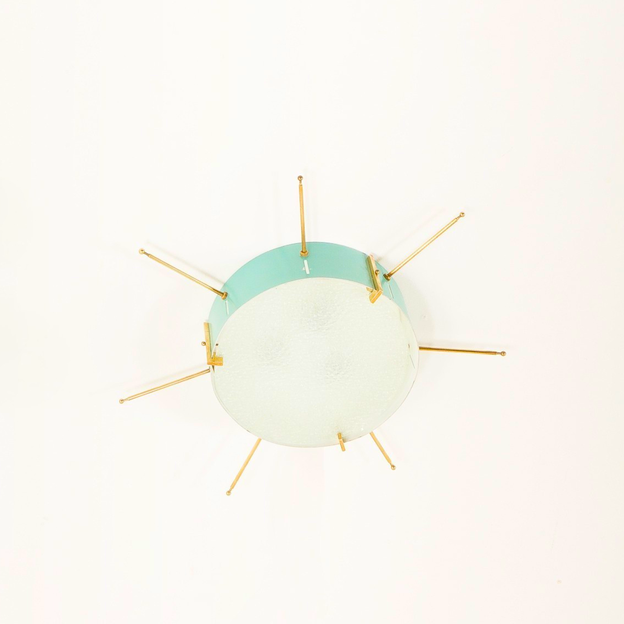 This rare mid-century ceiling lamp, created in the distinctive style of Gio Ponti, exemplifies the fusion of bold geometry and poetic fantasy. This sculptural fixture from the 1950s features a lacquered metal body in a matte turquoise finish, accented by radiating brass rods that form a sunburst-like composition.