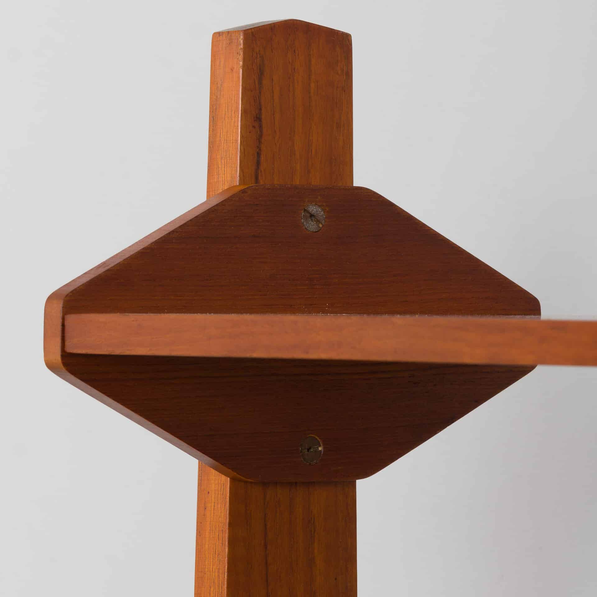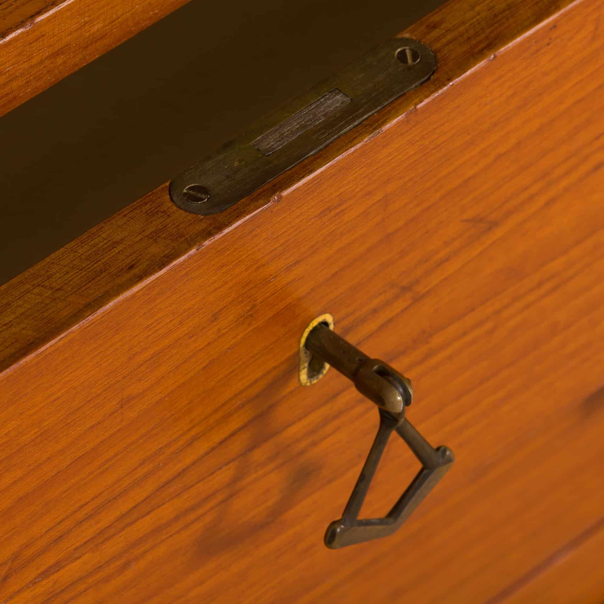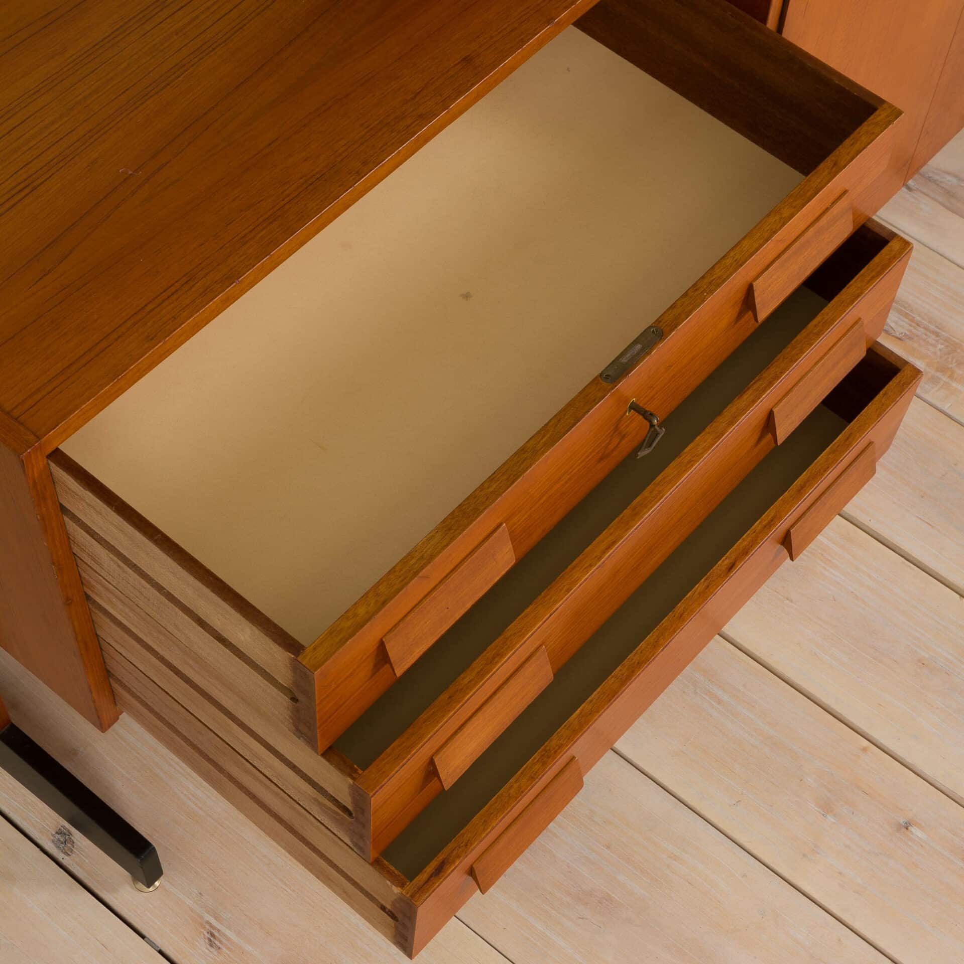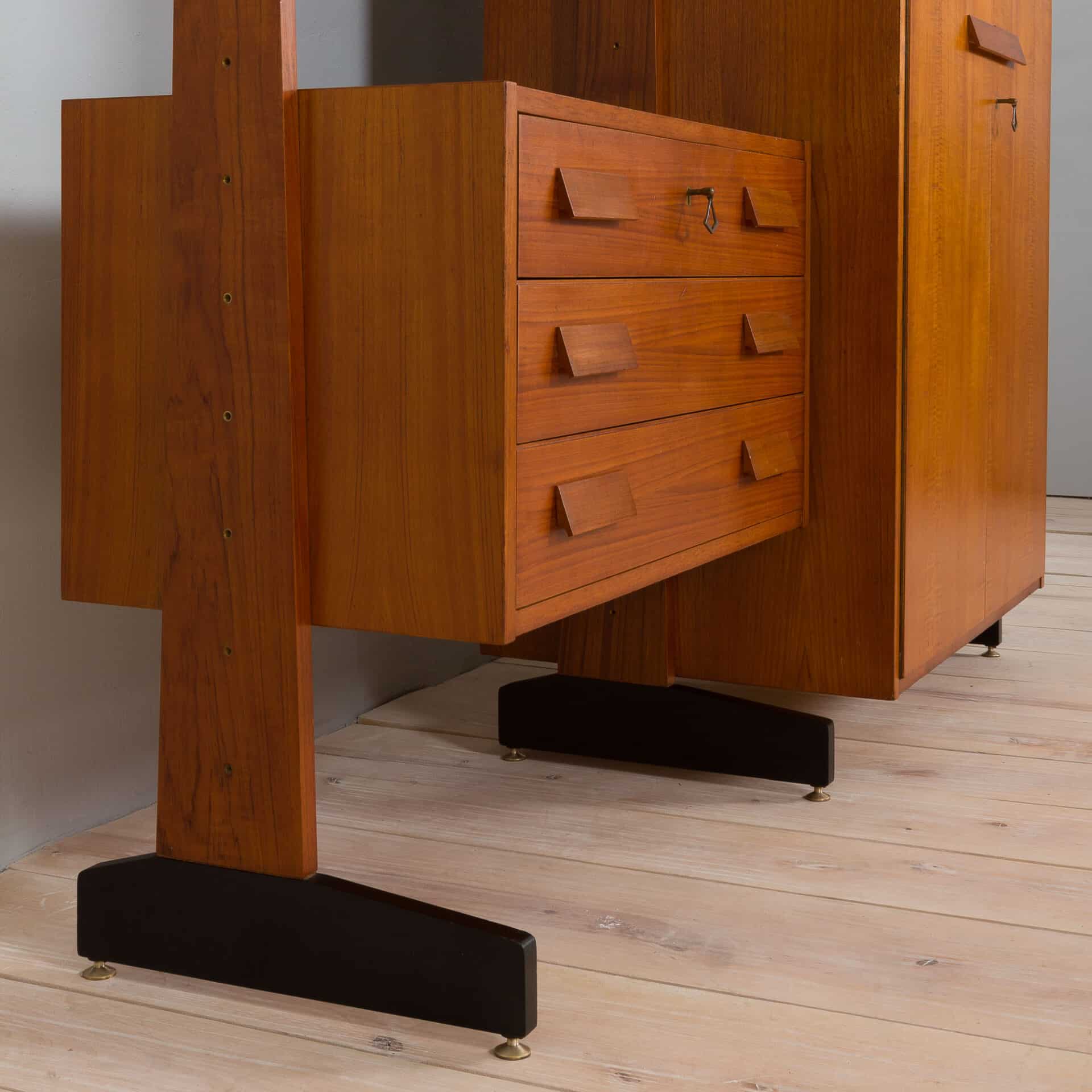 Italian free-standing two-bay wall unit comes from the 1960s. Designed in the manner of Vittorio Dassi , made out of teak veneer with nicely shaped geometrical solid wood handles. A spacious wardrobe and a top drawer of the chest are lockable with original decorative keys. Perfect Highlight for any midcentury modern bedroom or entryway!