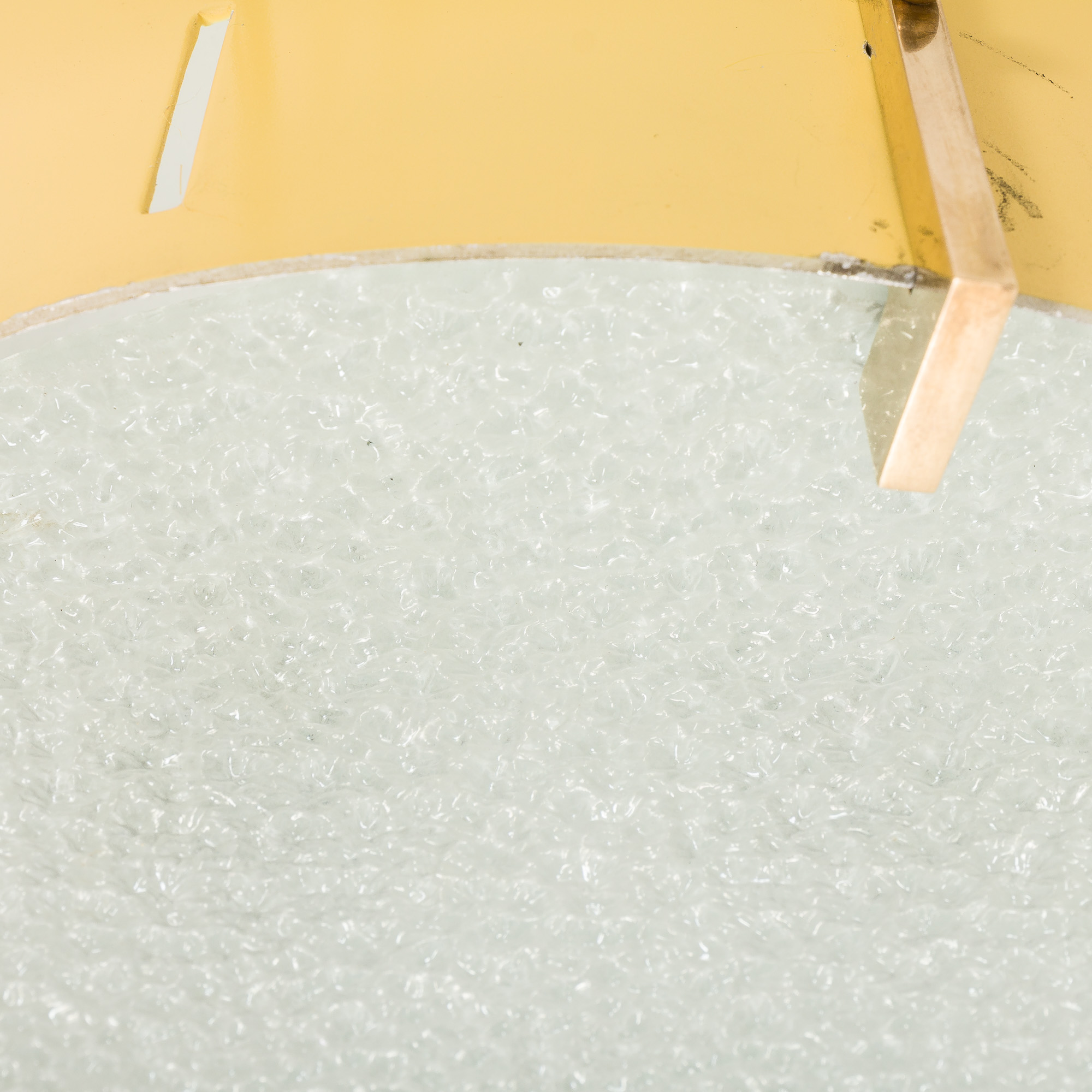 The diffuser is made of richly textured, matte Murano-style glass, delicately held in place by elegant brass brackets. The design reflects the optimism and experimental spirit of Italian modernism—an era when function evolved into form and lighting assumed a theatrical, architectural presence.