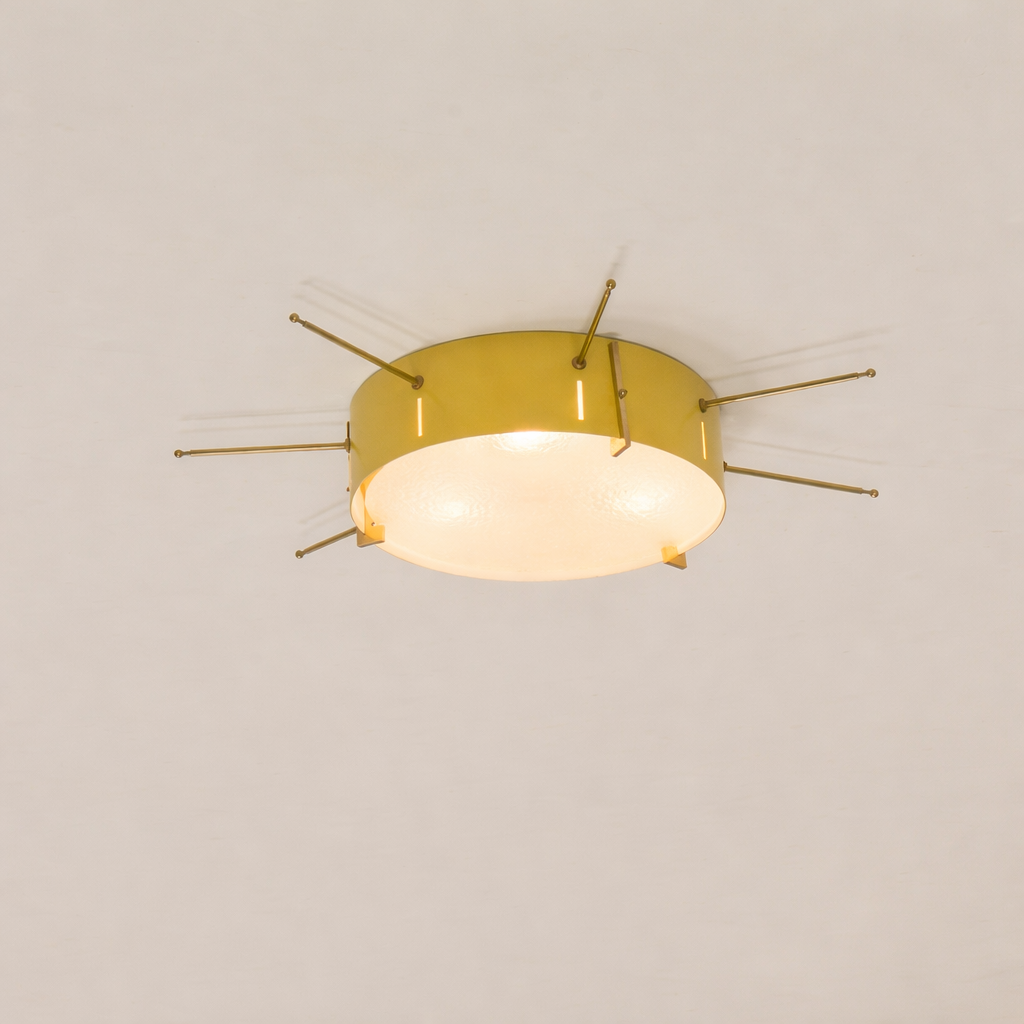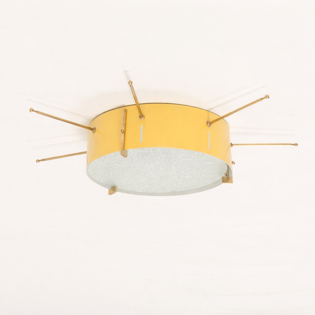 This rare mid-century ceiling lamp, created in the distinctive style of Gio Ponti, exemplifies the fusion of bold geometry and poetic fantasy. This sculptural fixture from the 1950s features a lacquered metal body in a matte yellow finish, accented by radiating brass rods that form a sunburst-like composition.