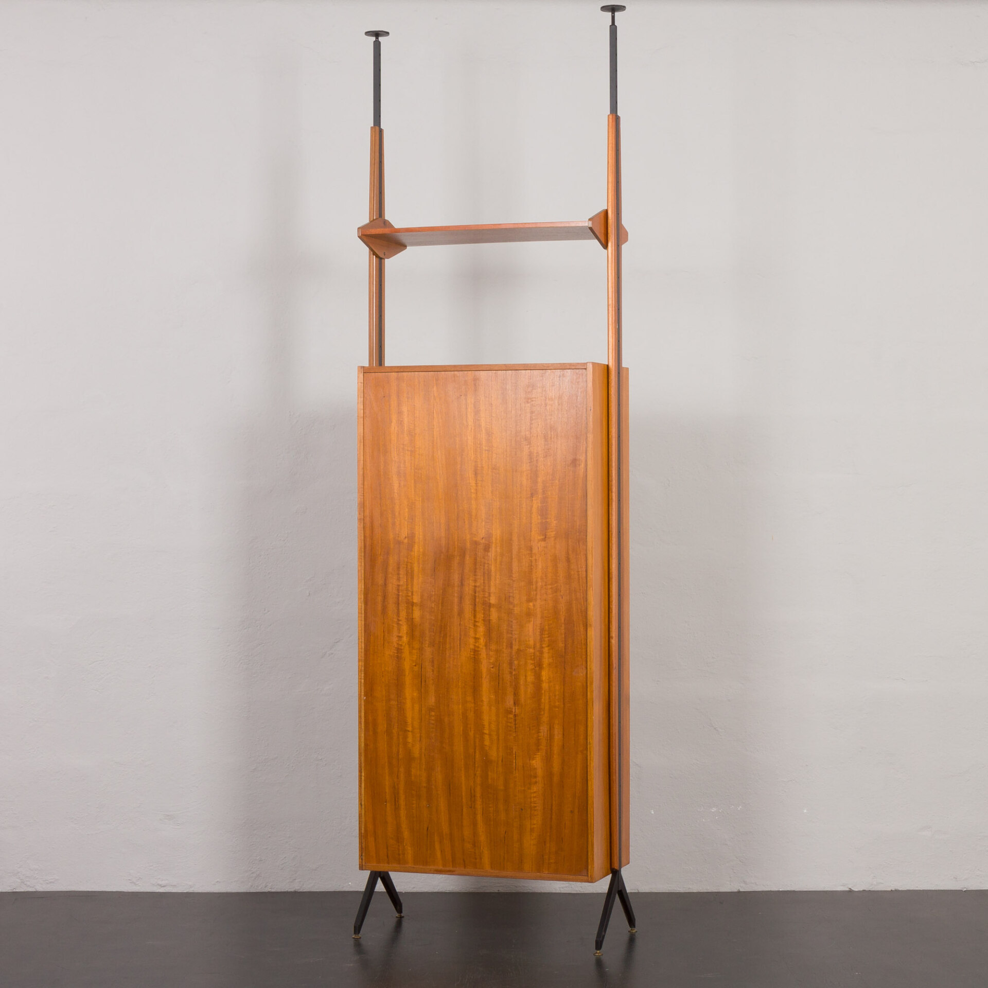 Italian mid century freestanding floor to ceiling wall unit in two independent sections was manufactured in the 60s, closely reminding the style of Franco Albini’s design for Poggi from the same period. The wooden construction is veneered in teak, even on the backside, which makes it a perfect room divider. It is accented with solid teak sculptural geometric handles and brass details. The piece is mounted with pressure rails between the floor and the ceiling, and its total height is adjustable to fit any room height between 267 and 385 cm, thanks to an extendable screw. It comes with adjustable brass feet, ensuring stability on uneven floors.