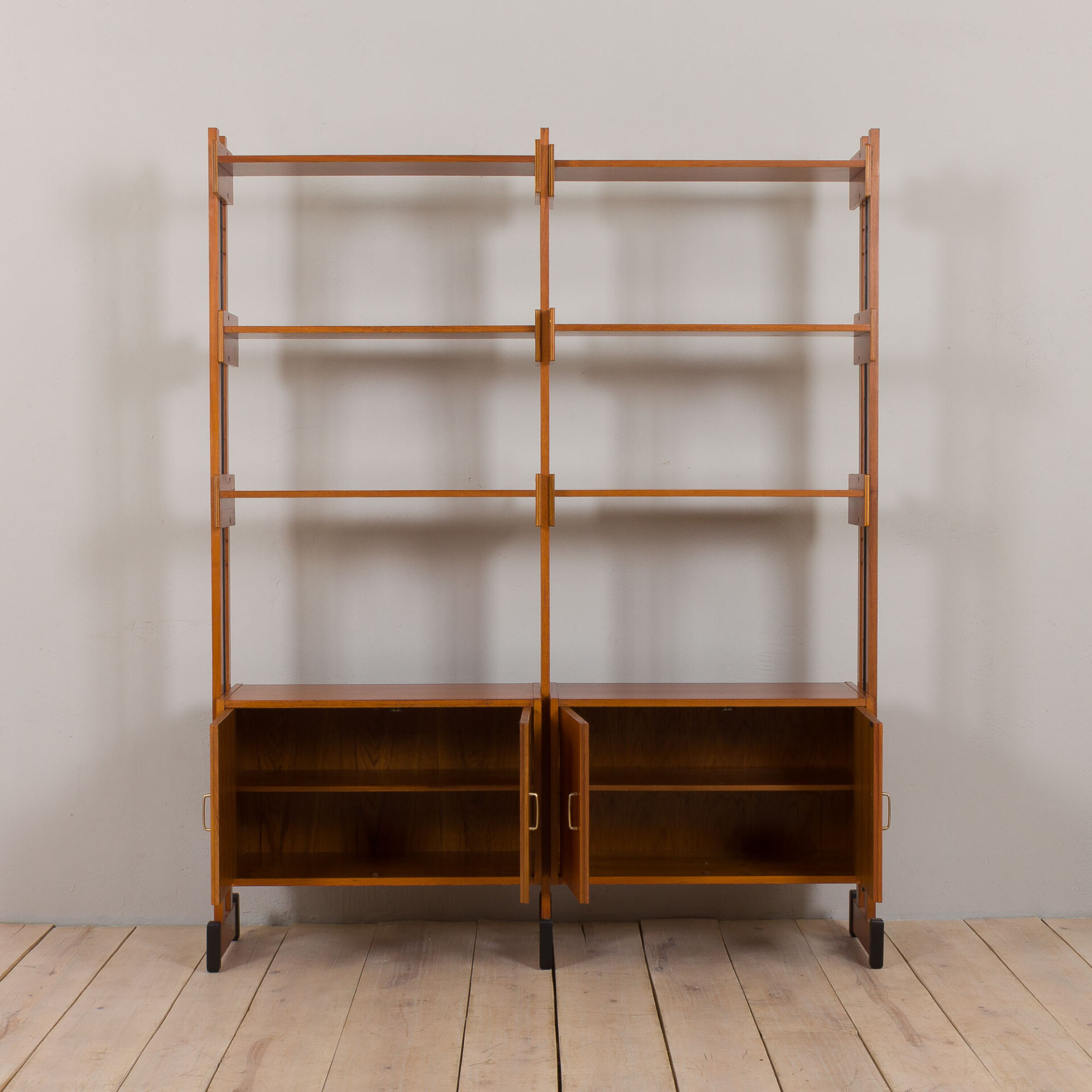 The bookcase features six adjustable shelves and two cabinets nicely profiled solid brass handles. This Italian wall unit is a stunning highlight for any midcentury modern space.