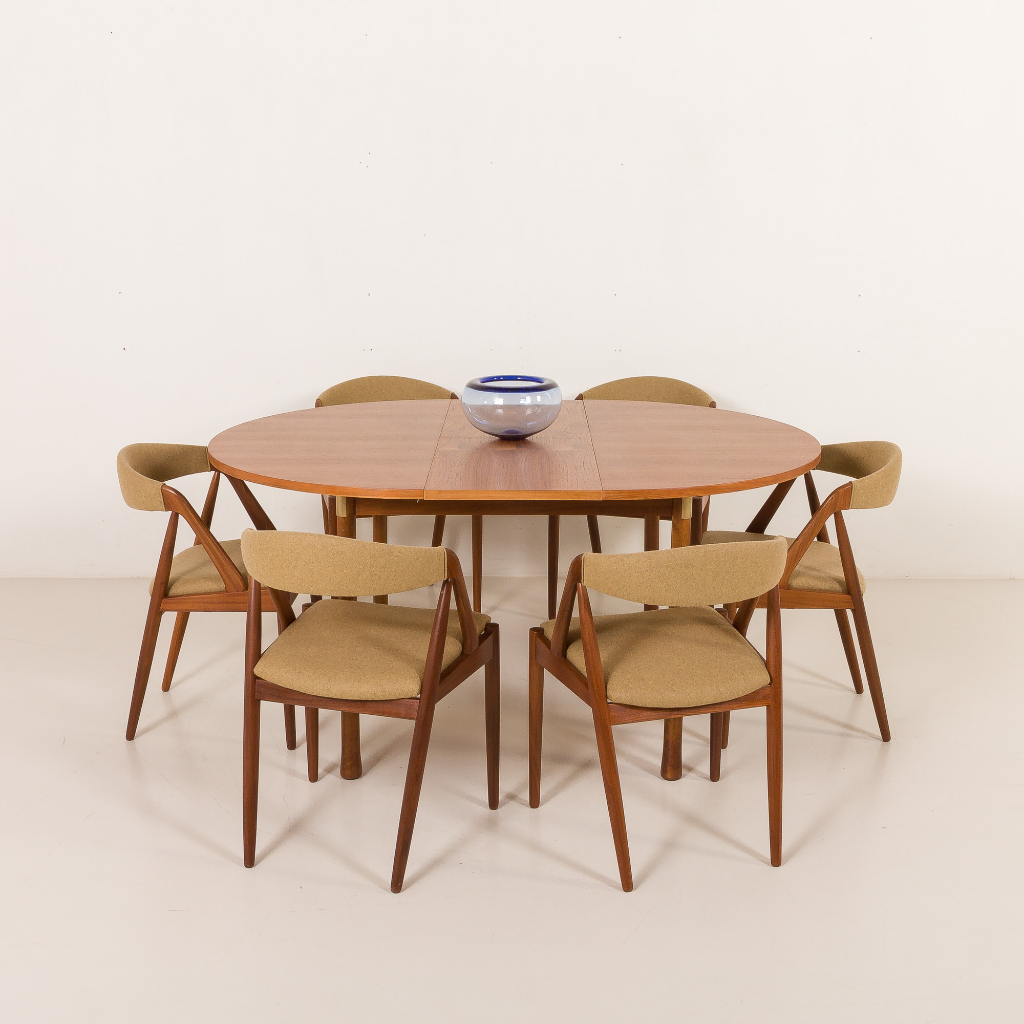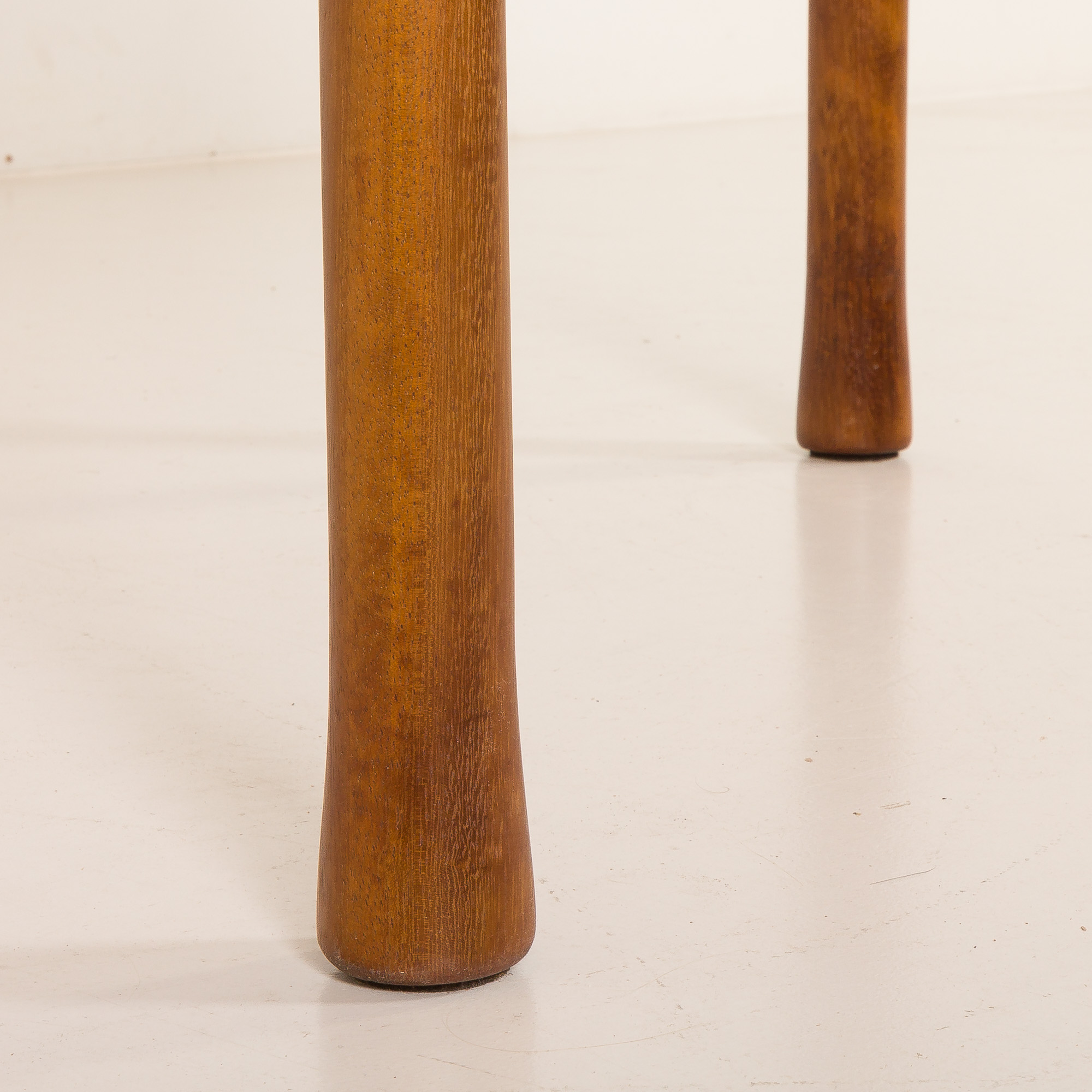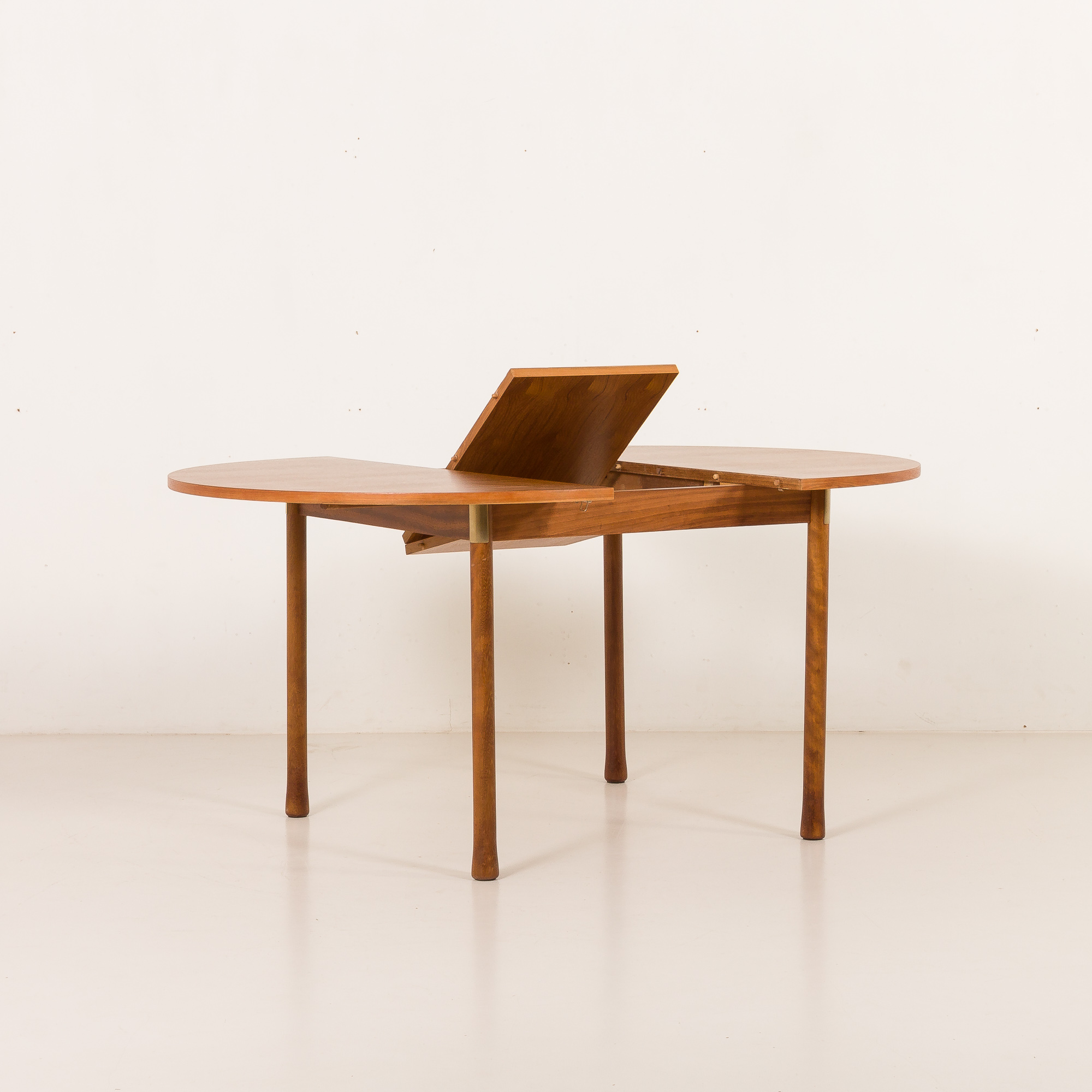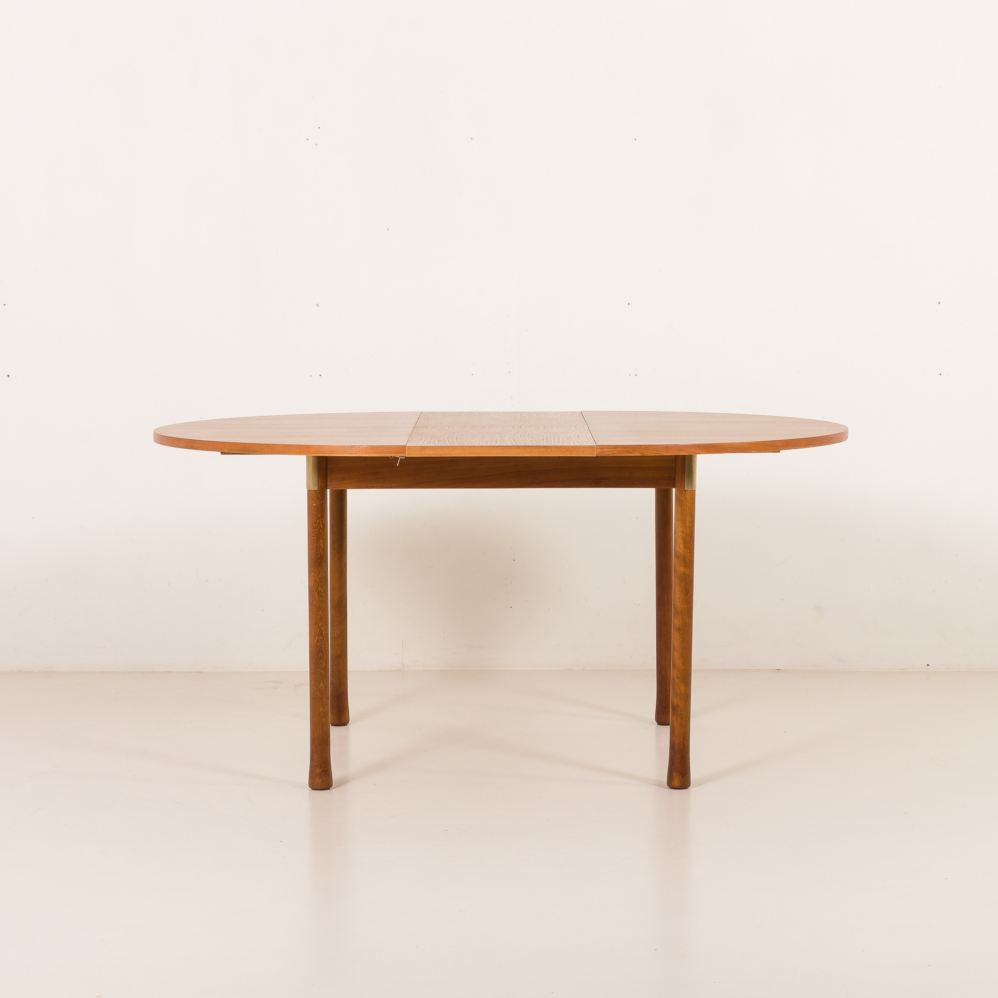 The table is crafted from teak, and the tabletop is covered with teak veneer, showcasing beautifully patterned veneer that highlights the natural beauty of the material. The table has one inner folded leaf. The extended table creates a beautiful oval shape and can be comfortably used by 6 people. The inner leaf is in slightly different veneer with grain facing in the opposite direction. A unique detail is the legs decorated with brass at the top and widening at the bottom.