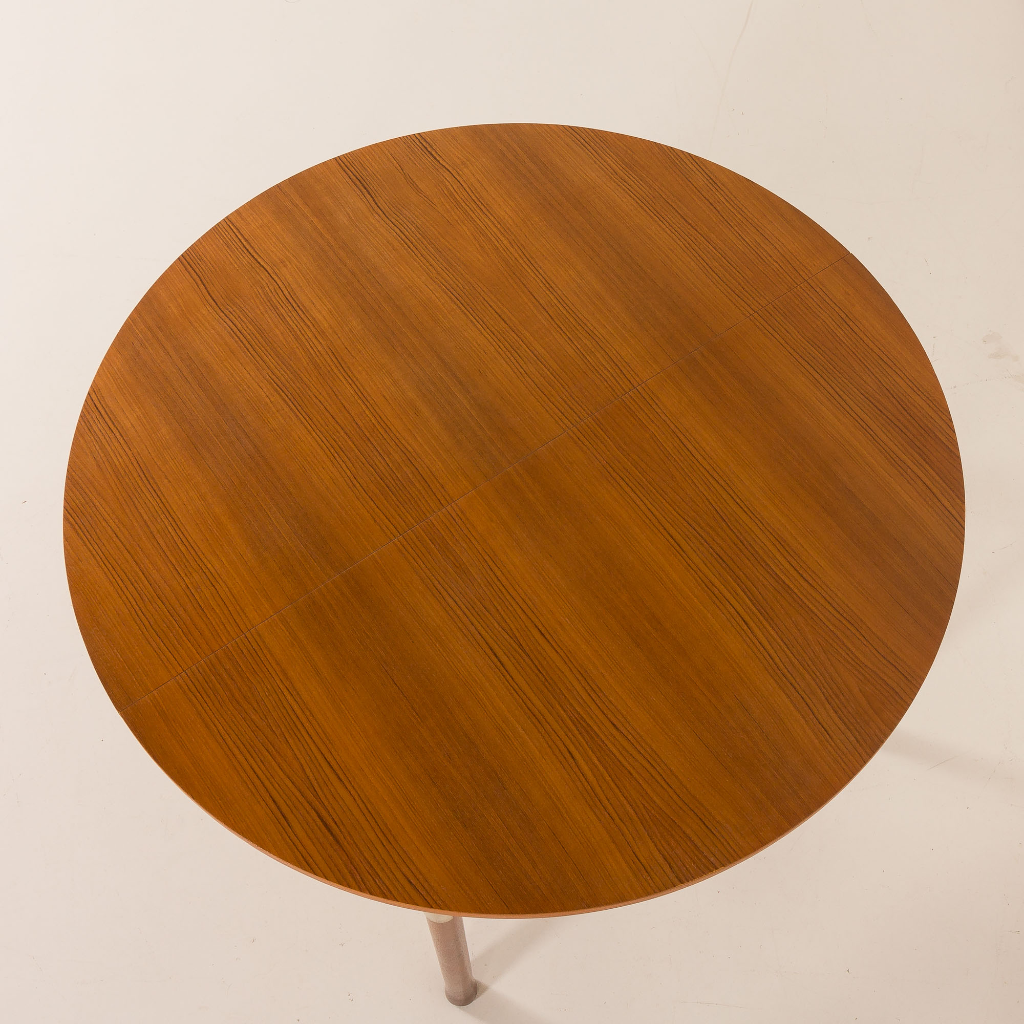 This vintage Italian mid-century round extension teak table was made some time in the late 1960s or early 1970s.