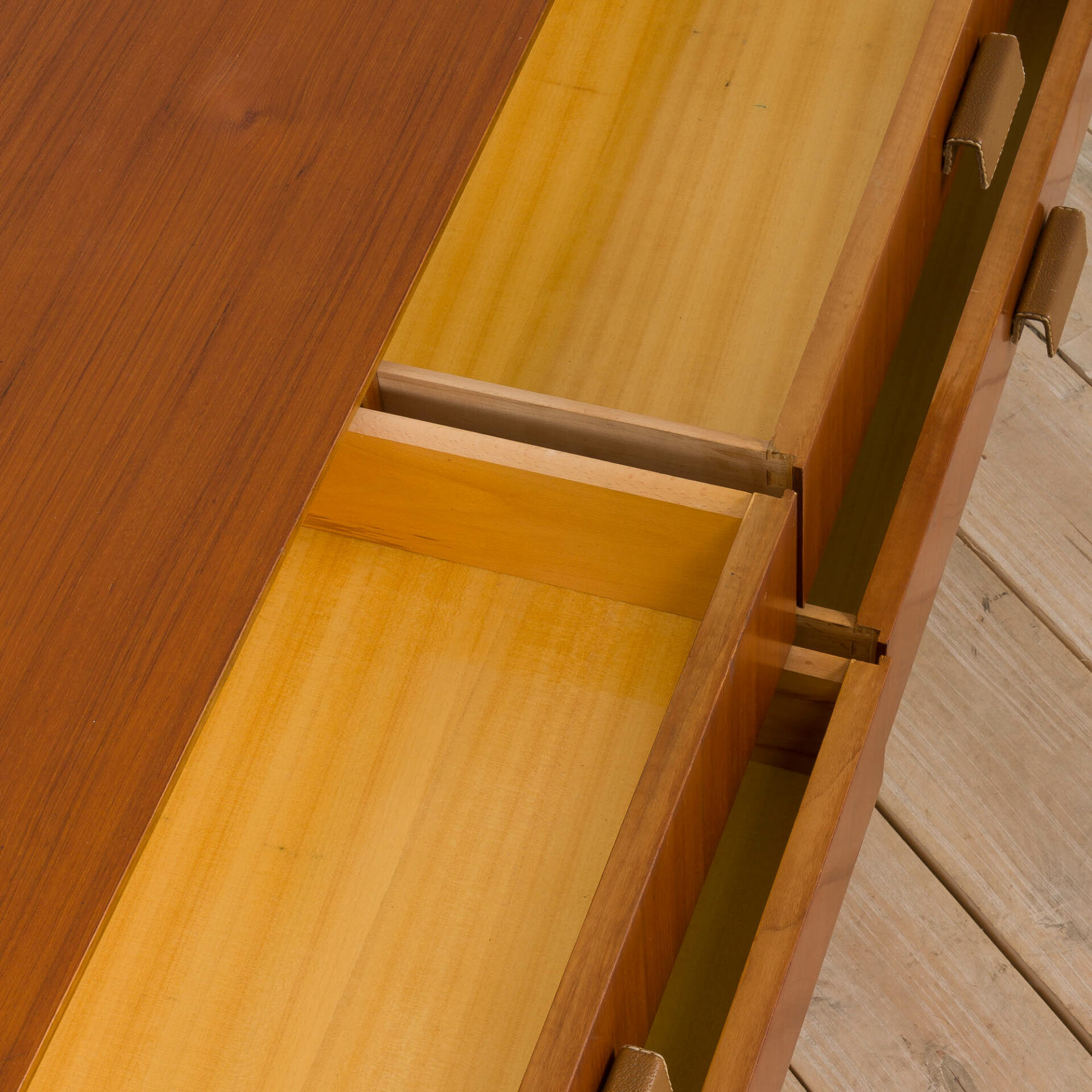 This teak mid-century sideboard comes from Italy from the 1960s. It features four deep drawers with original light beige leather handles. Symmetrical wide drawers and long slender legs give the piece of furniture a unique minimalist look that would fit perfectly to any modern interior. Overall original vintage condition with minor signs of use on the top, including a light stain. Other than this, normal time-related wear.