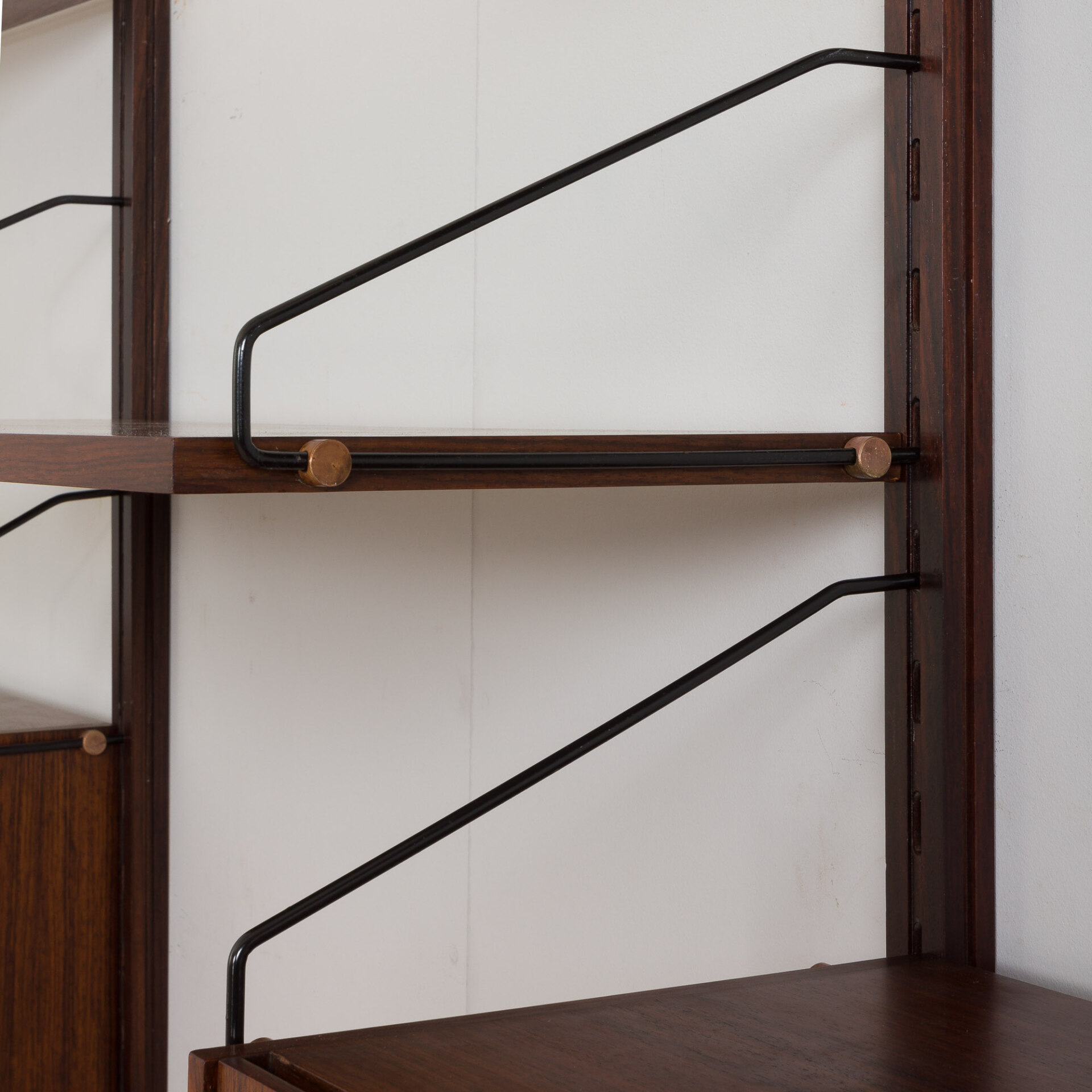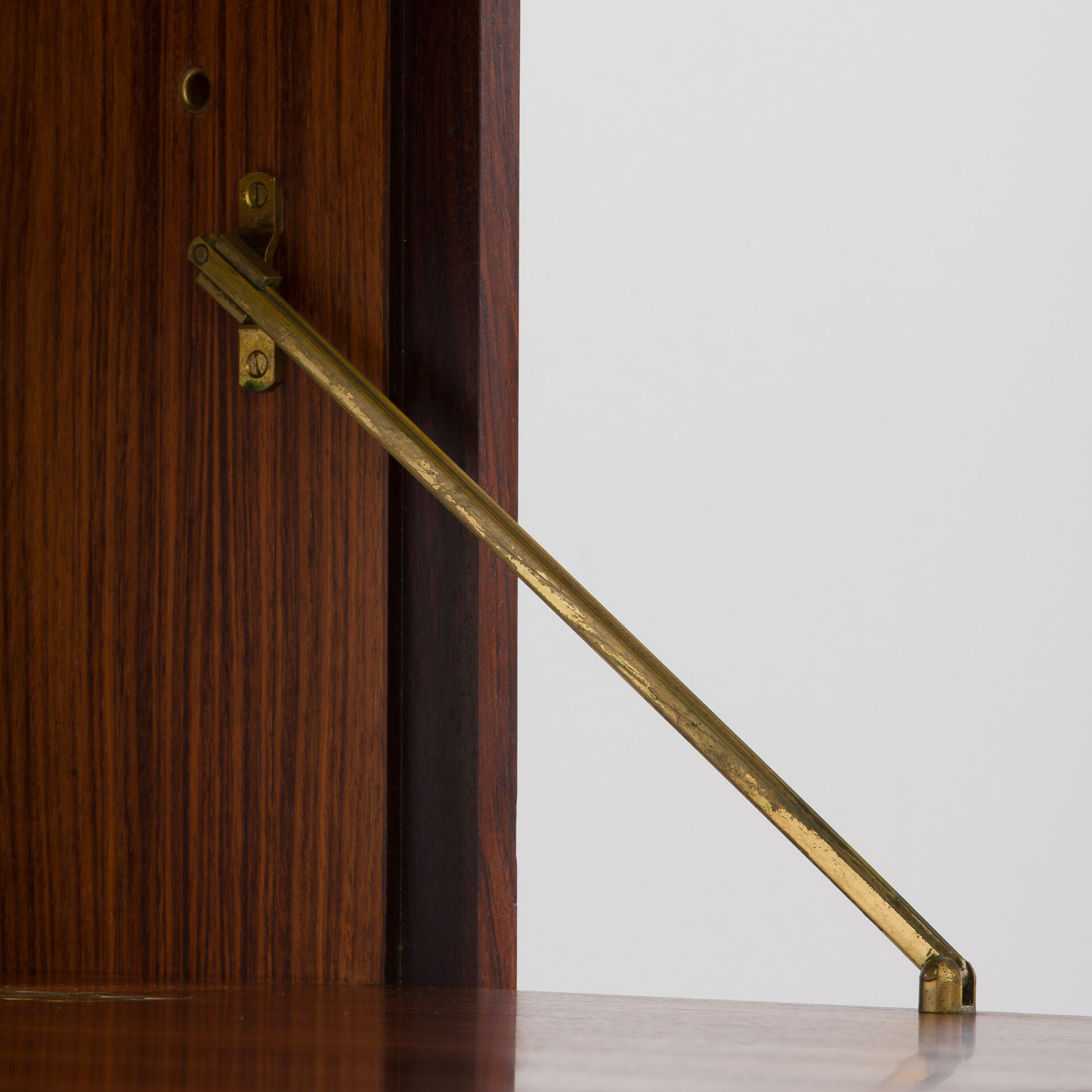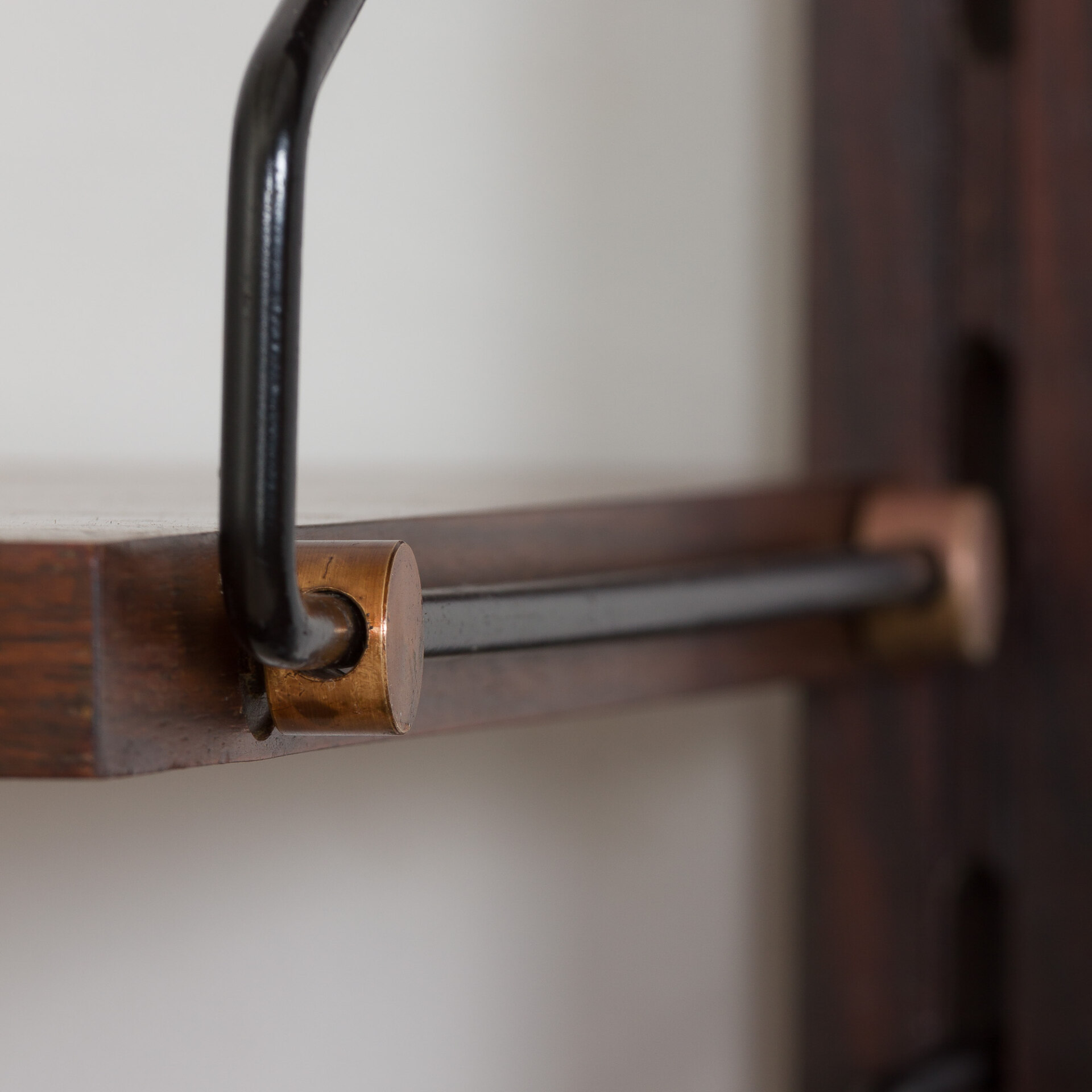 Simple, yet elegant, Italian rosewood wall unit designed in the 60s. This very stylish and functional shelving system of three sections features three cabinets and five shelves of various depth. All components are described in detail below.