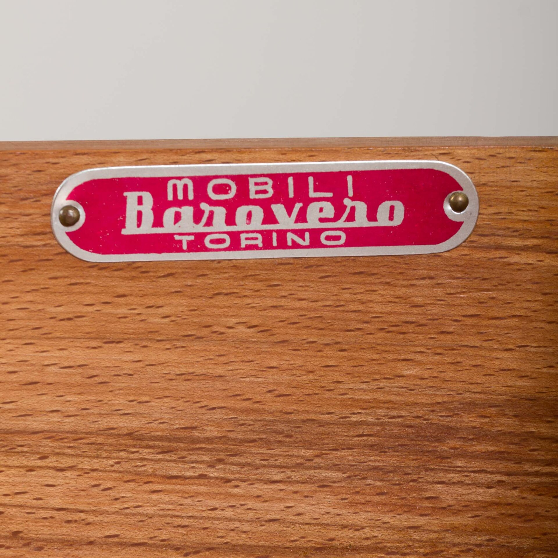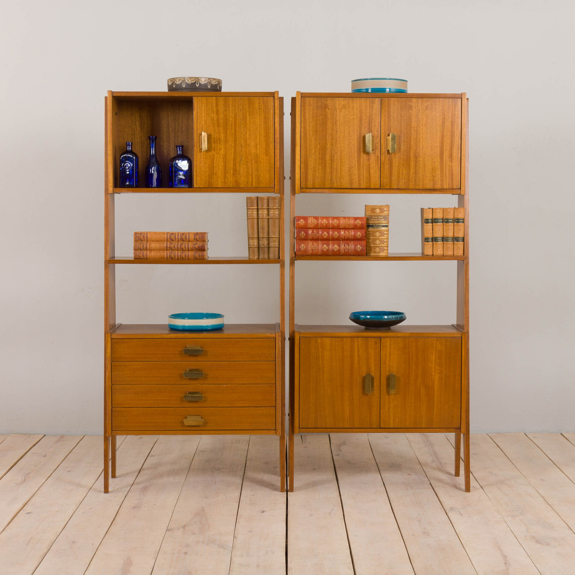 An Italian set of two freestanding wall units made in light mahogany manufactured in the 1970s by Italian Mobili Barovero in Turin, validated by the original label preserved. The set consists of two independent modules that can stand together or completely independent. The back side is also veneered, which makes it the perfect room divider. Very good original condition with minor signs of use.