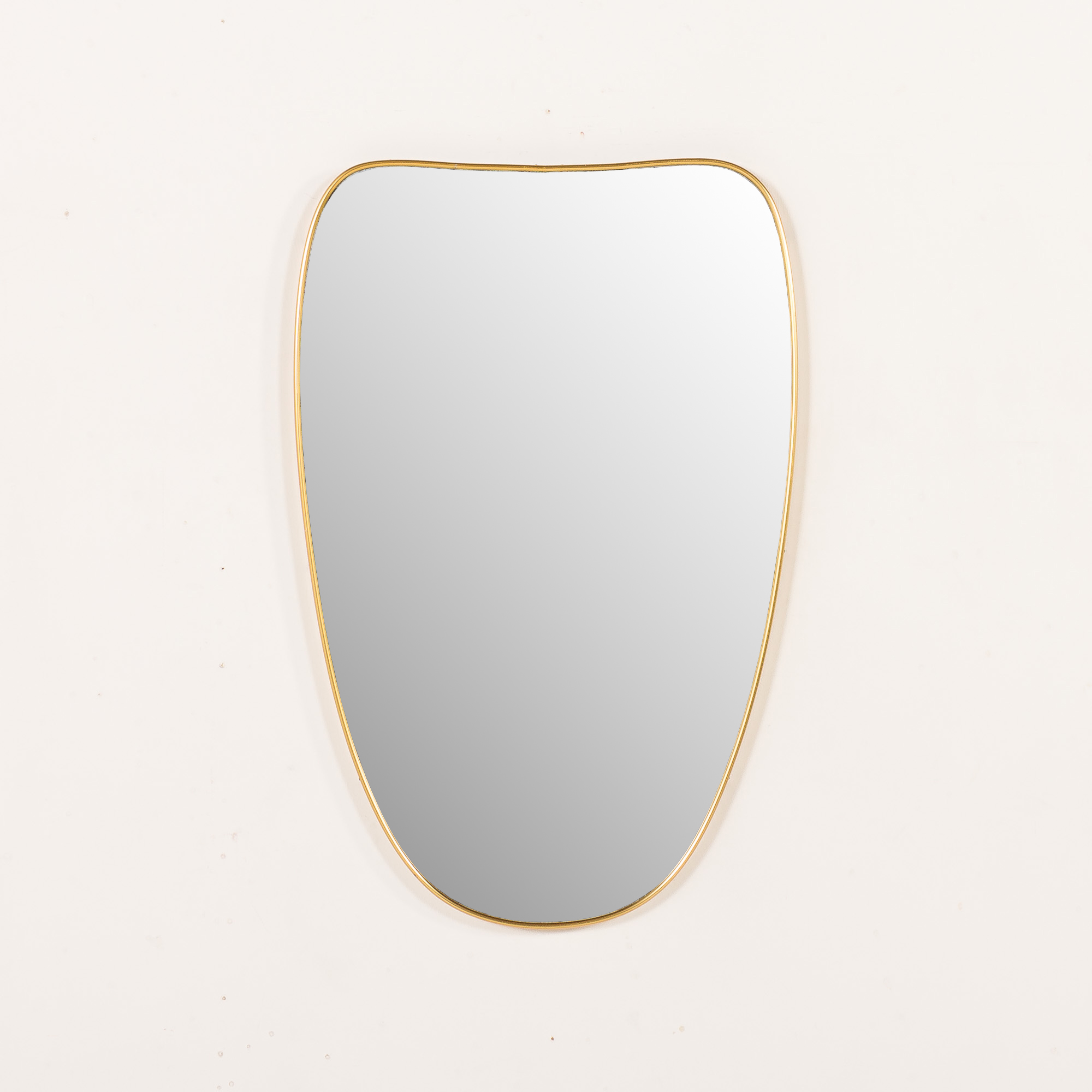 The mirror is in solid brass frame with organic lines that emphasize the natural beauty of the material. The minimalist form allows the mirror to be a great addition for any modern or mid-century inspired interiors. Perfect for a bathroom, living room or a hall way.