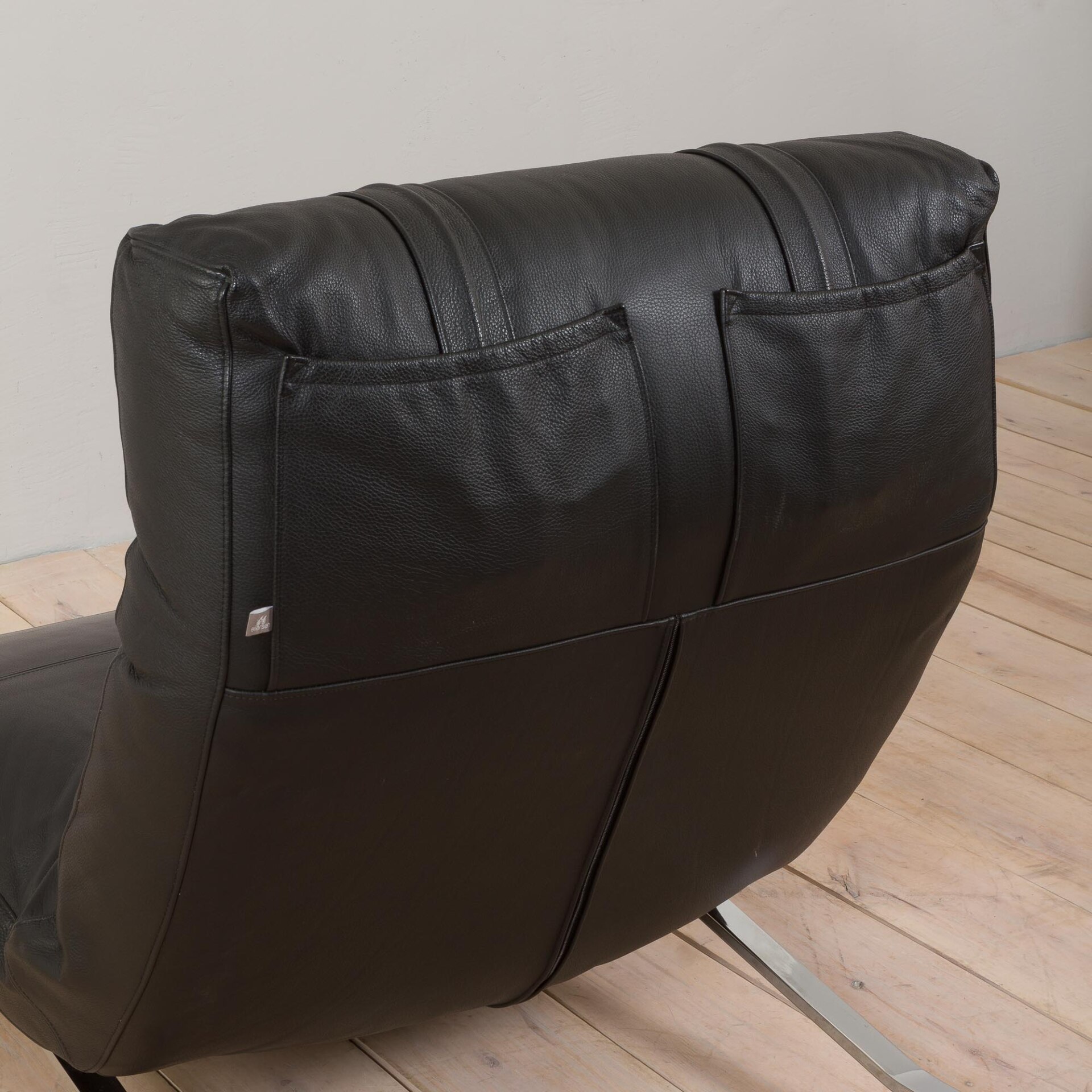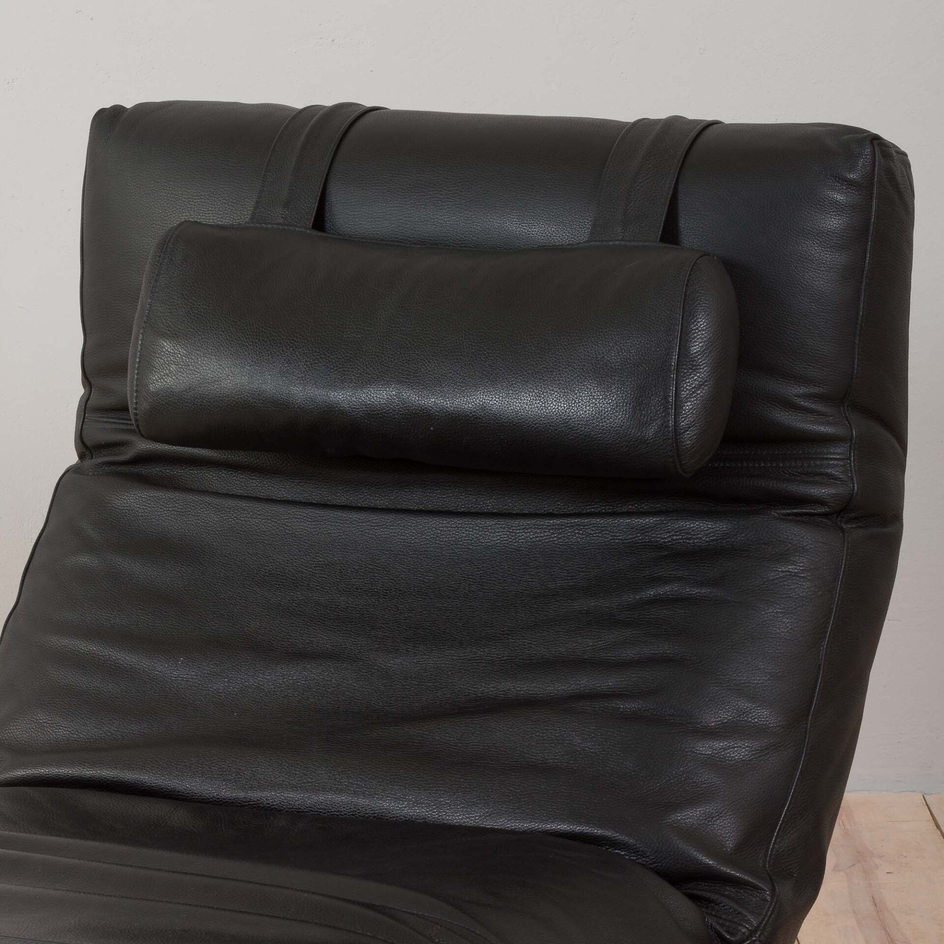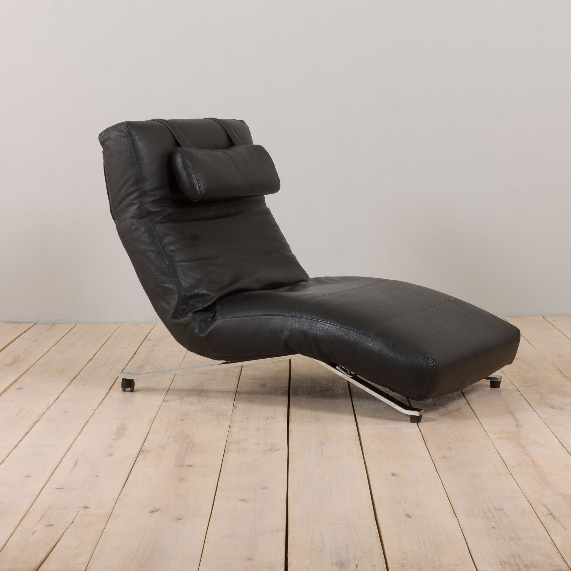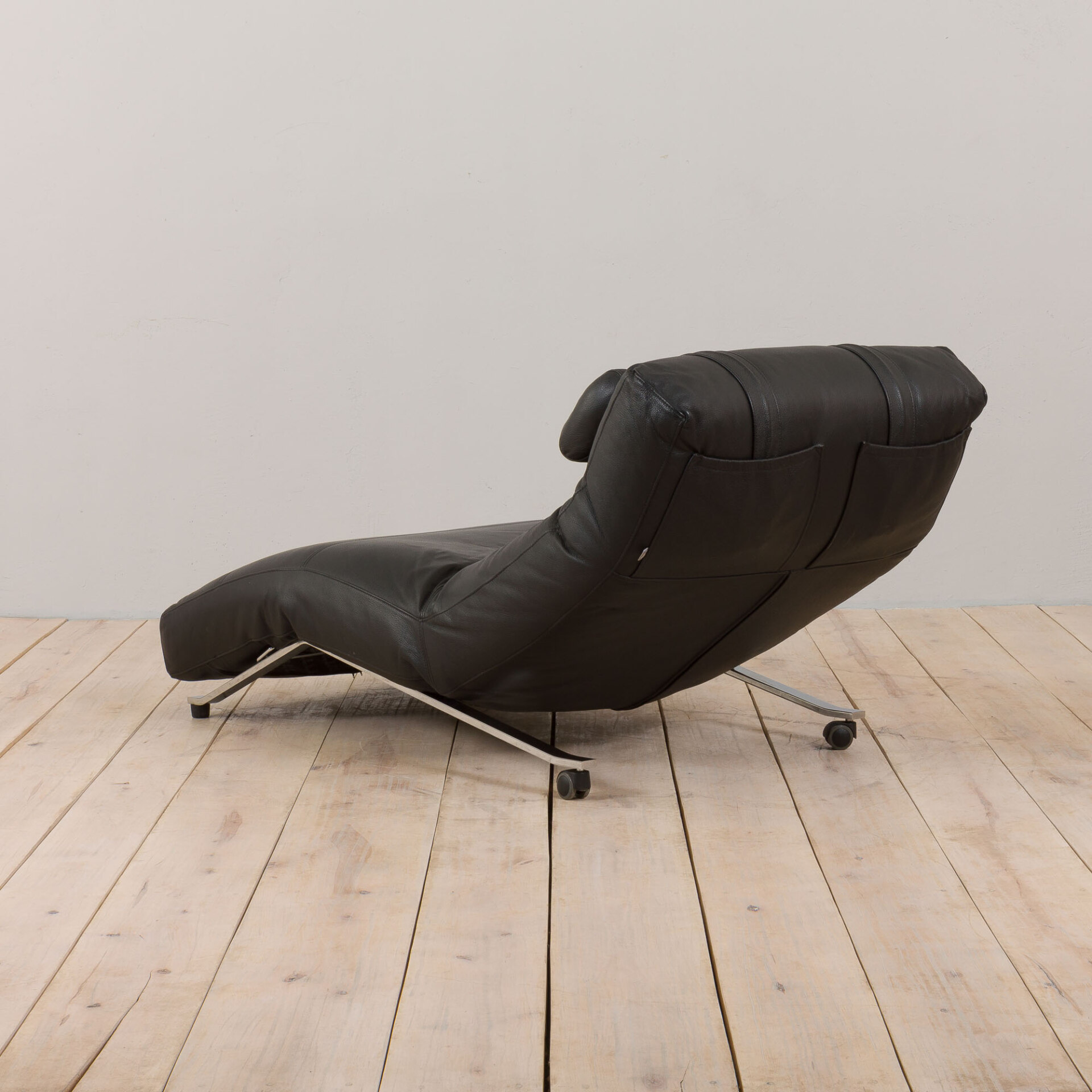 Jens Juul Eilersen daybed, known as “Control”, is a classic example of Danish design from the 1980s. The manufacturer’s linen and label validate the origin. The daybed features a sleek and minimalist design, with clean lines and a low profile that create a sense of understated elegance. It is the ultimate reclining chaise longue and offers several different positions, whether one is sitting or lying down. The Control daybed features four independent sections, which give the chair an unusually flexible anatomy. Neck and foot support can be modified with two positions, and there is a backrest that can vary the sitting and lying positions. On the back of the daybed are two pockets, the perfect place to store favorite magazines, newspapers, and iPad. The black high-quality leather upholstery is supple and soft, adding a touch of luxury and comfort to the piece. The chrome base provides a stable foundation for the daybed while also adding a modern and industrial taste.
