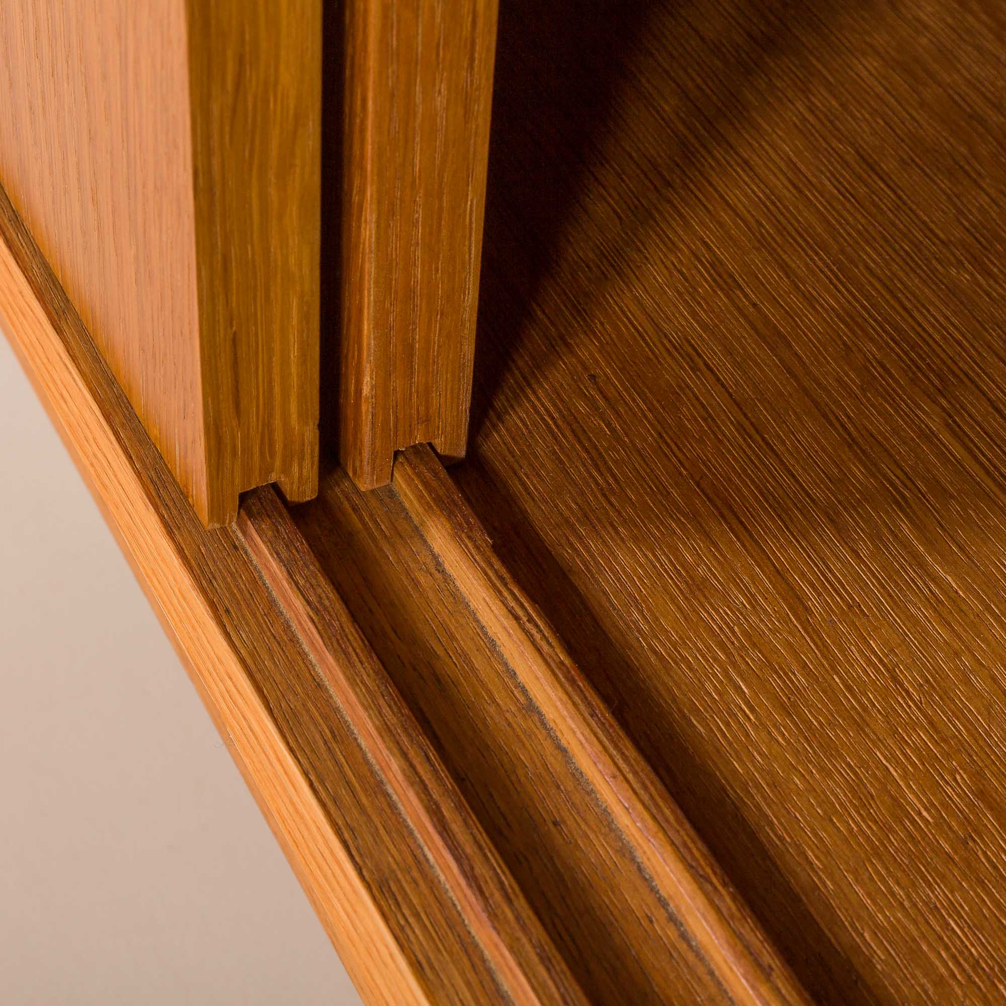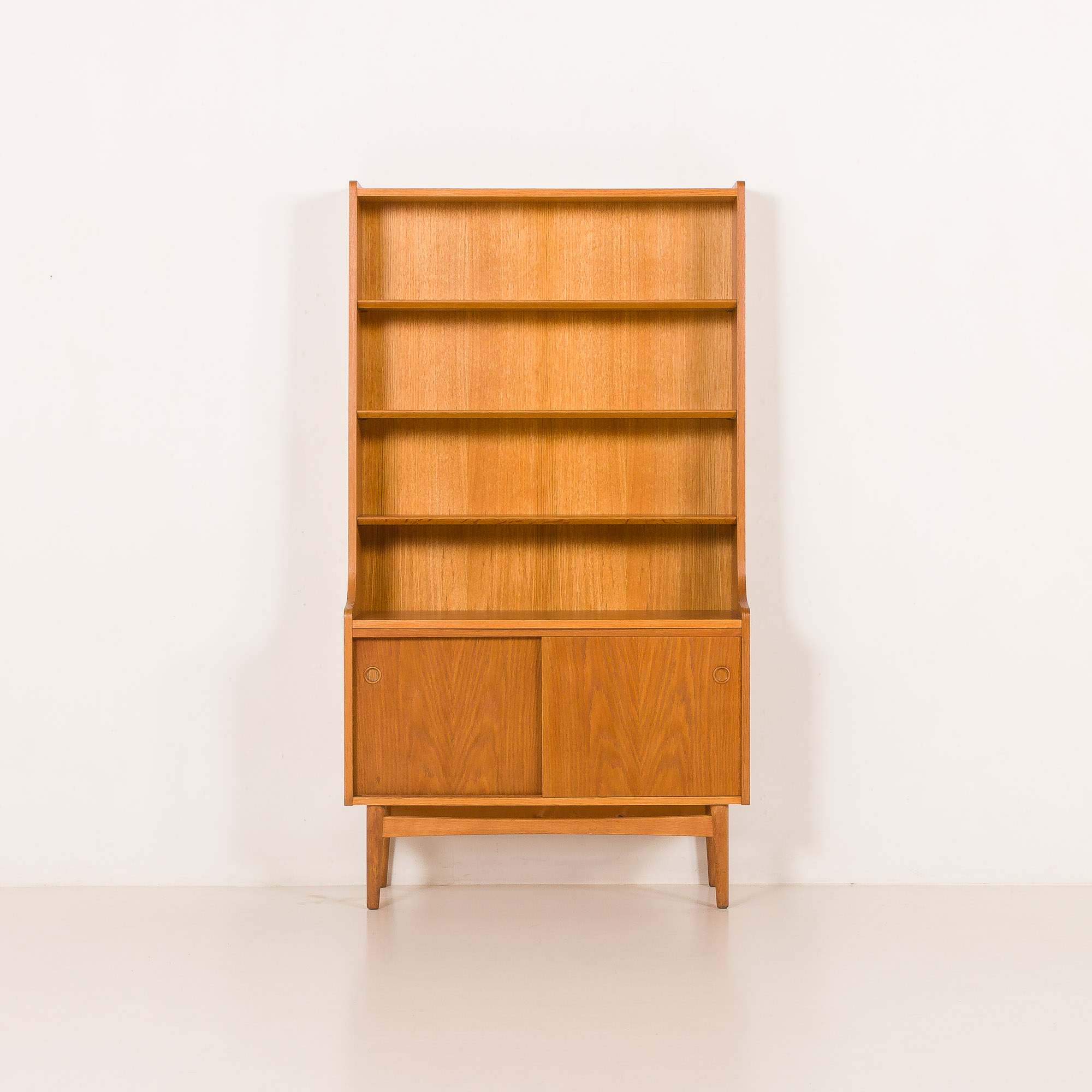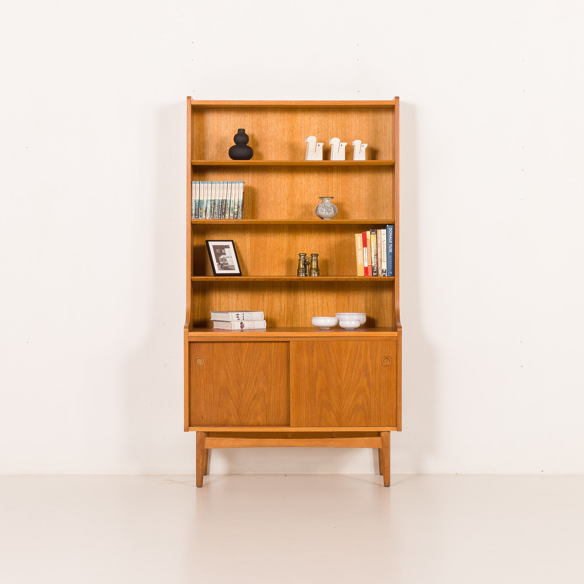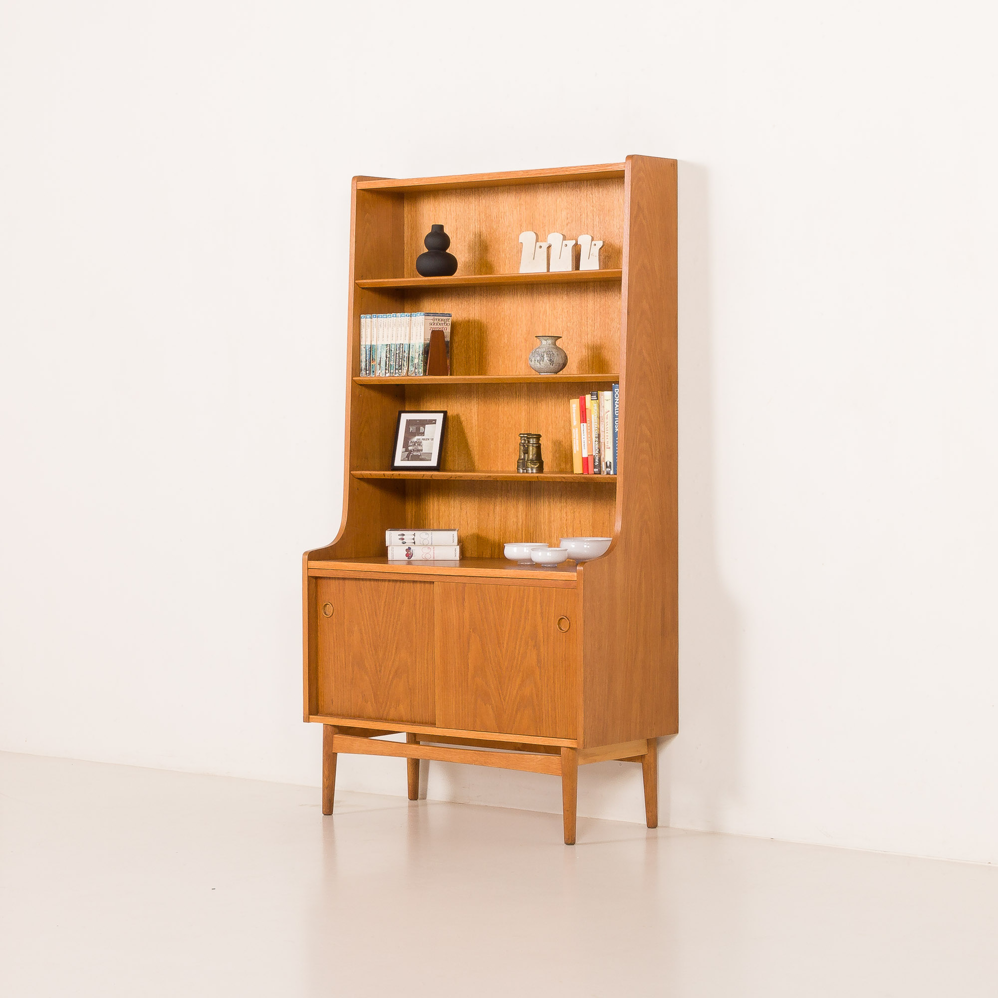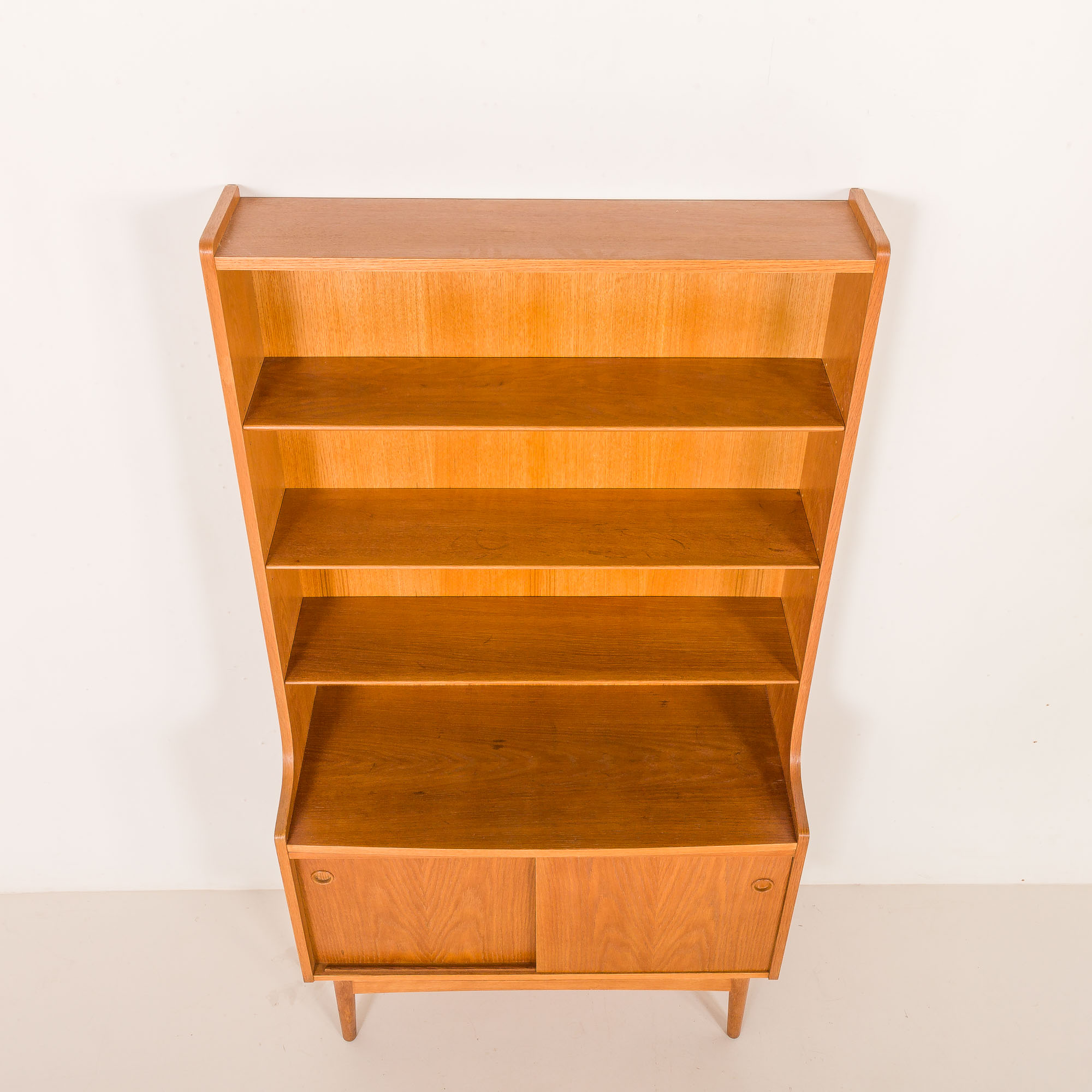 It is a marvelous example of high-quality Danish mid-century modern carpentry combined with elegance and functionalism. The bookcase consists of three adjustable shelves and a spacious cabinet with sliding doors and an inner shelf. Crafted from beautiful oak wood, the bookcase features slightly rounded edges and a nicely carved base, adding lightness to the construction. All of these elements add a touch of warmth and intimacy to any interior.