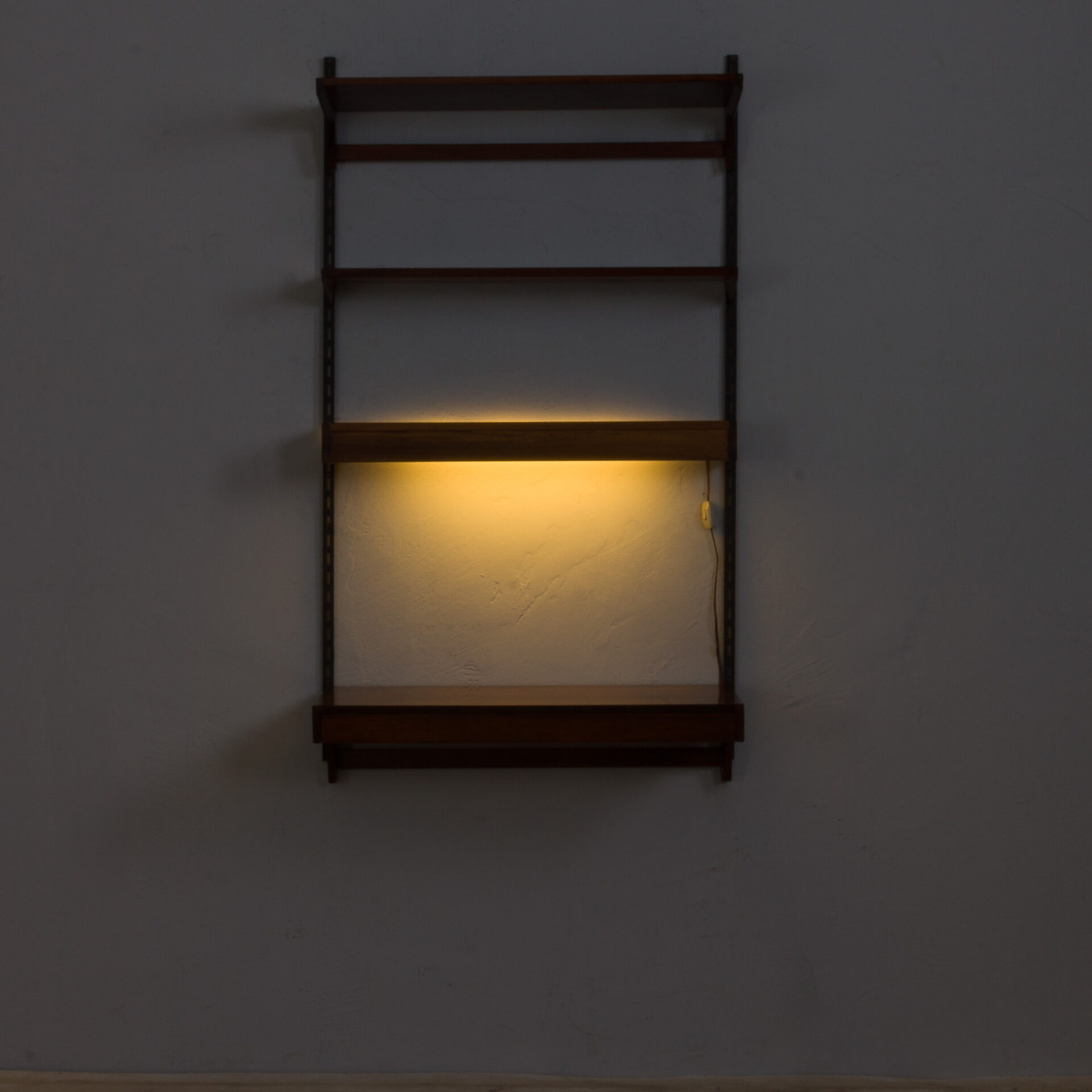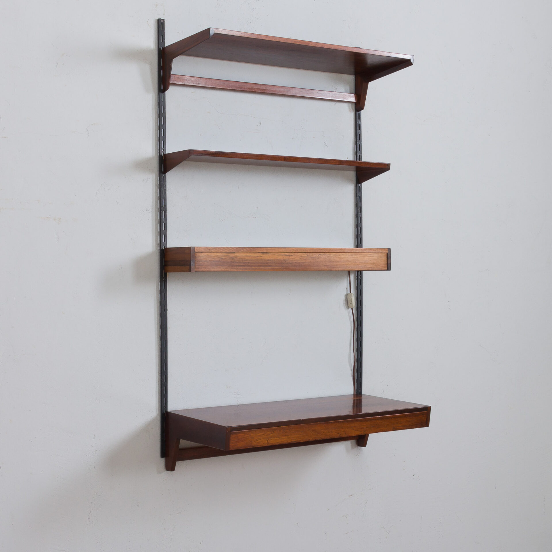 A small and elegant shelving system with a desk and a backlit shelf above made in rosewood. It was designed by Kai Kristiansen in the 1960s and made by FM Mobler. A manufacture’s label is preserved at the back of one shelf. It also has a stamp validating high-quality Danish furniture.