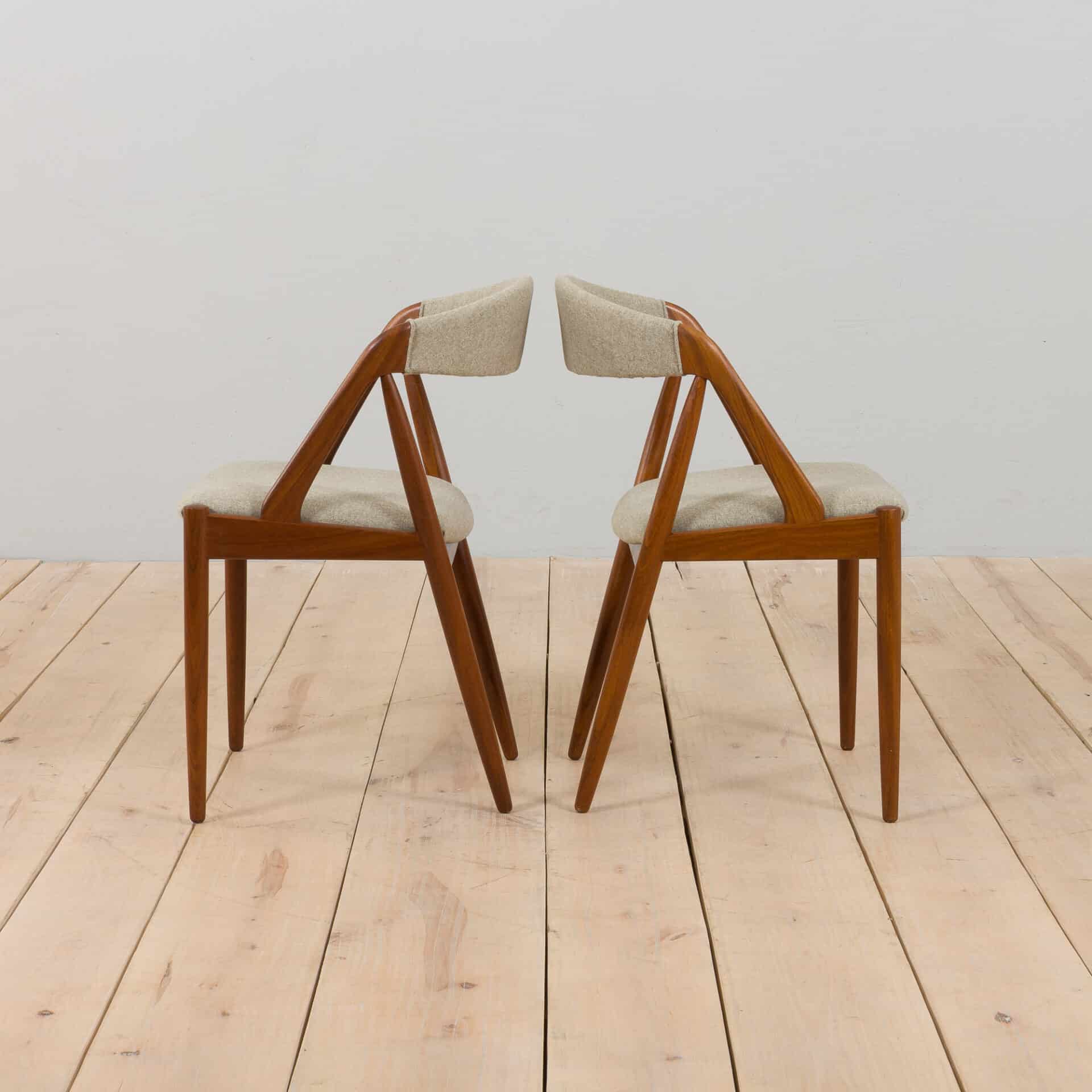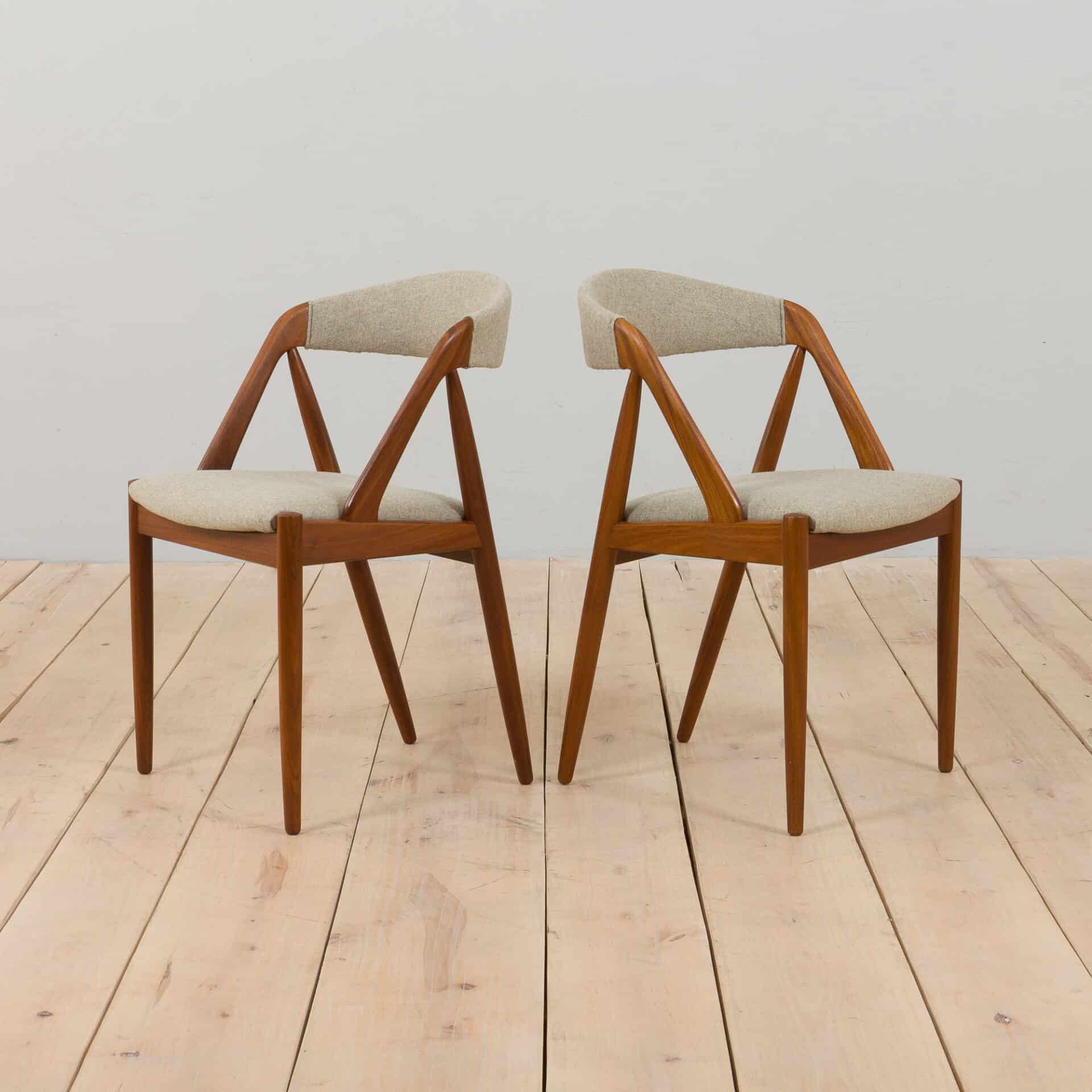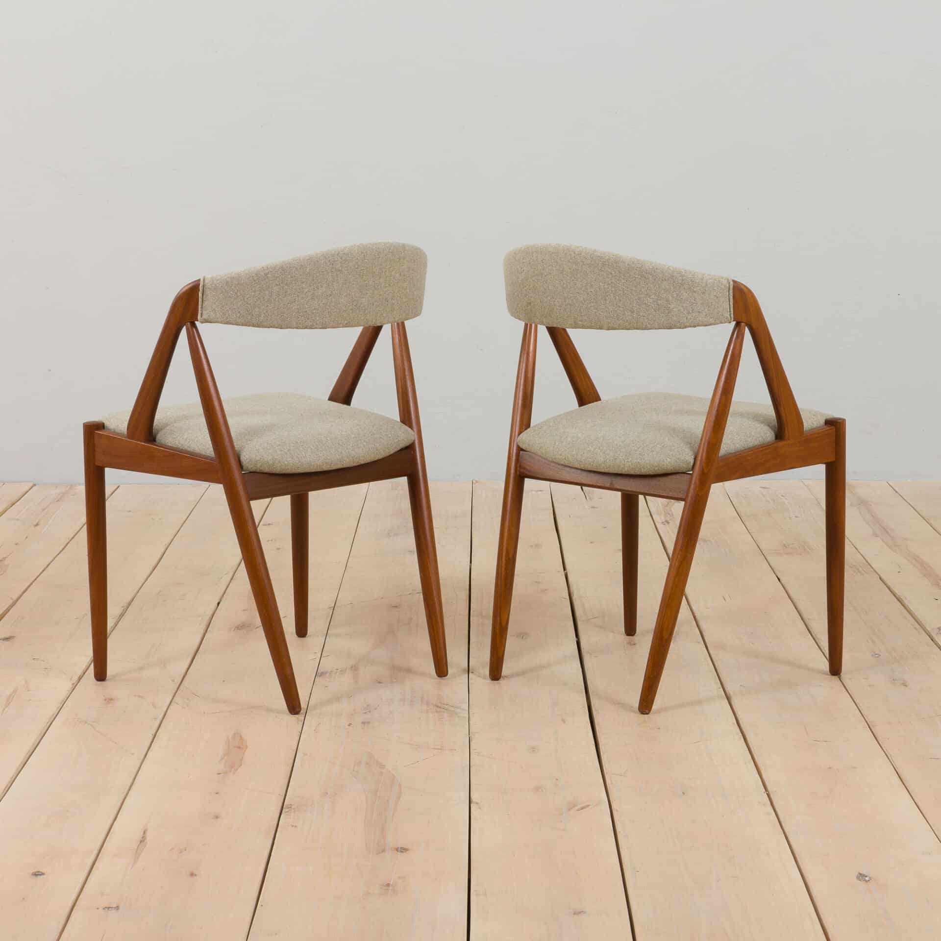 Pair of Danish teak chairs model # 31 designed by Kai Kristiansen for Schou Andersen in the 1960s. The beautiful ergonomic form is complemented by a wide seat pad and sculptured backrests for enhanced comfort. The frame is made of solid teak with beautiful exposed grain. The chairs have been reupholstered with natural wool fabric in gray-beige color, besides the rest in excellent original vintage condition with minimal traces of use.