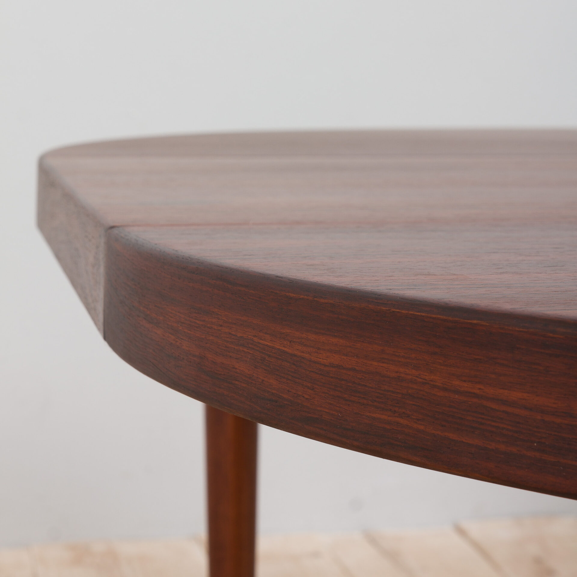 A beautiful and elegant round rosewood extension table designed in the 60s. by Kai Kristiansen. One 50 cm wide leaf provides a possibility to extend the table to 166 cm. Beautiful, rich wood grain, high-quality carpentry. Legs are made out of solid rosewood and are detachable for convenient transport. The table is in excellent vintage condition. It has been cleaned and renewed with professional compounds, has almost no signs of use.