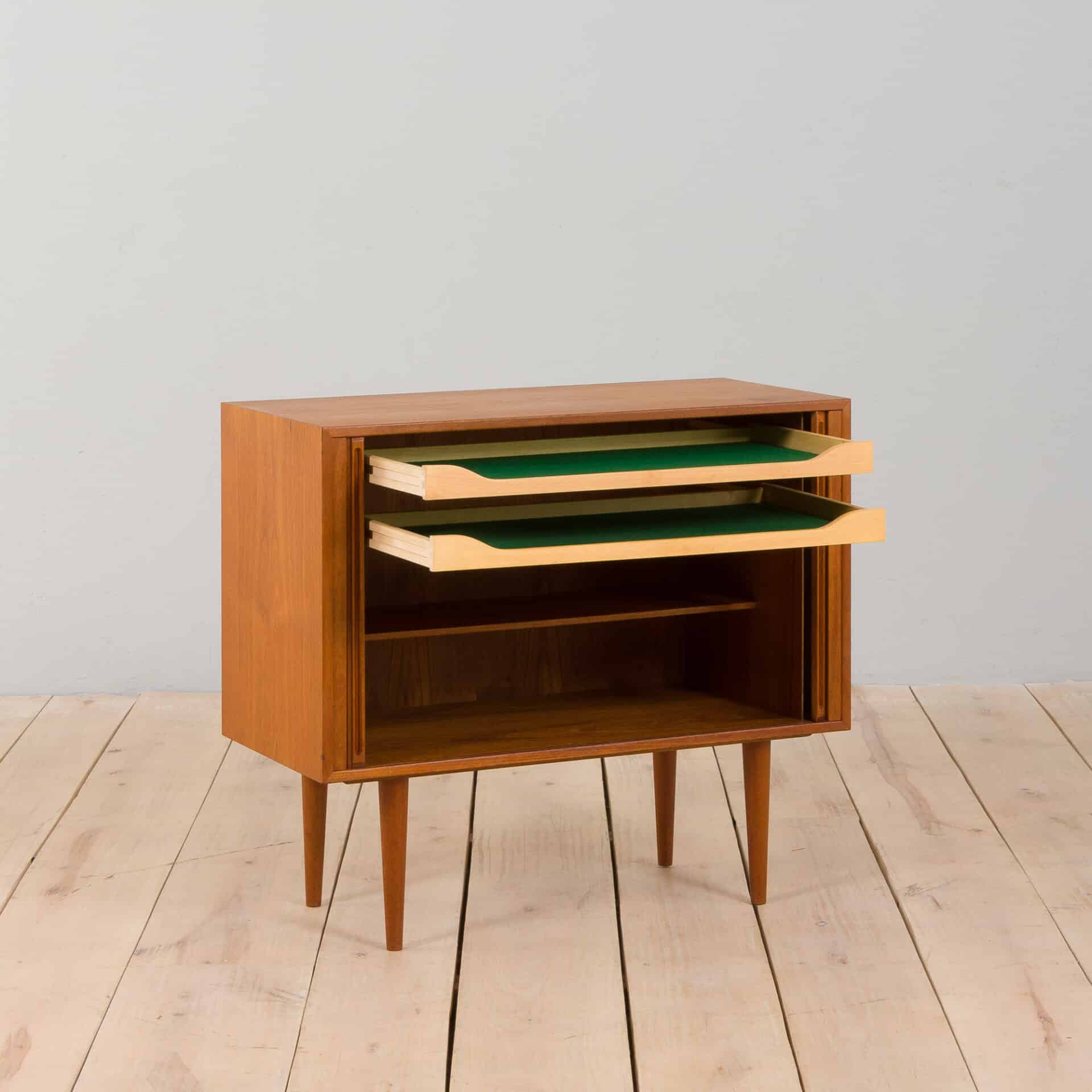 Small side teak dresser by Kai Kristiansen with tambour doors that disappear into the sides. Made on 8.08.1962 by a Danish manufacturer – Feldballes Møbelfabrik. Manufacturer’s stamp provided. Incredibly crafted doors with invisible signs of joining open an interior with two green baize-lined trays and an adjustable shelf. Slim, tapered solid teak legs provide elegant, light touch, typical for Danish mid-century design.