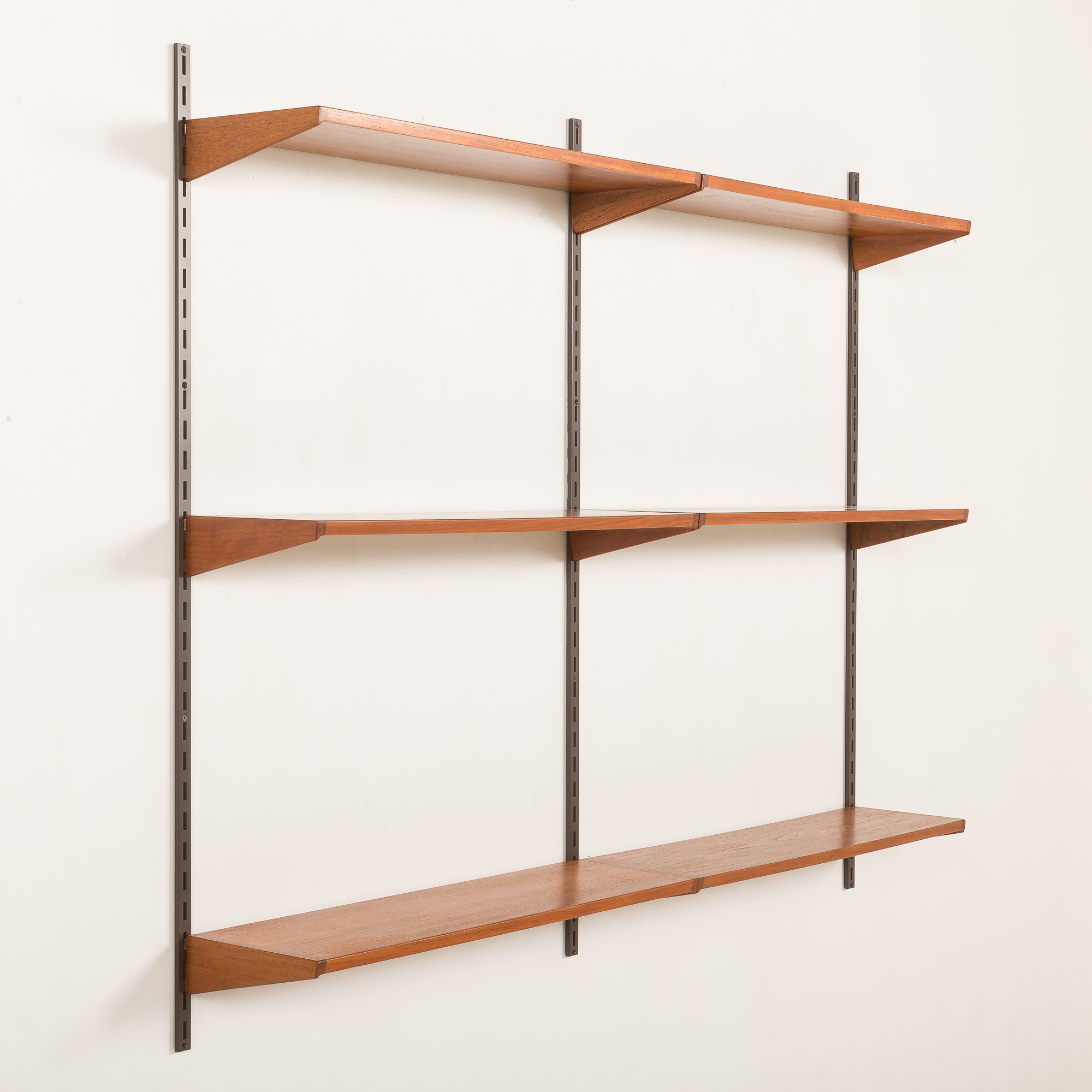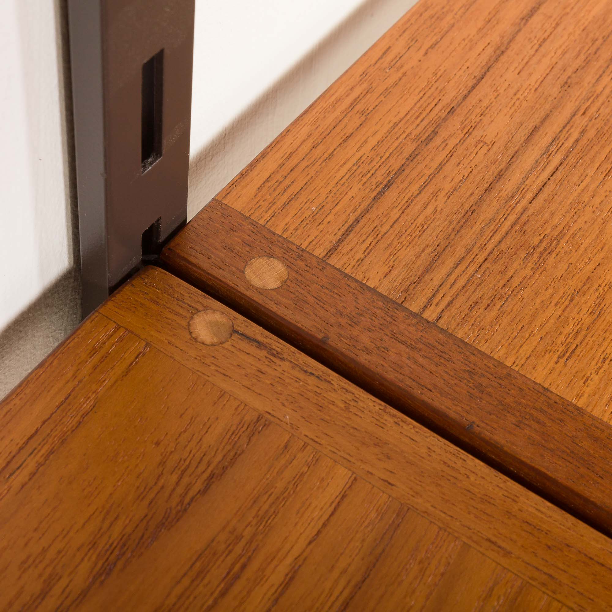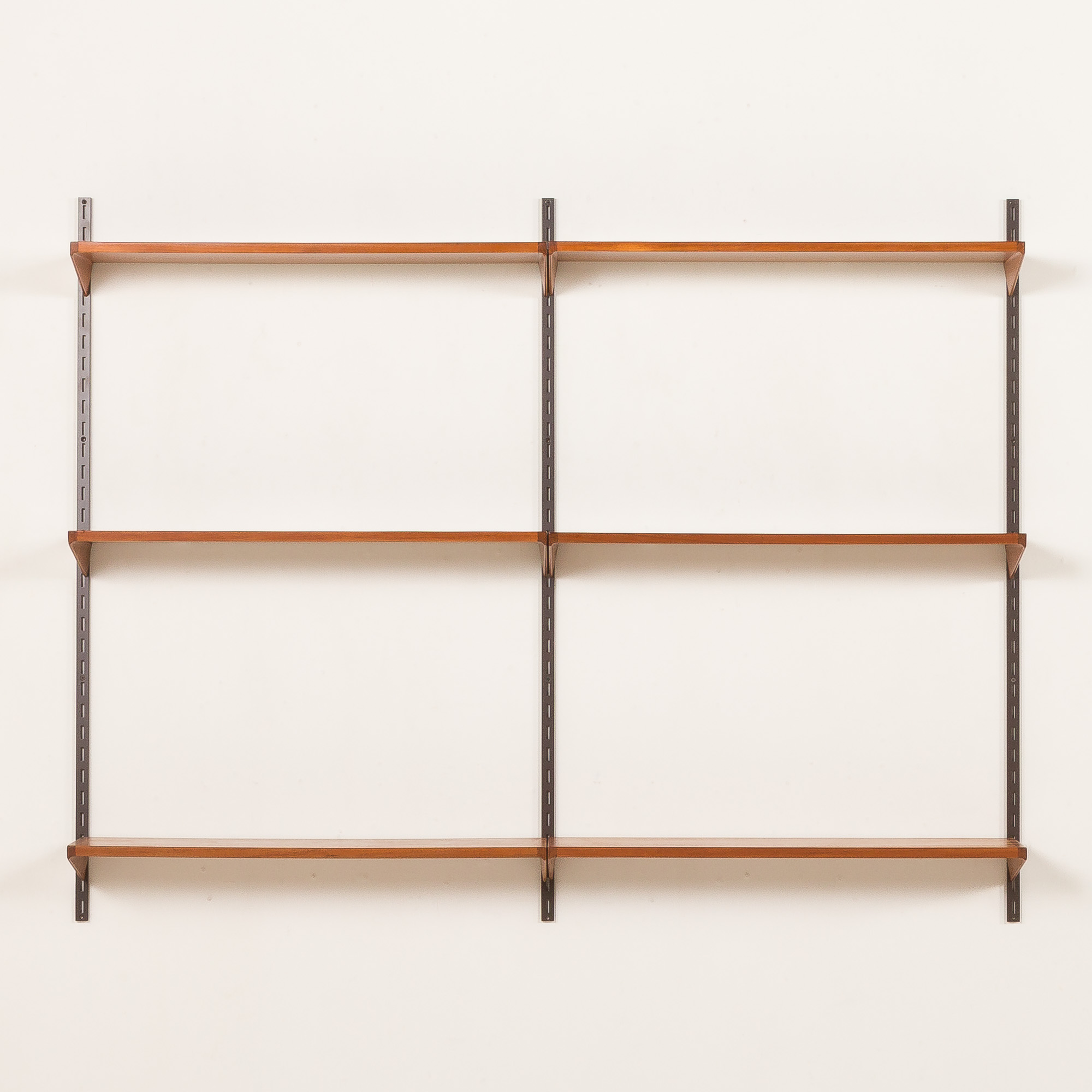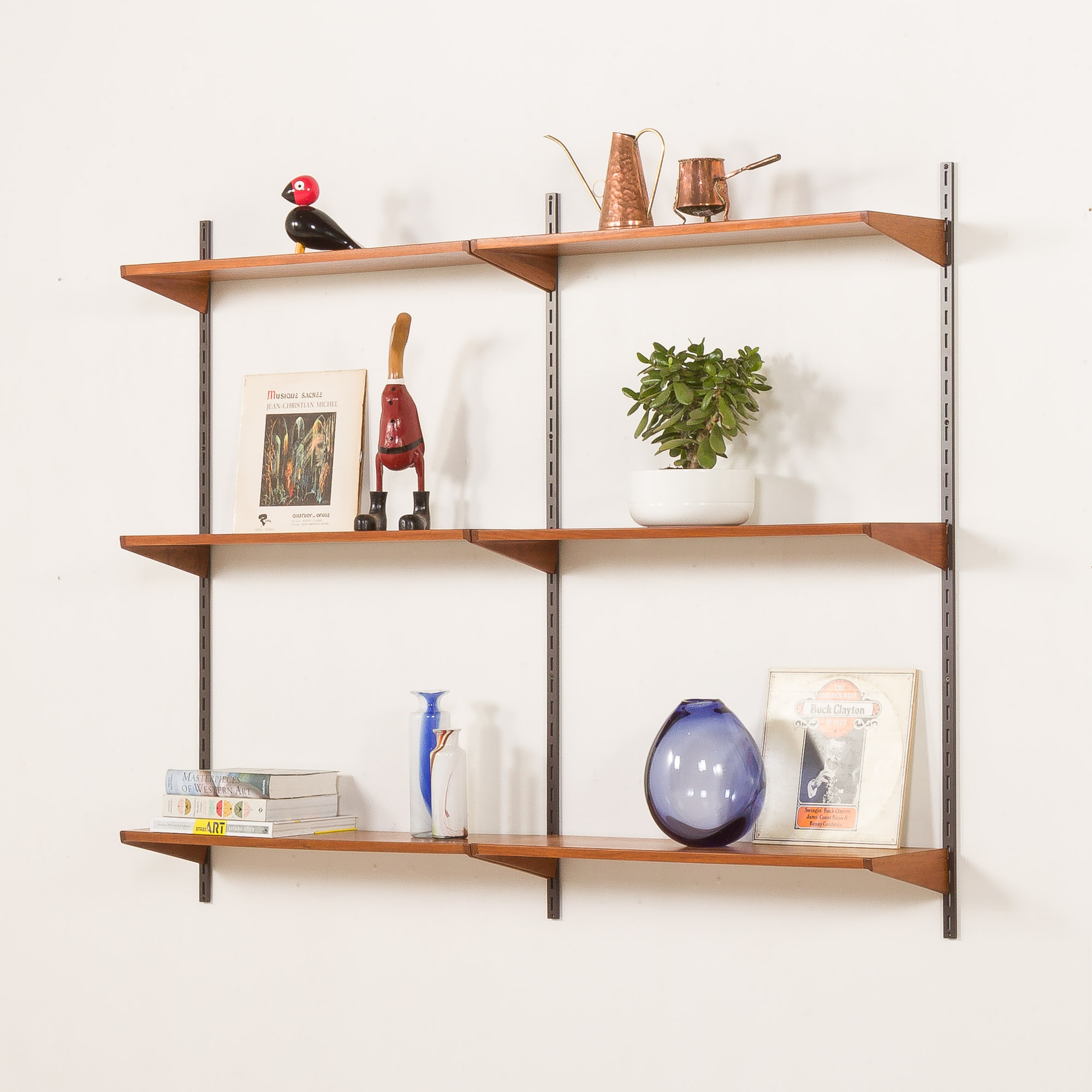 This minimalist and functional mid century shelving unit, designed by Kai Kristiansen, an icon of Danish design was made by FM Mobler in Denmark in the 1960s. Straight lines, quality craftsmanship, and a modular hanging system enhance the characteristic style of Scandinavian design. The use of high-quality teak wood and veneer ensures the piece’s durability and longevity. Thanks to its size and minimalist form, it will suit a variety of interiors. The practical mounting system uses hooks embedded in holes in metal rails, making assembly both aesthetically pleasing and simple. Kai Kristiansen designs are like sculptures, extremely decorative even though very simple.