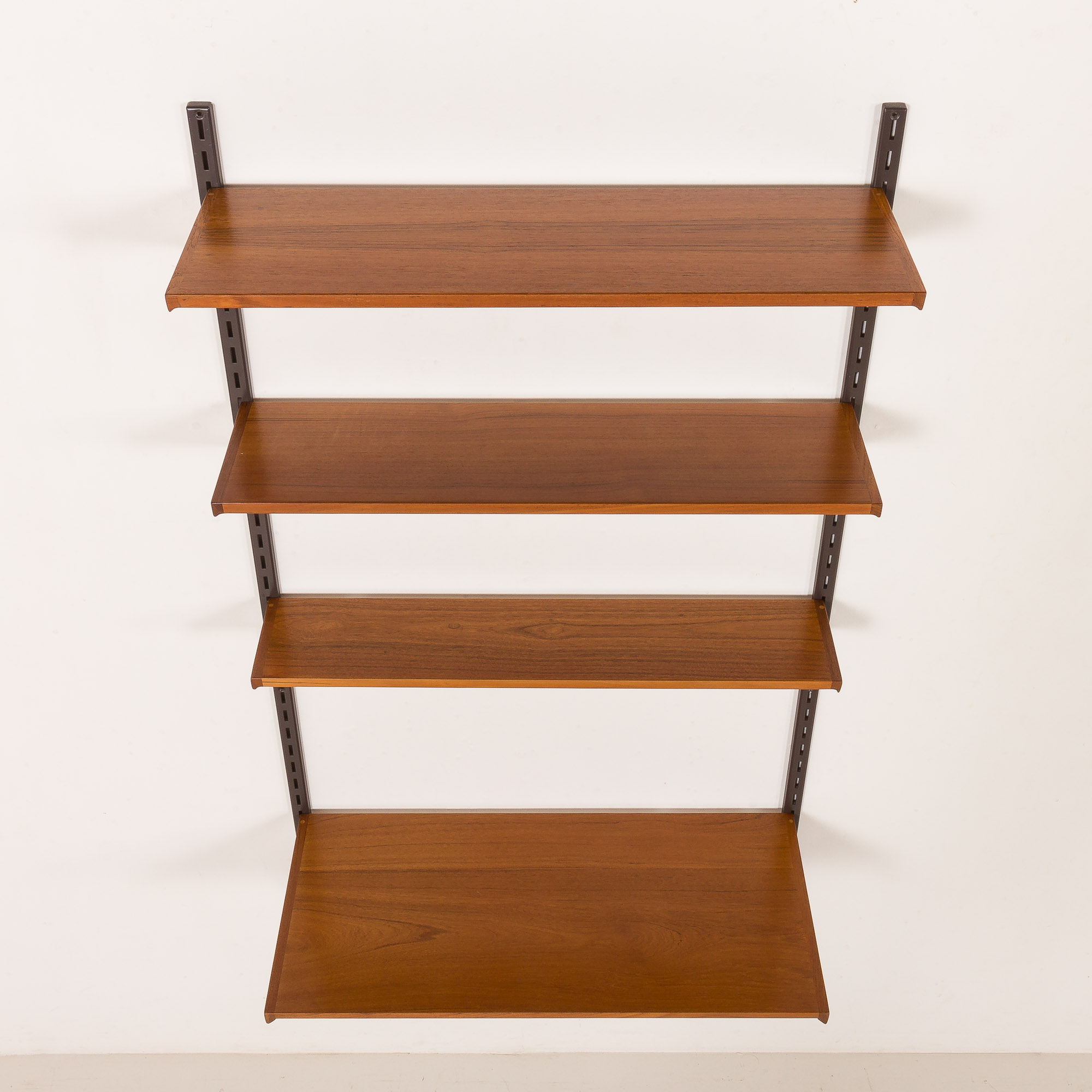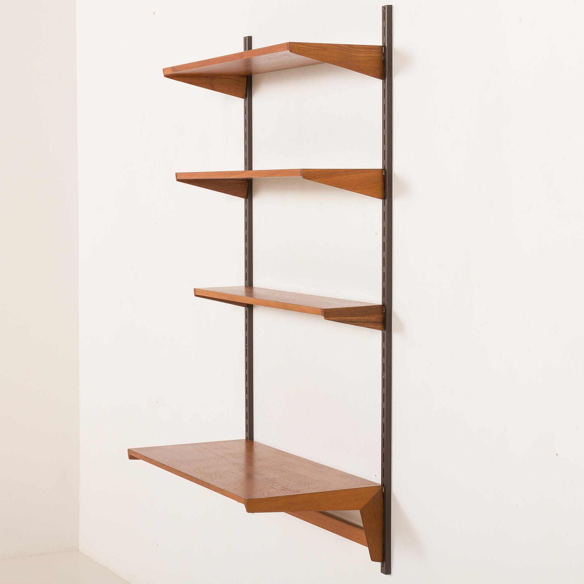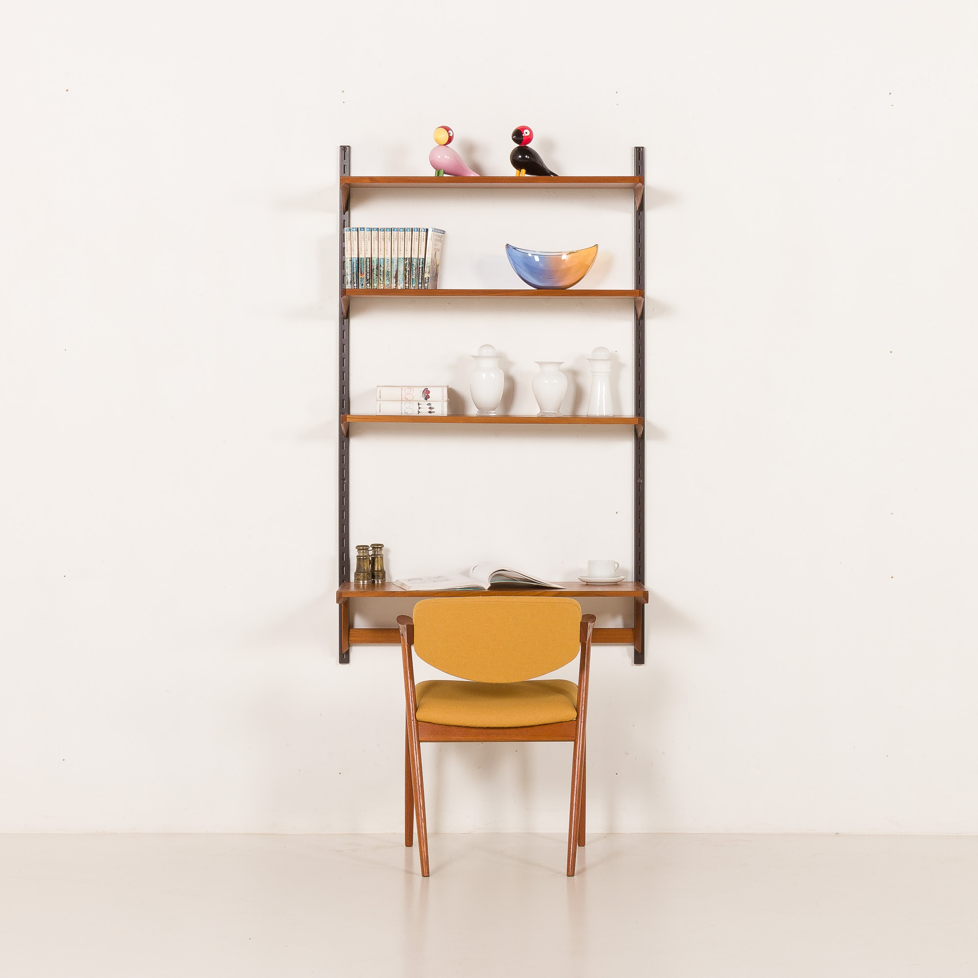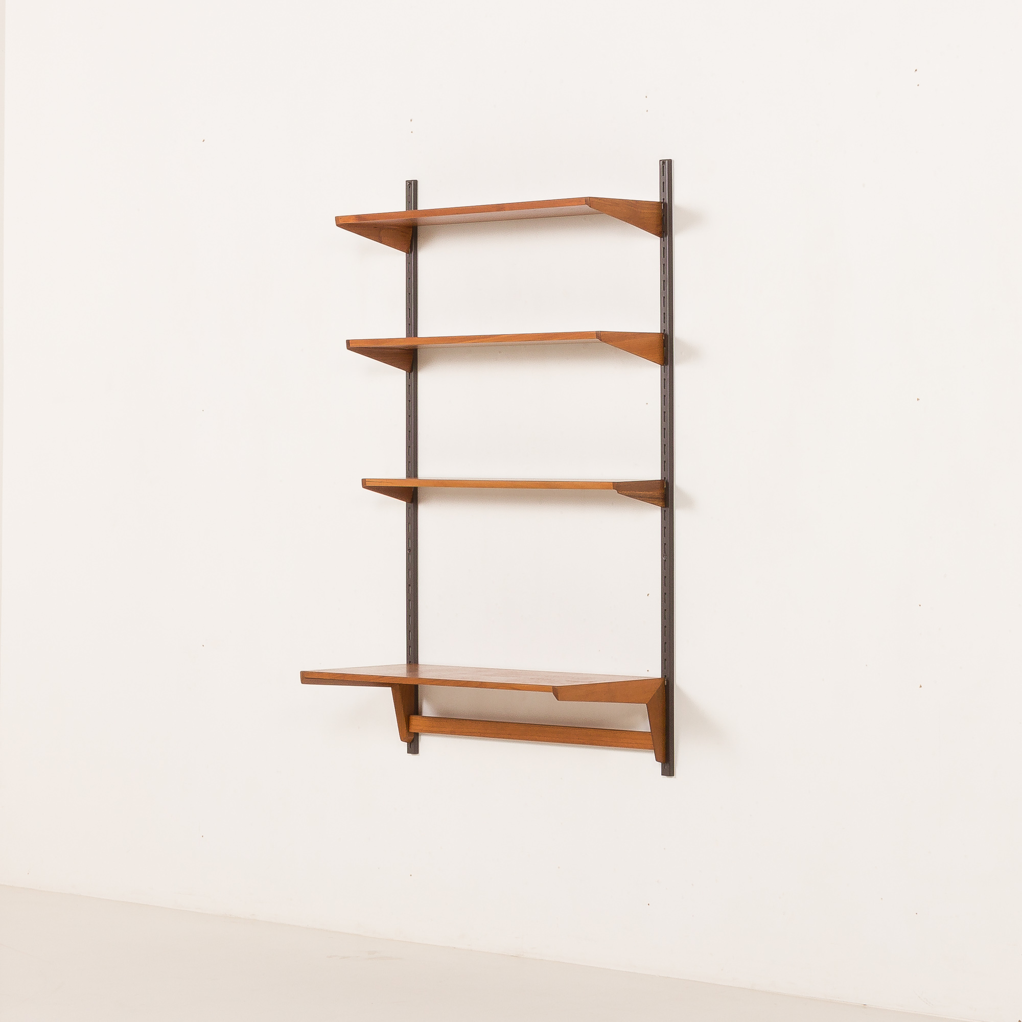 An elegant teak shelving system, designed by Kai Kristiansen, will create a functional and stylish working space for a home office. It was manufactured in the 1960s by FM Mobler, which is validated by the original label. It is a great alternative to traditional desks. Space-saving solution.