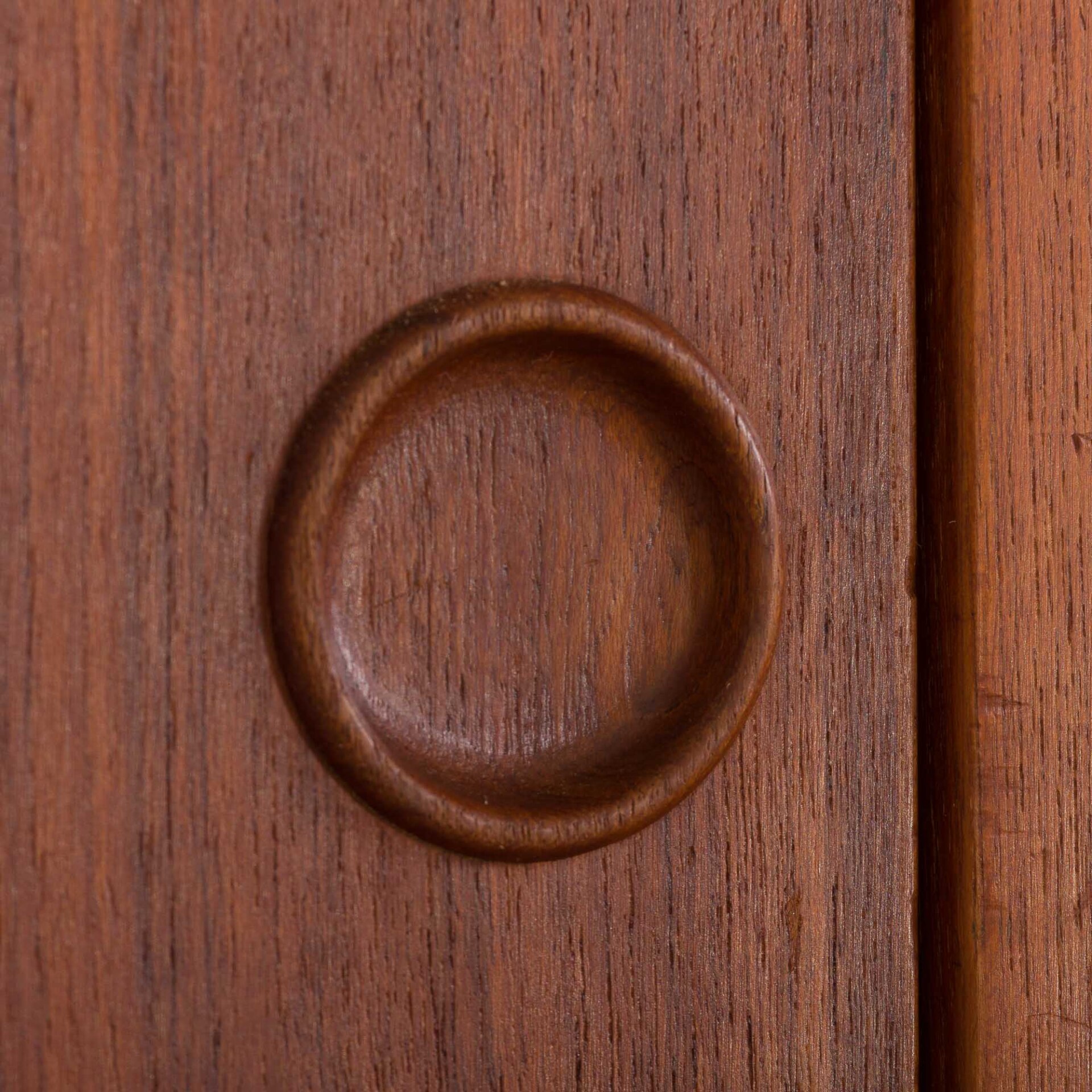 Extremely elegant vintage modular bookcase in teak by Kai Kristiansen manufactured by FM Mobler, in Denmark in 1960s, validated by original label. This shelving system is entirely modular and can be arranged as needed, by easy system of metal brackets fitting into the metal rails. Ten shelves and three cabinets, including a bar cabinet will provide just enough space for storage, books and decorations. An additional element that makes class and elegance to the set is a shelf with fluted glass.