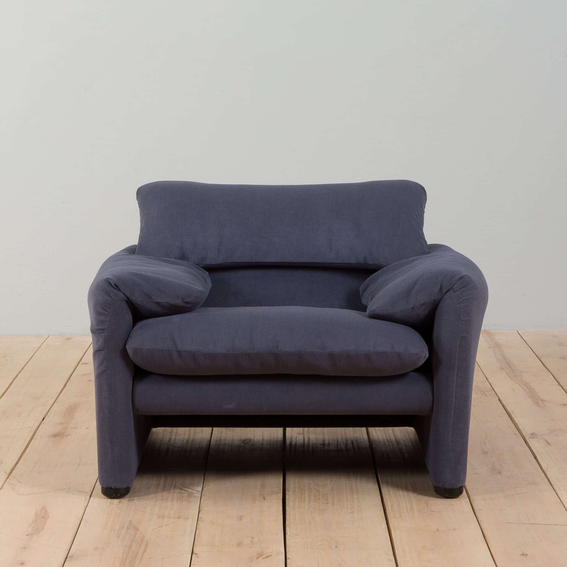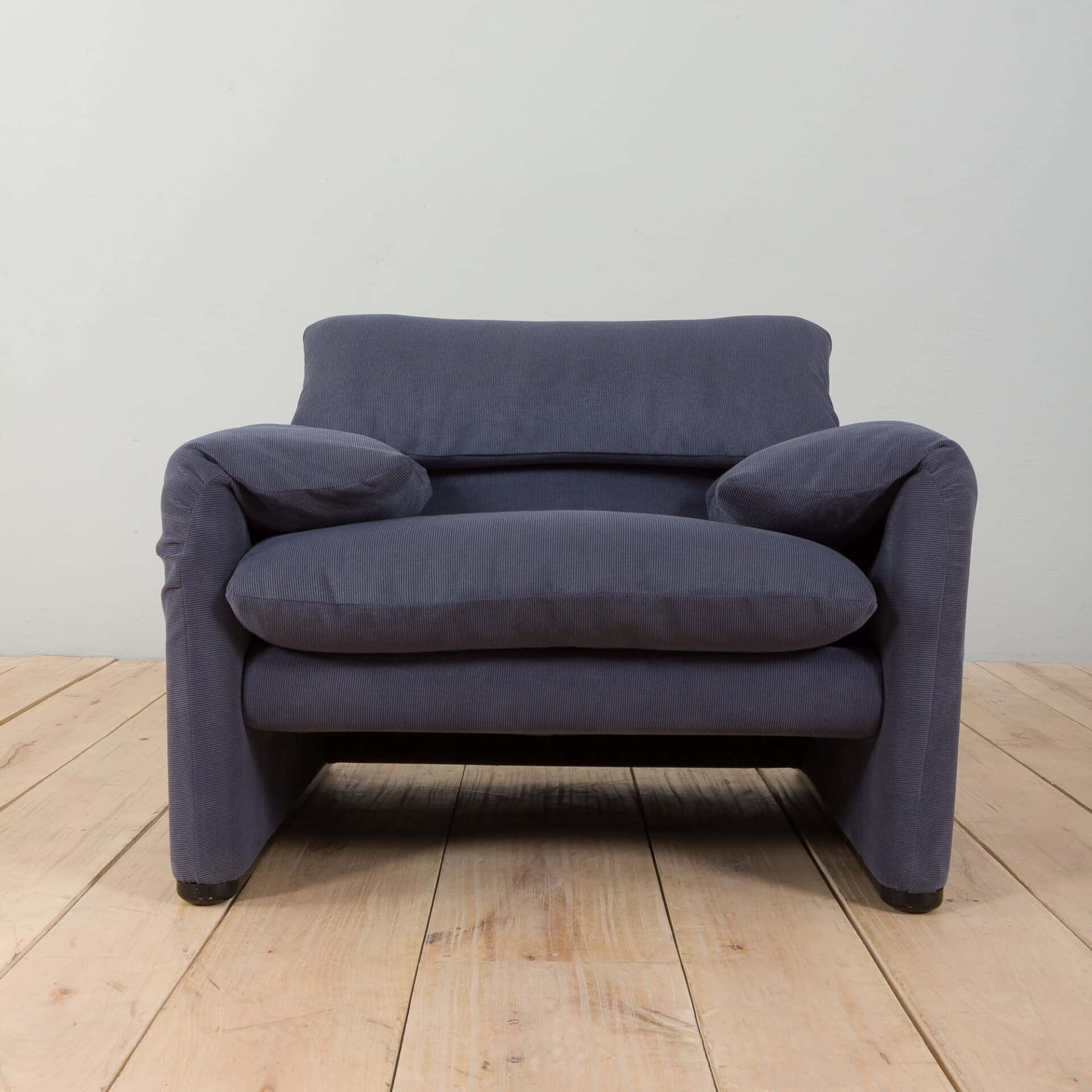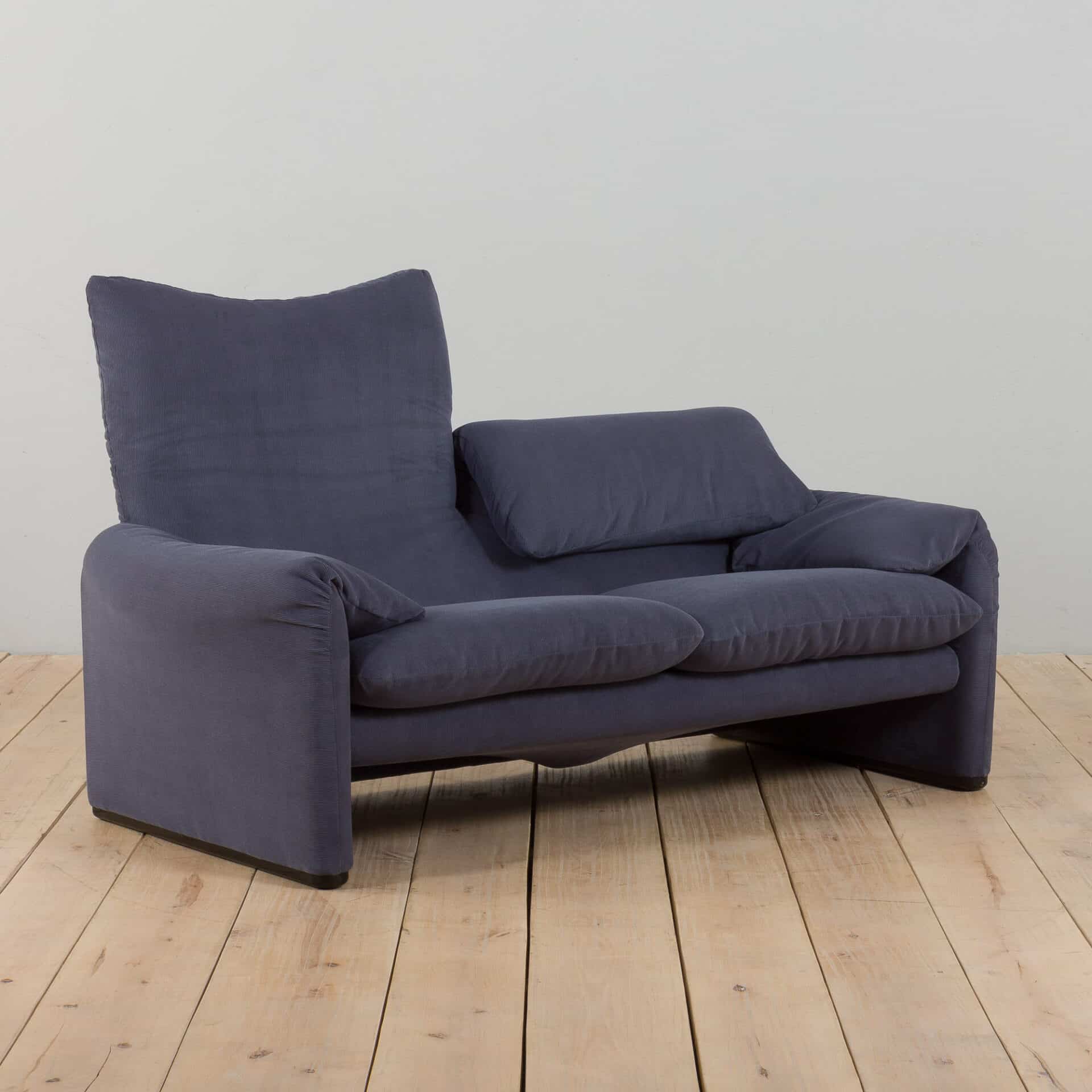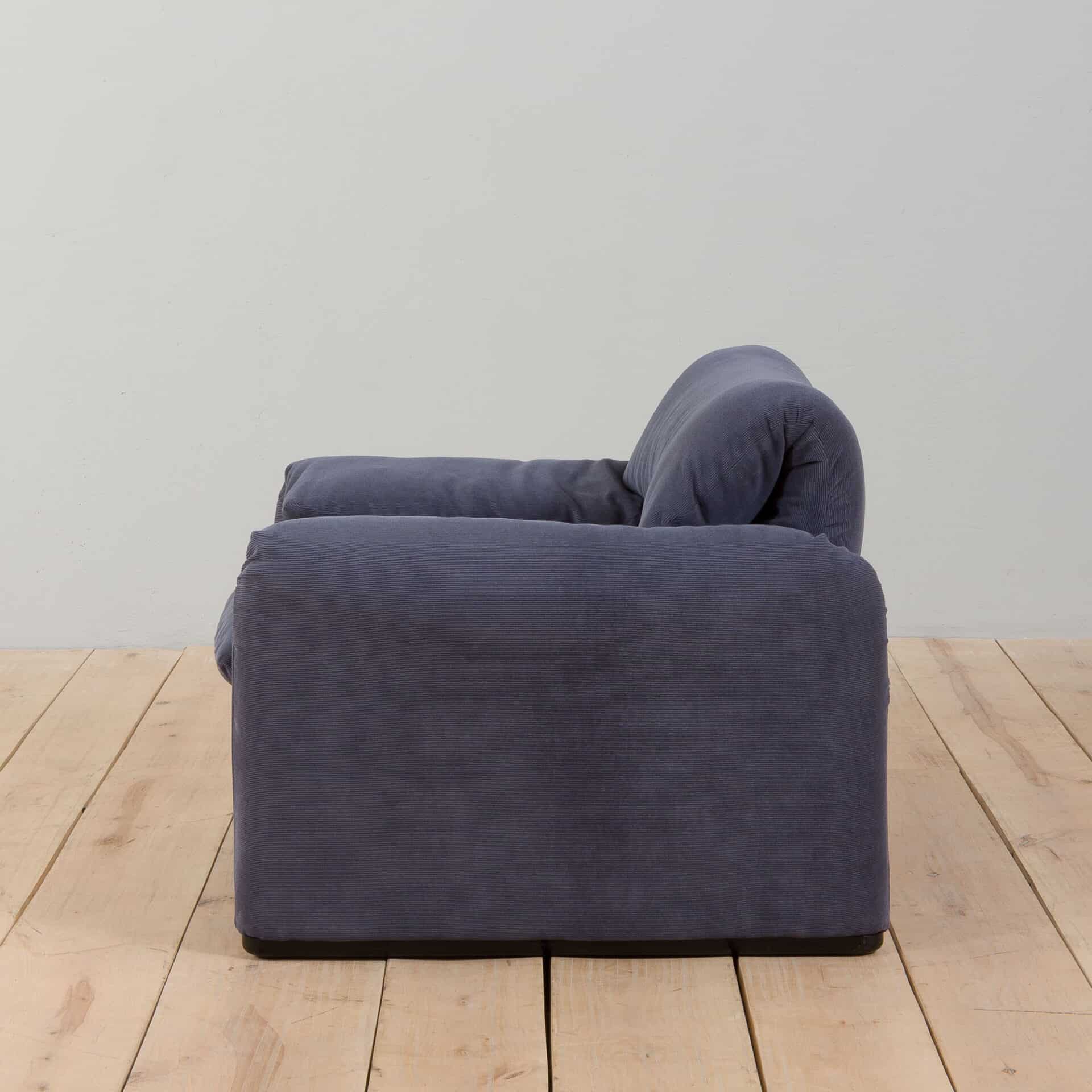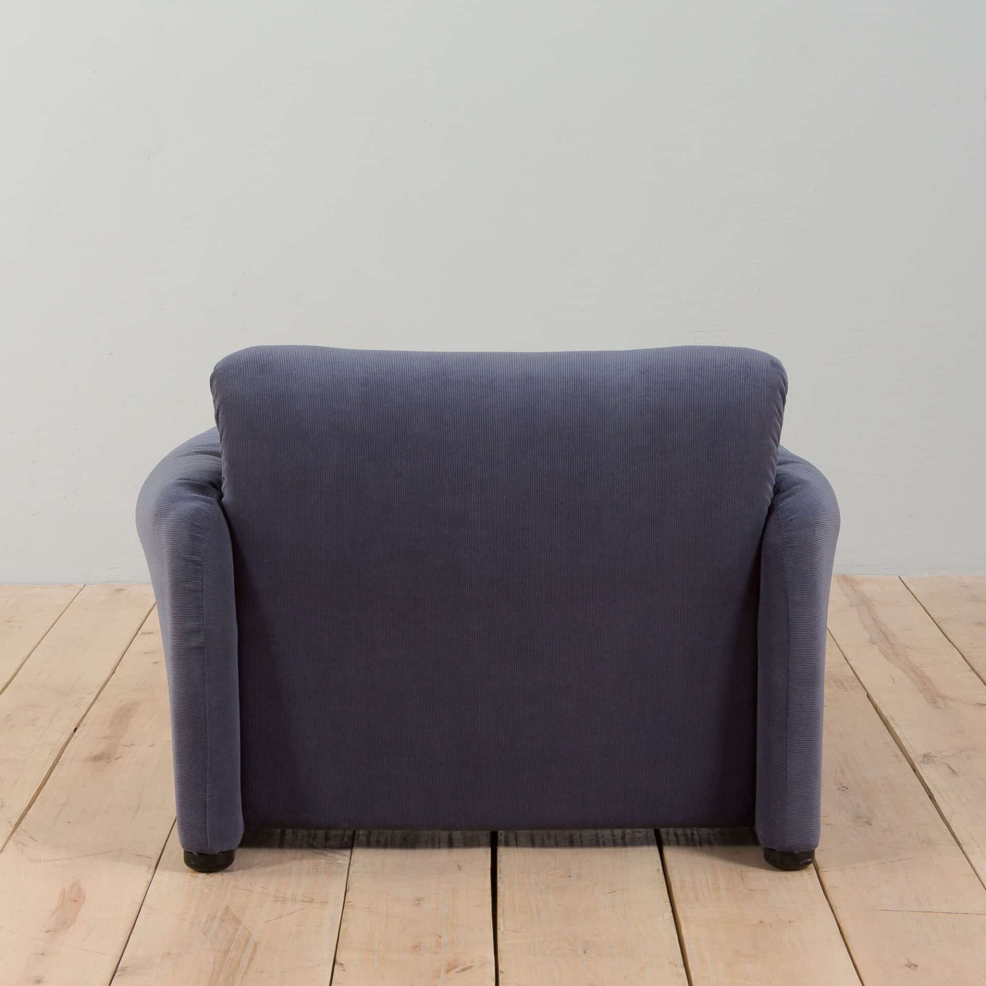 An extremely comfortable lounge set, model Maralunga was designed by Vico Magistretti for the finest Italian manufacturer Cassina in the 1980s. It consists of a two seater sofa and an armchair, both newly reupholstered in deep blue corduroy. The Maralunga model is composed of warm and reassuring shapes, where the possibility of movement of the backrest, soft appearance, and padding enhance the comfort. Especially renowned for its rabbit ear backrest, which can be adjusted as needed. They curve by an internal mechanism and can be easily adjusted upward to allow the guest to rest their head as they like.