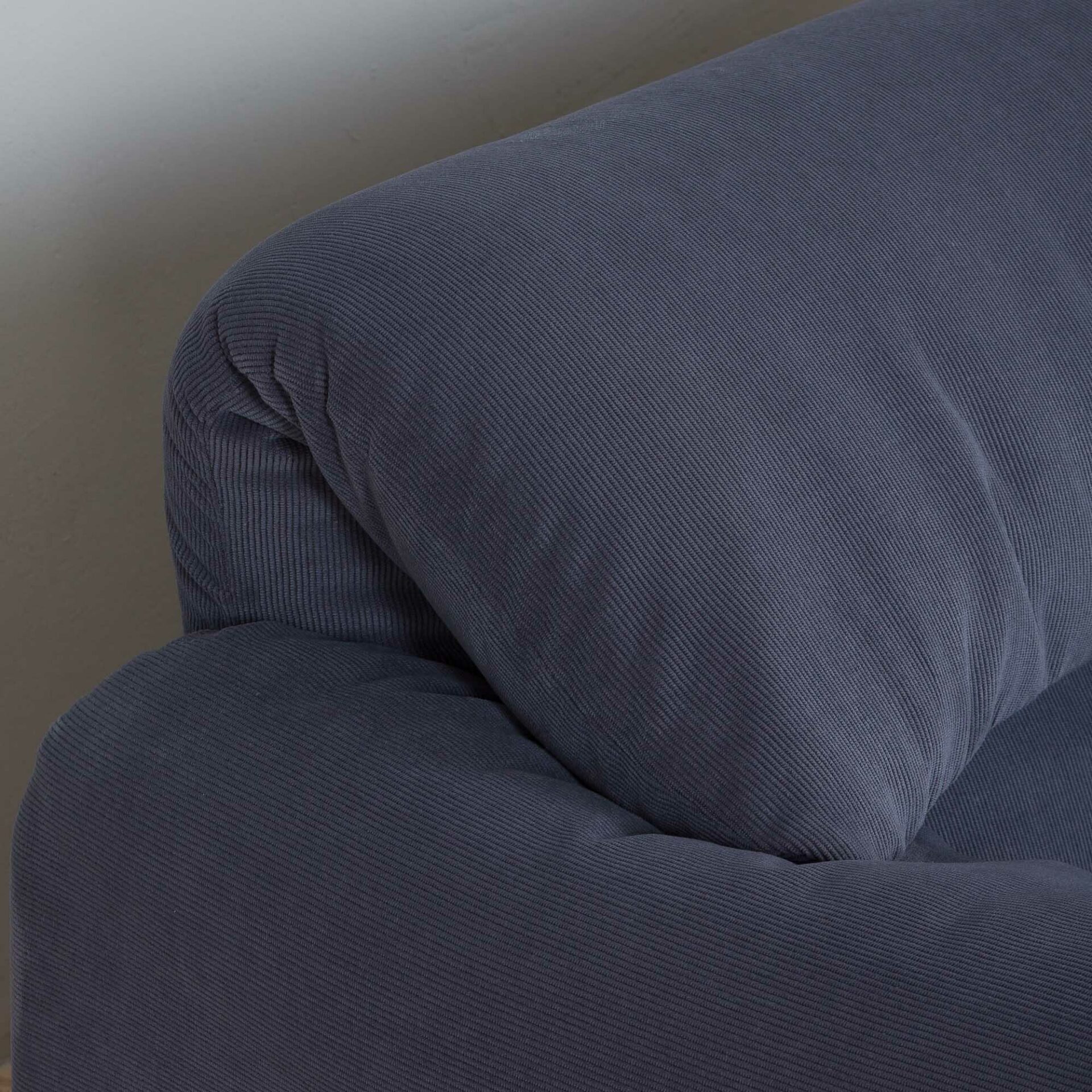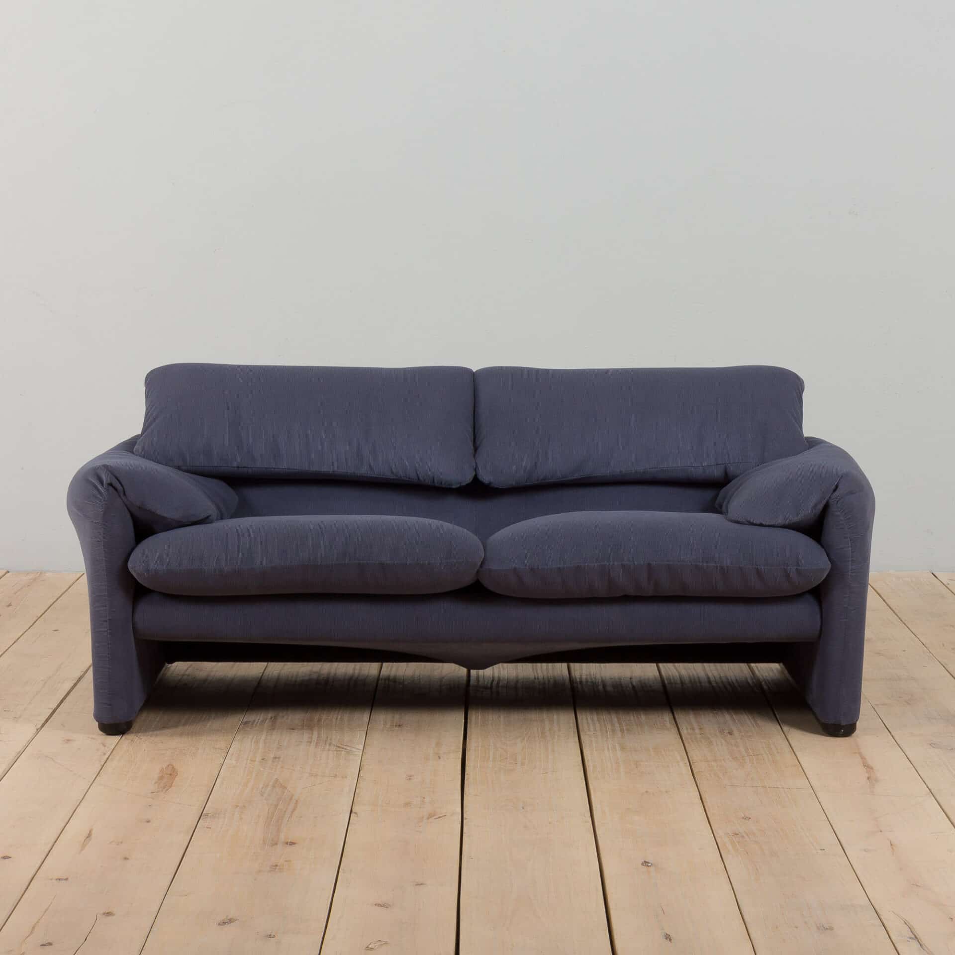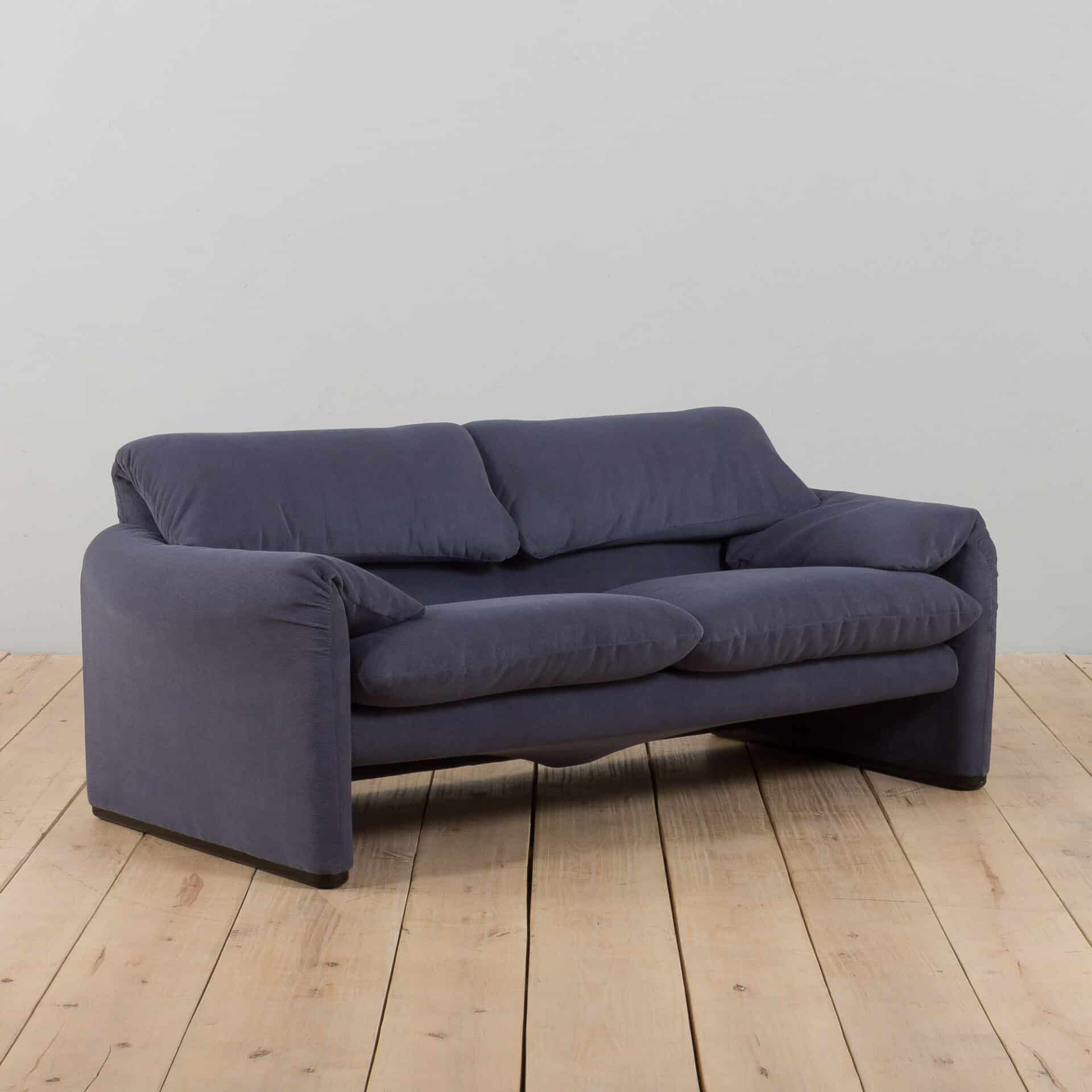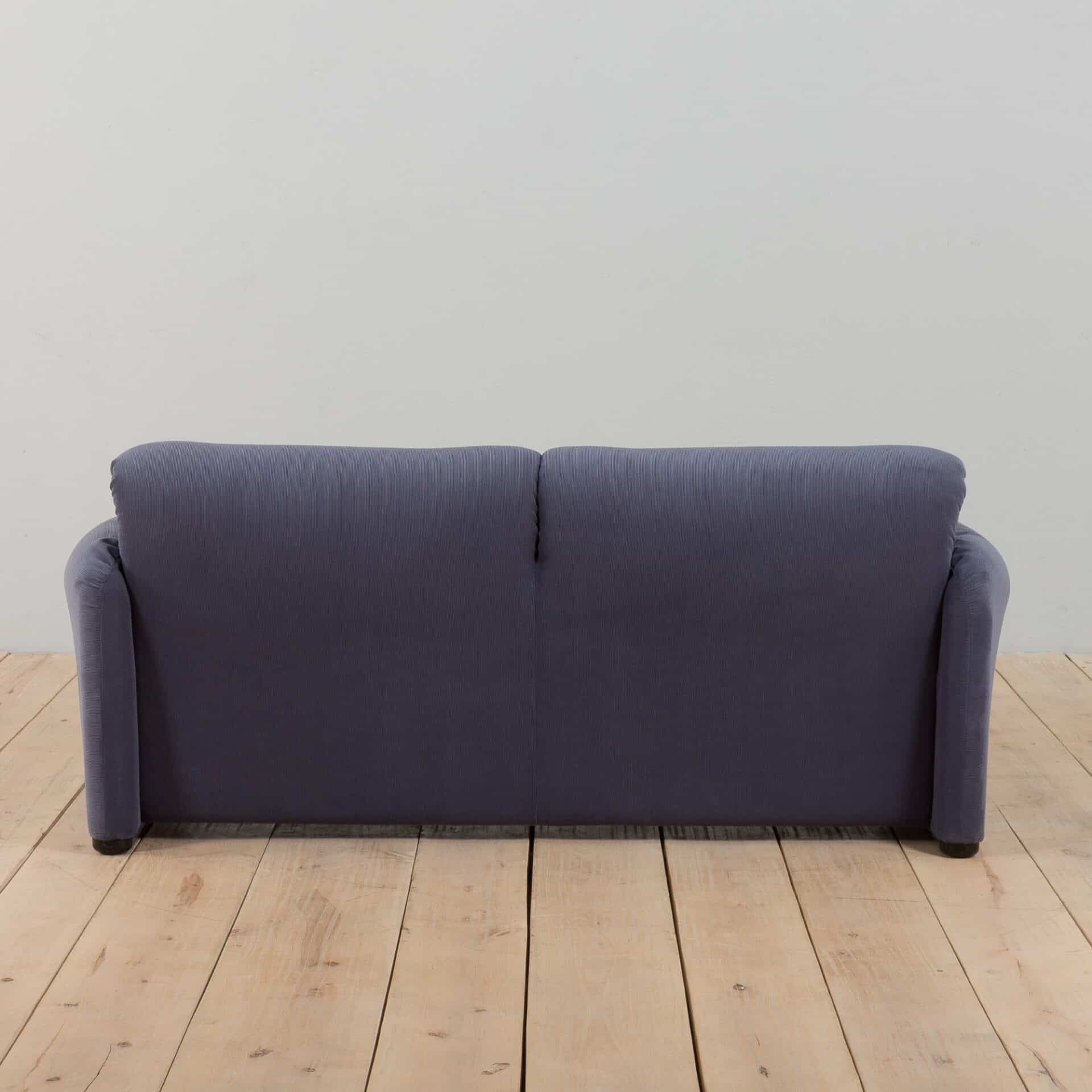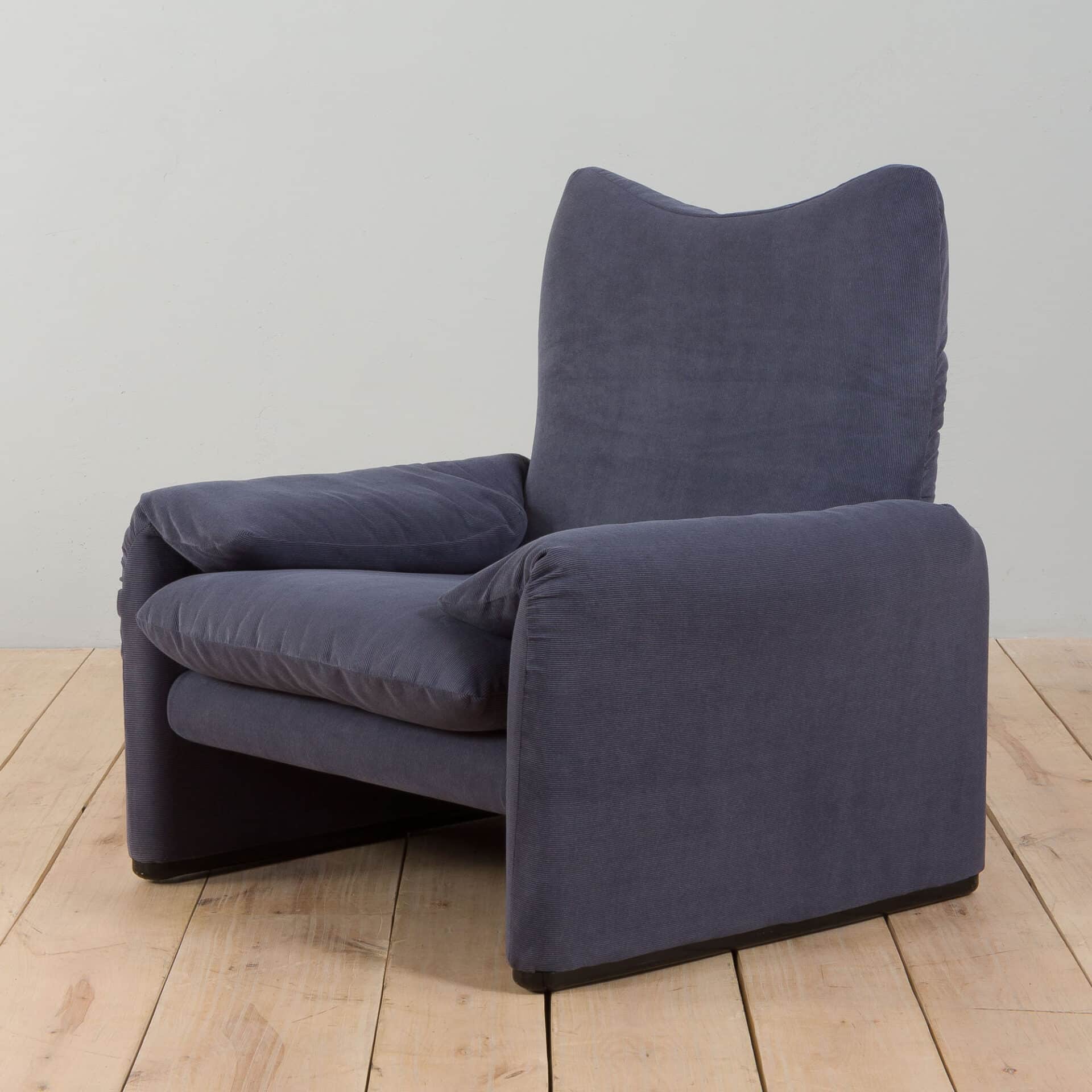 An extremely comfortable lounge set, model Maralunga was designed by Vico Magistretti for the finest Italian manufacturer Cassina in the 1980s. It consists of a two seater sofa and an armchair, both newly reupholstered in deep blue corduroy. The Maralunga model is composed of warm and reassuring shapes, where the possibility of movement of the backrest, soft appearance, and padding enhance the comfort. Especially renowned for its rabbit ear backrest, which can be adjusted as needed. They curve by an internal mechanism and can be easily adjusted upward to allow the guest to rest their head as they like.