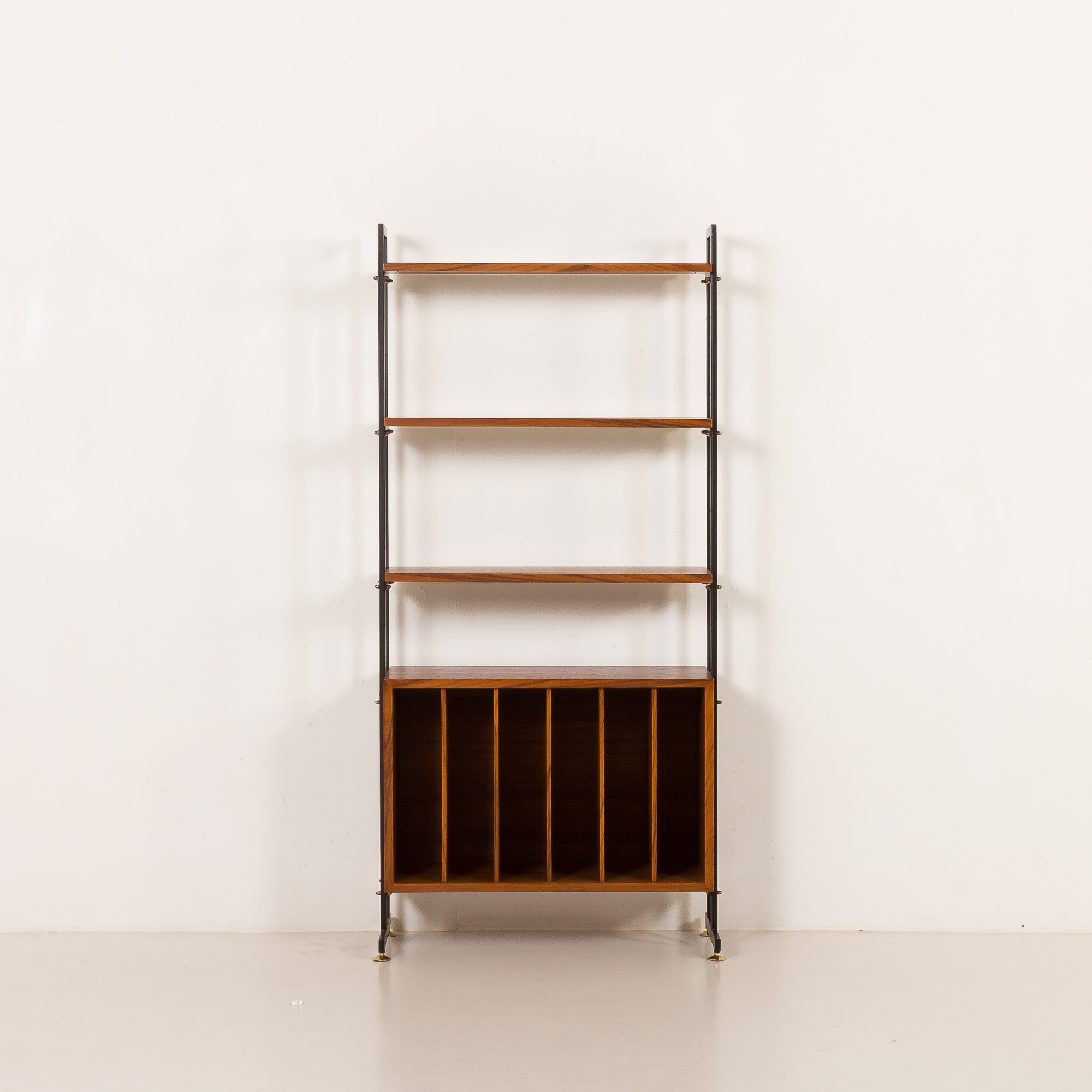 The unit is finished with teak veneer on both sides, which makes it a perfect room divider or just a free standing decorative piece of furniture. The structure is supported by black-painted metal uprights resting on refined brass feet, creating a light and balanced appearance, contrasting warm teak wood. In addition to the 3 shelves, the set includes a cabinet perfect to collect vinyl records. It can be a great mid-century audio equipment rack in your living room or a bedroom.