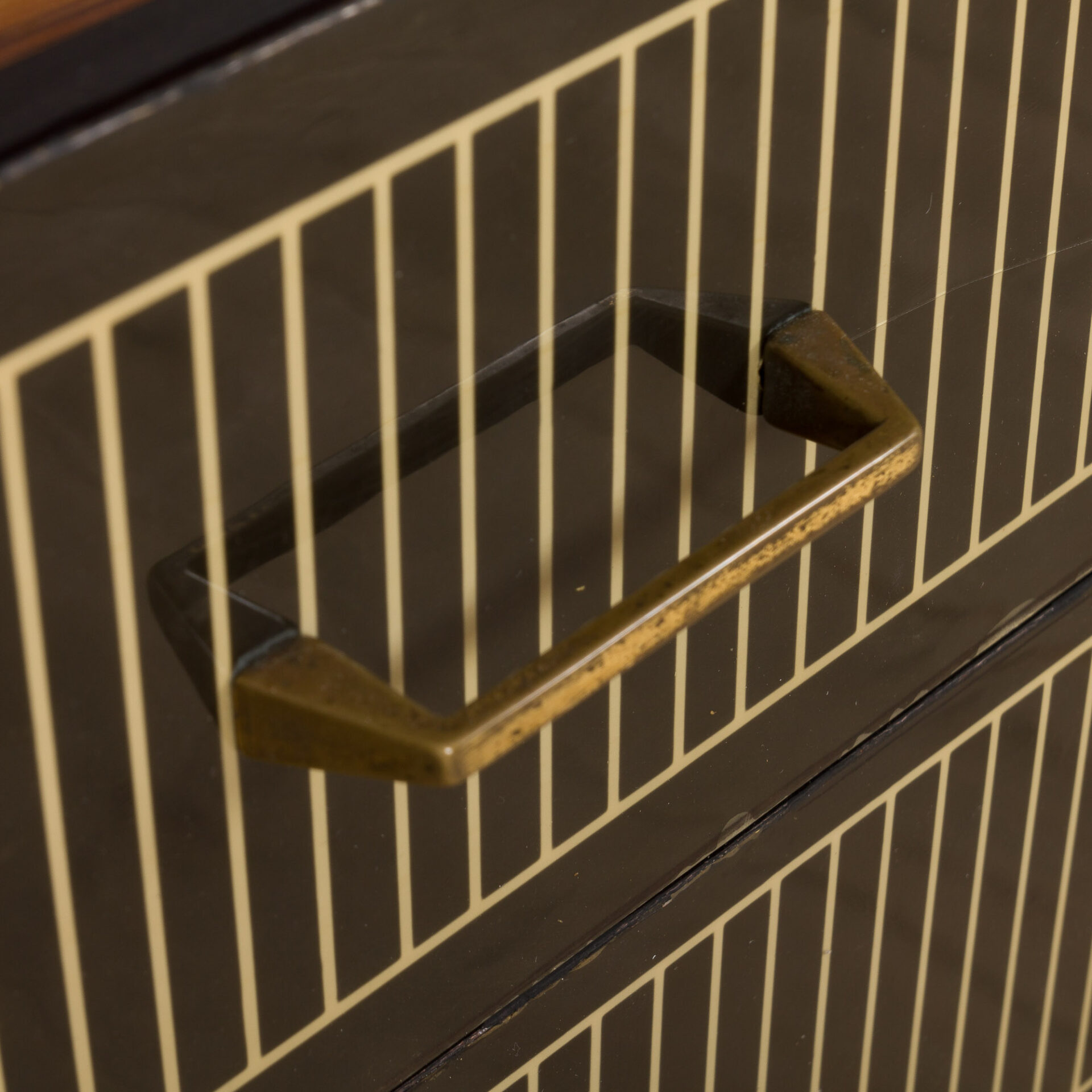 Classic Italian mid-century piece with gloss lacquer finish and truly rare to find hand-painted bar cabinet. It was designed in the manner of Fornasetti from the 50s. At a glance, it reminds of Vittori Dassi wall units from the same period.