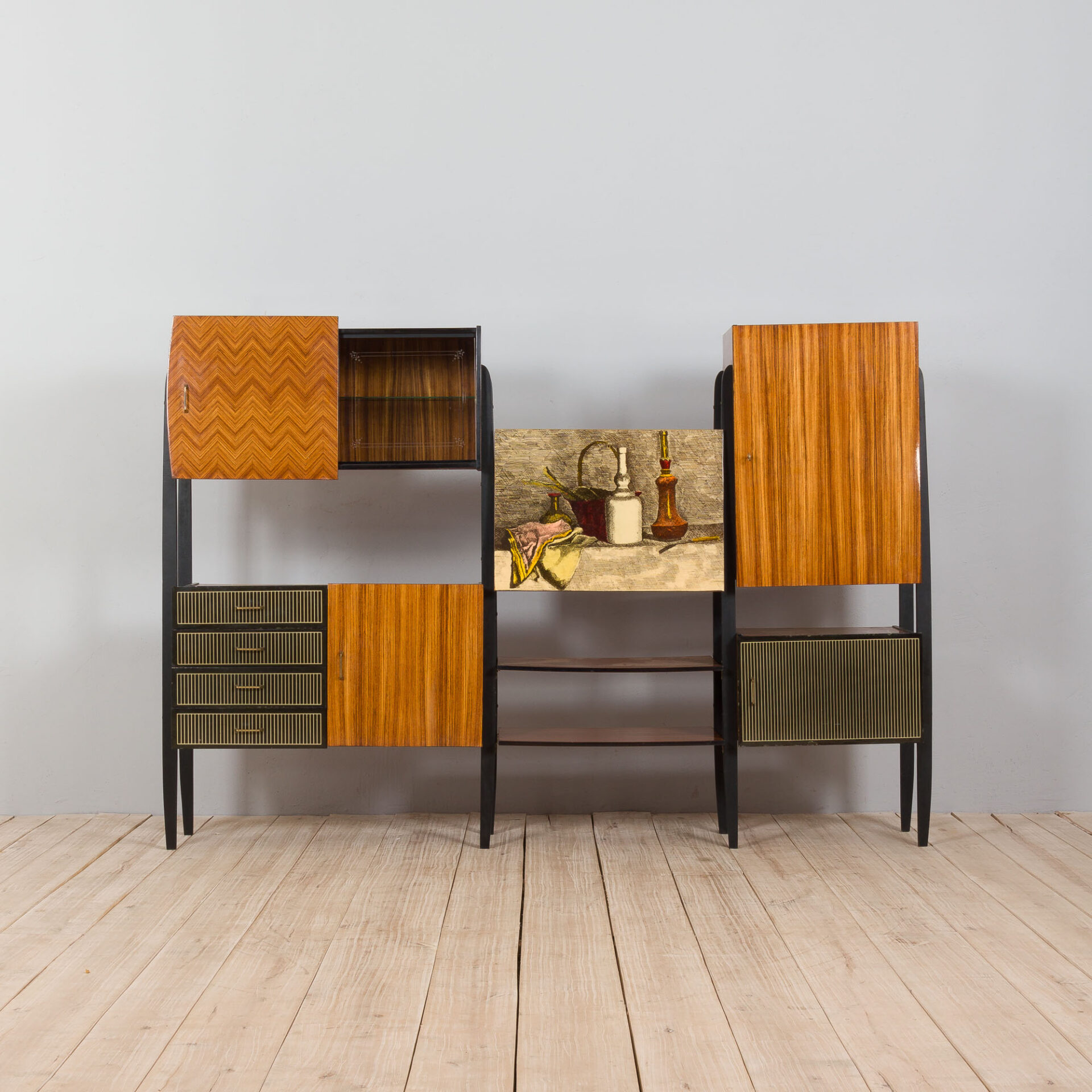 Mid century modern Italian wall unit in Dassi, Fornasetti style, 1950s.