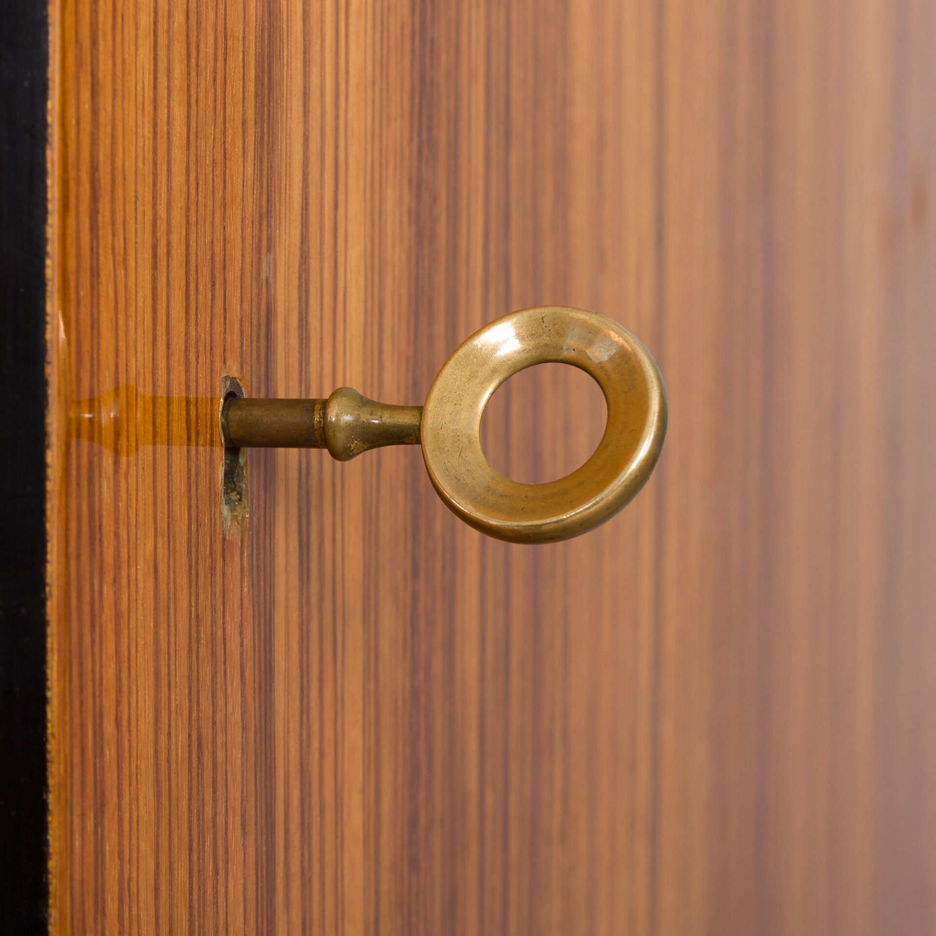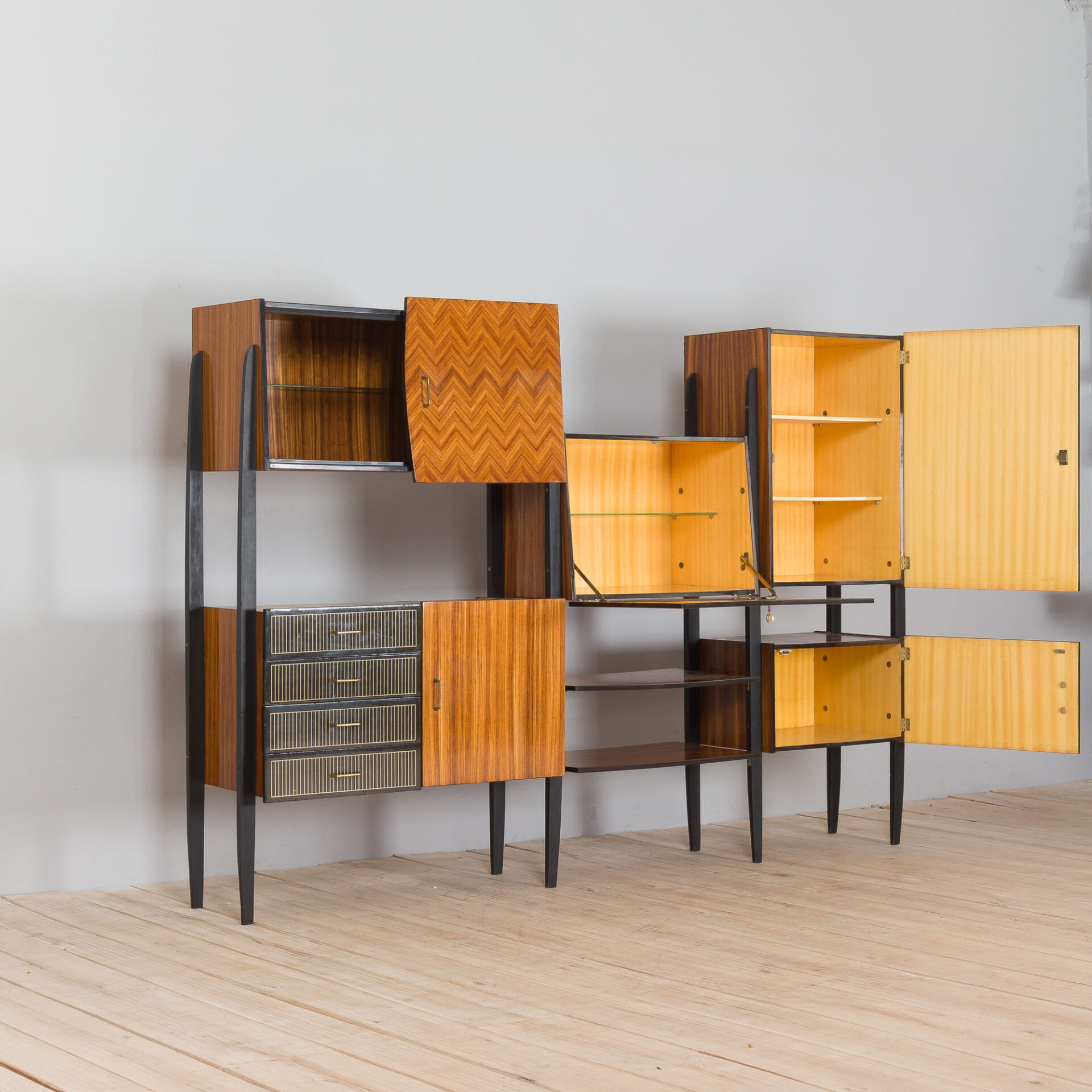 This wall unit is made of lacquered walnut veneer, partly painted, and has brass details. The uprights are black painted beech and very nicely shaped. There are plenty of storage options in this cabinet but also some nice open areas to display pieces.