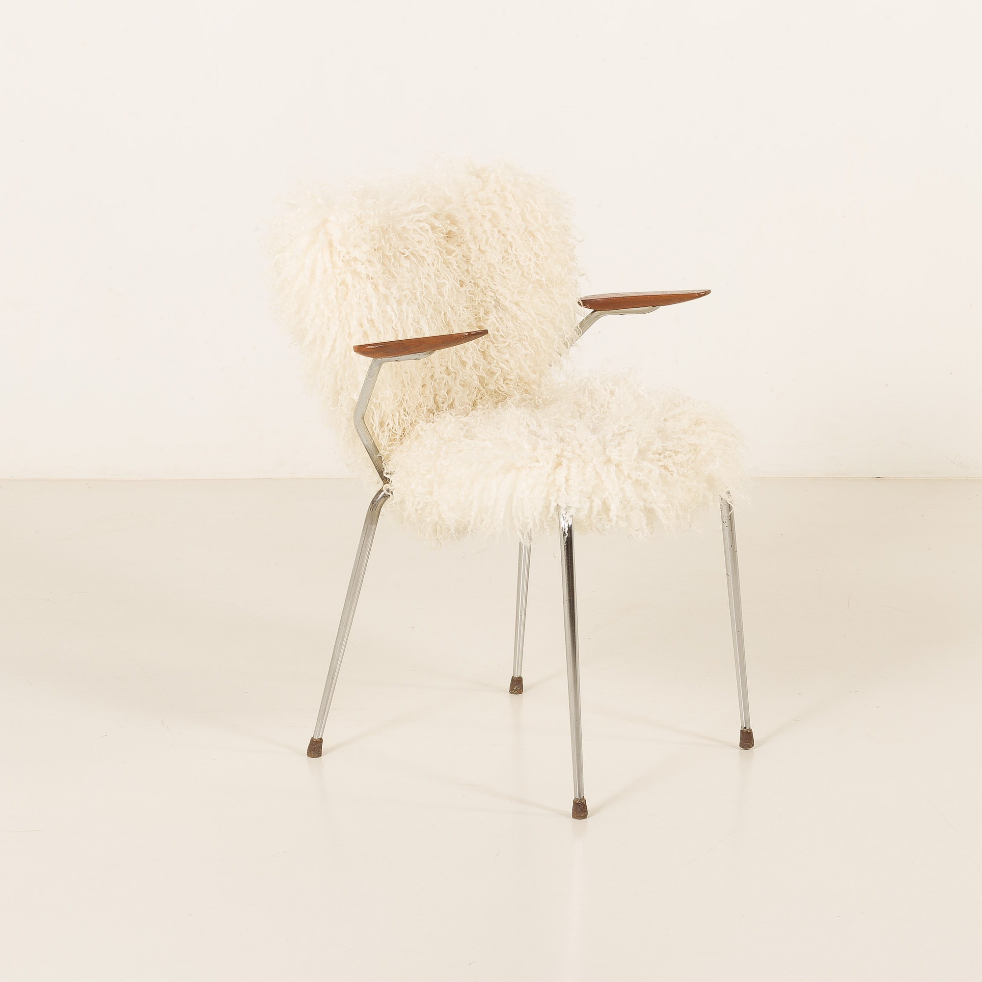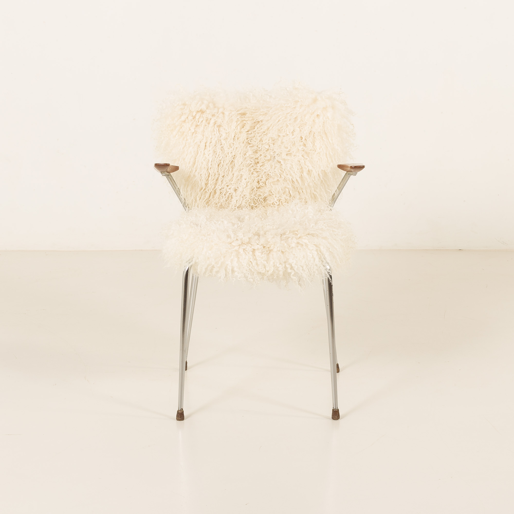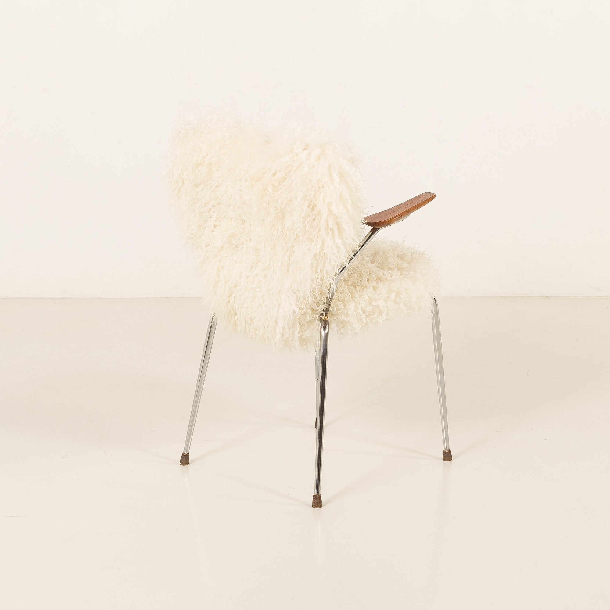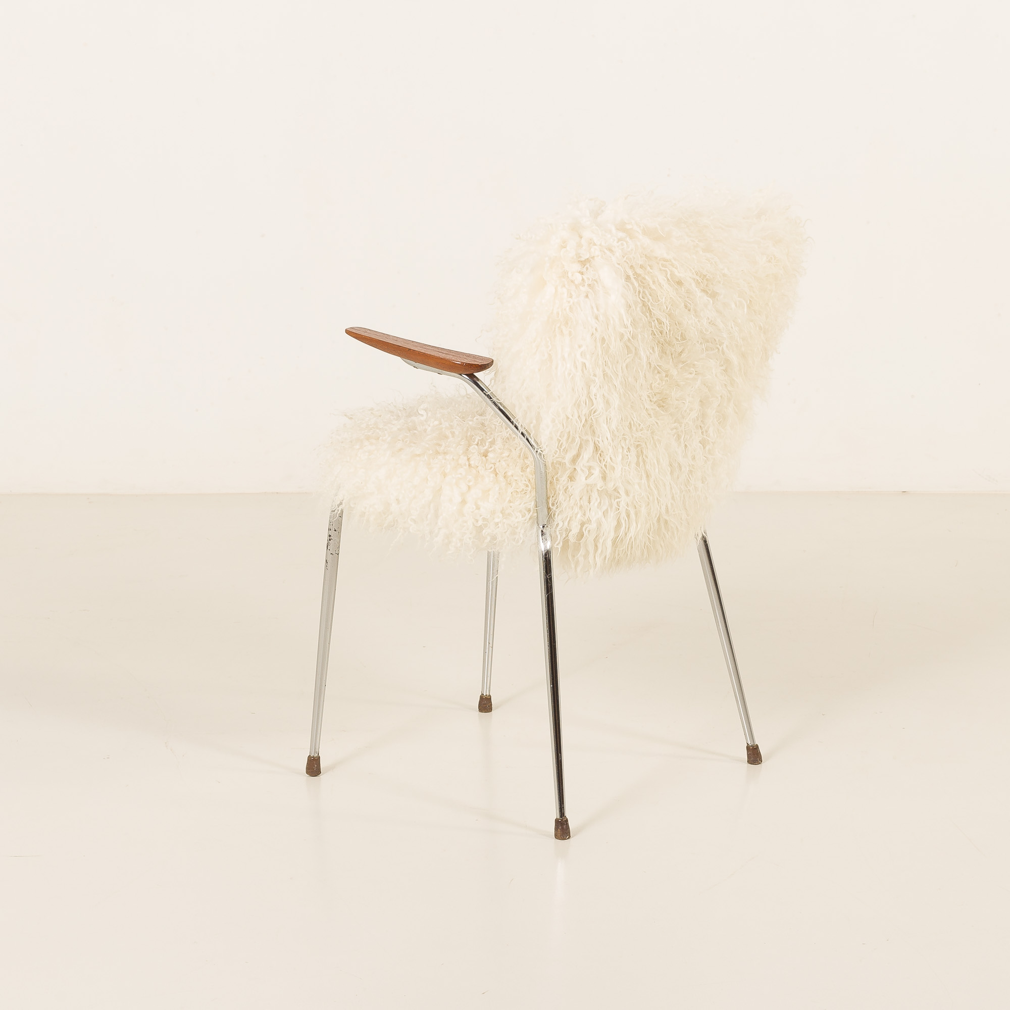 This mid-century chair comes from Denmark, from the 1950s, and closely resembles the style of Arne Jacobsen’s projects and has been reupholstered in long hair fully natural sheepskin.