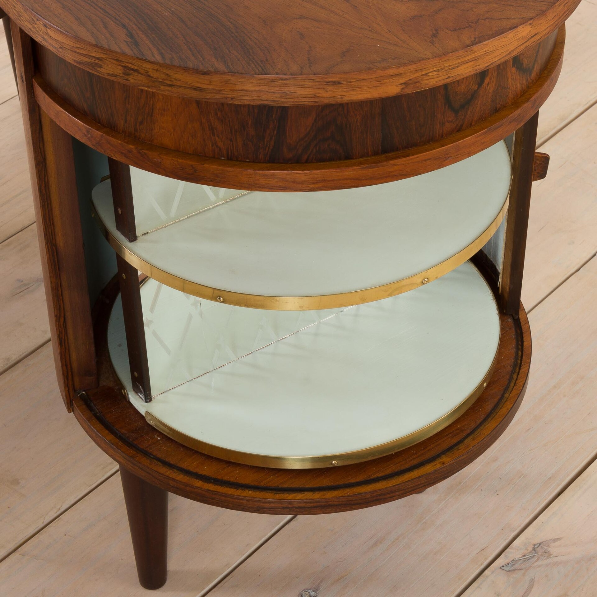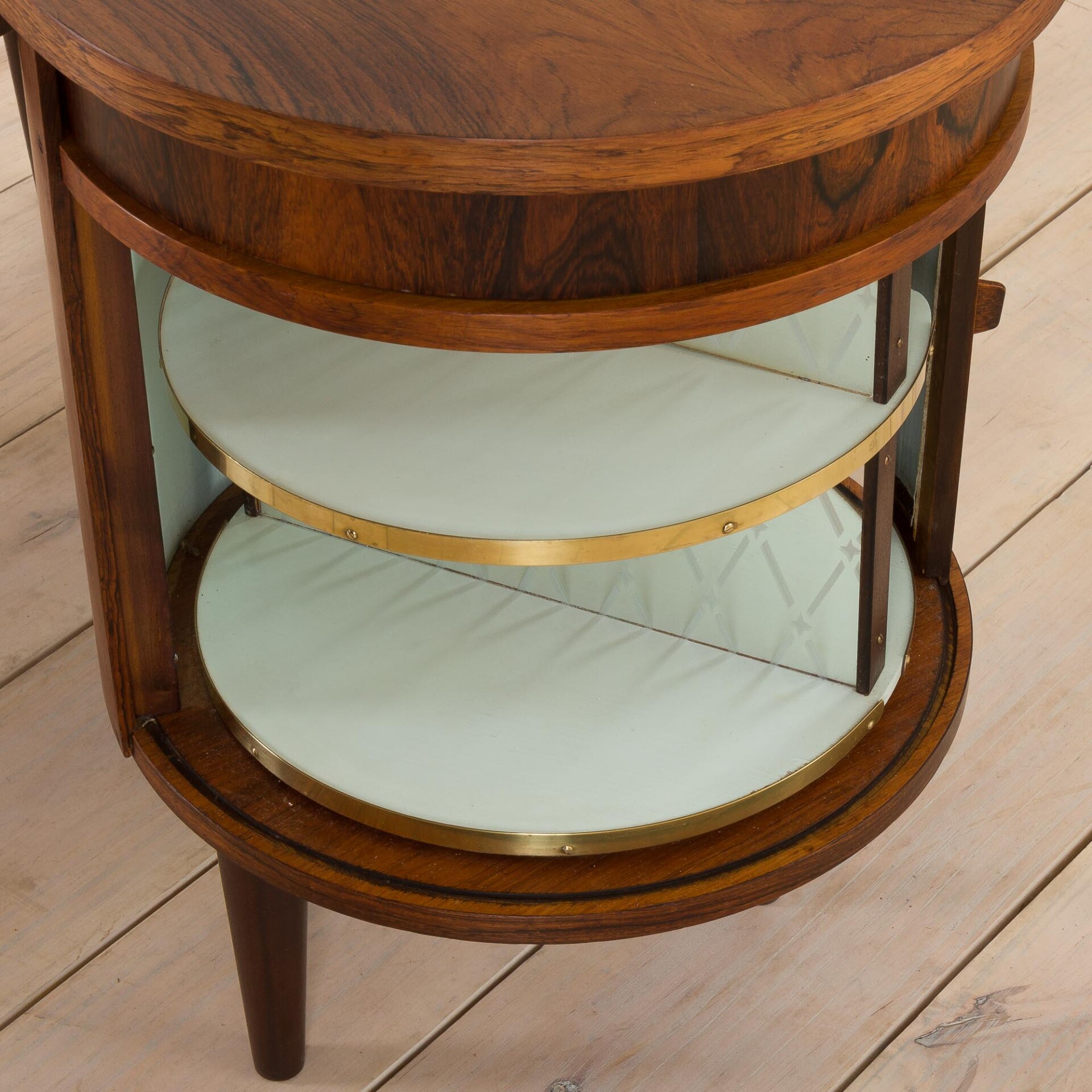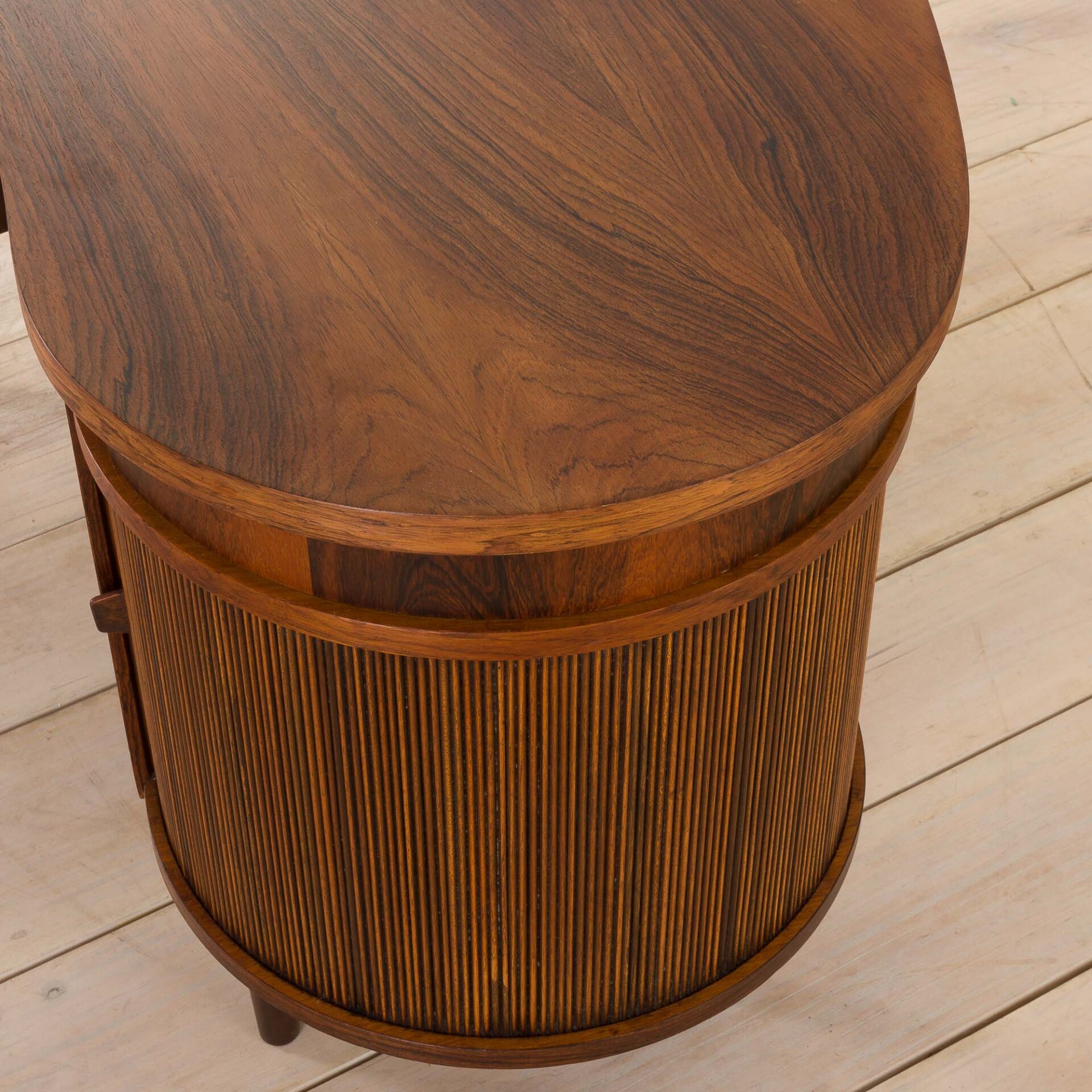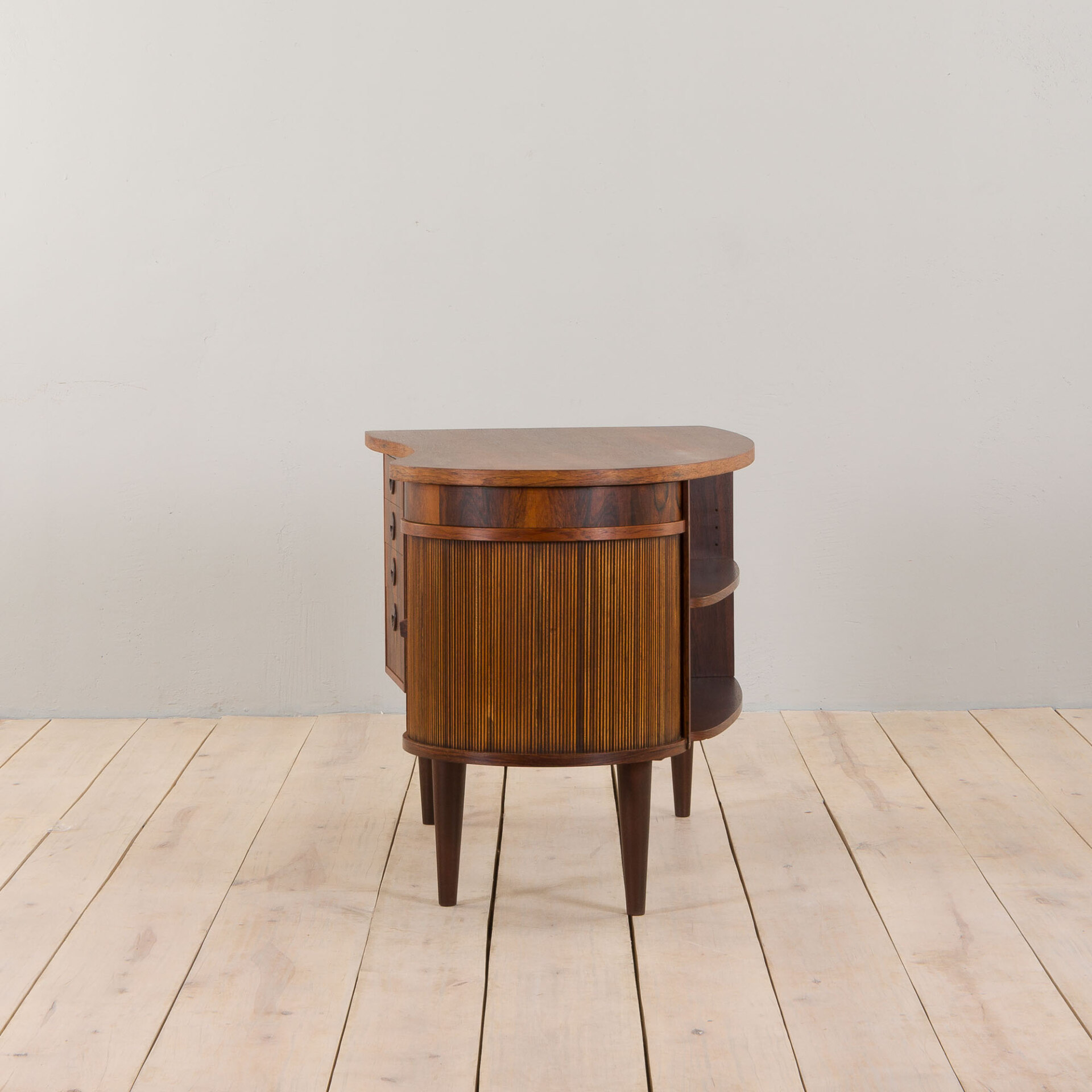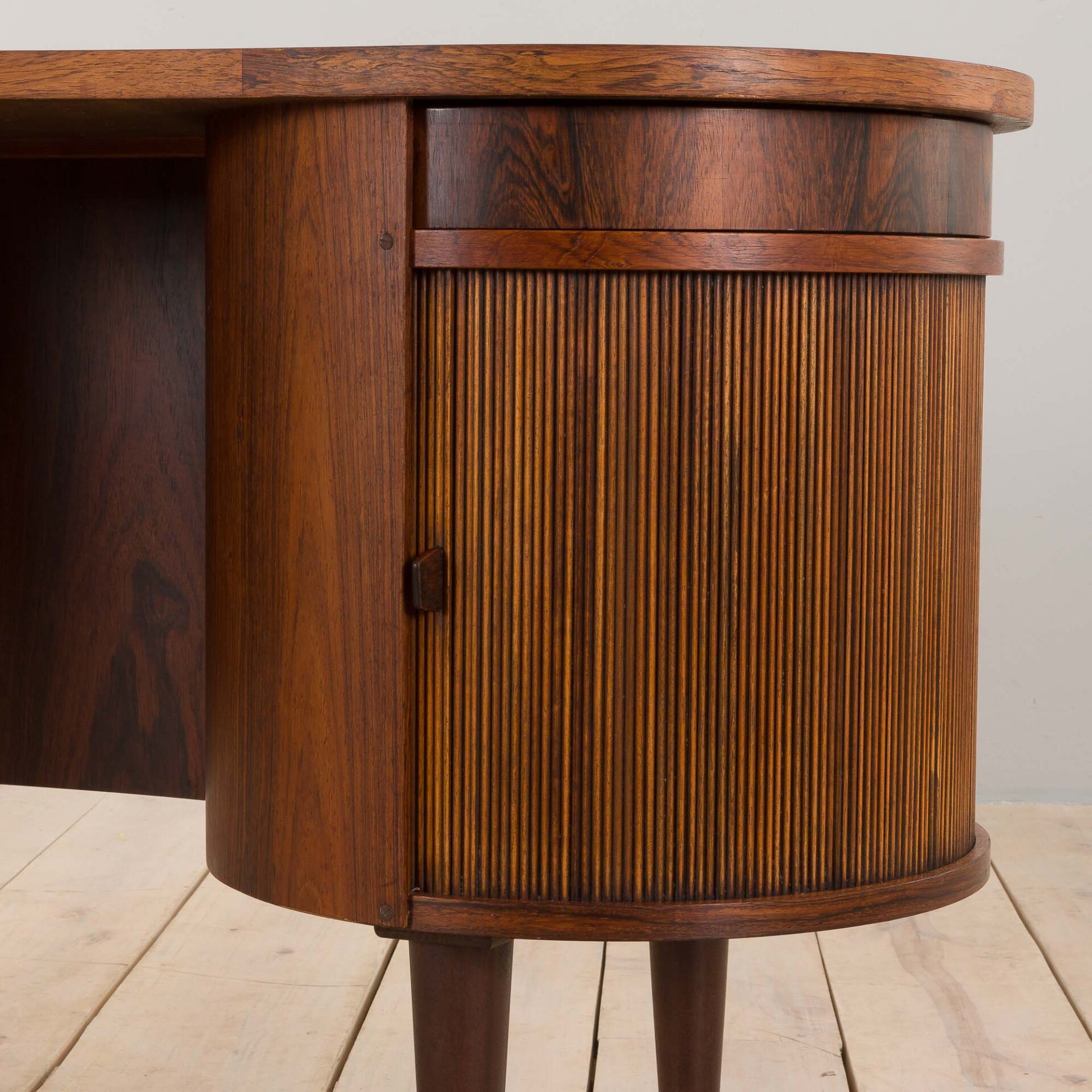 This stunning vintage desk by Kai Kristiansen was manufactured by Feldballes Møbelfabrik in Denmark in the 50s. It is made of rosewood veneer and features a remarkably shaped top with beautiful wood grain. A bar cabinet is hidden behind the tambour doors with pivoting shelves and etched mirrors, and a circular storage section for trinkets – pull-out from under the desktop. This vintage desk also features four drawers in front, the top one lockable (key included ), and open storage space at the back as two adjustable shelves useful for books and magazines. This absolutely magnificent piece represents mastery of danish mid-century carpentry, evident in the beautifully grained wood and the precision of details. Legs are detachable for more convenient transport.