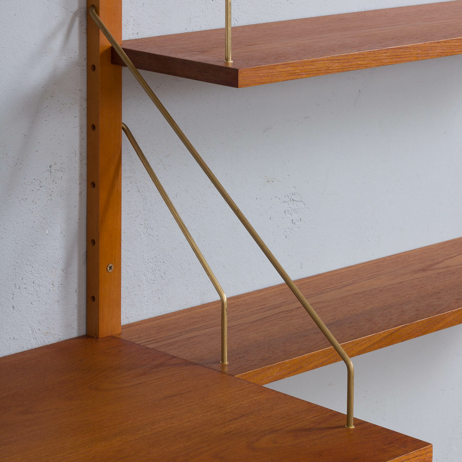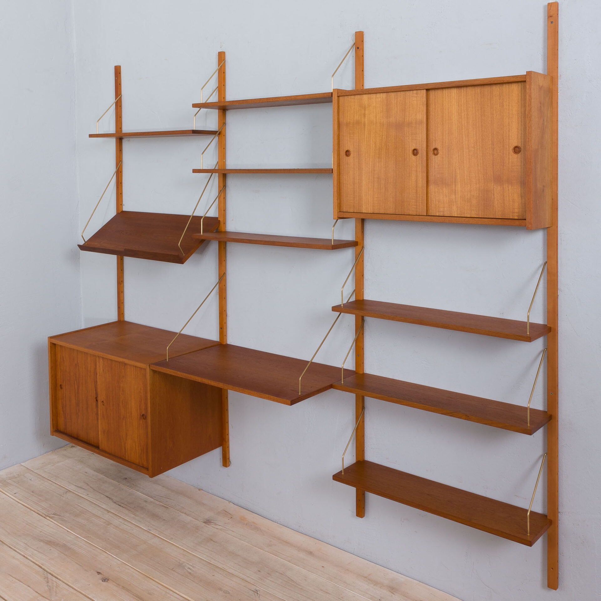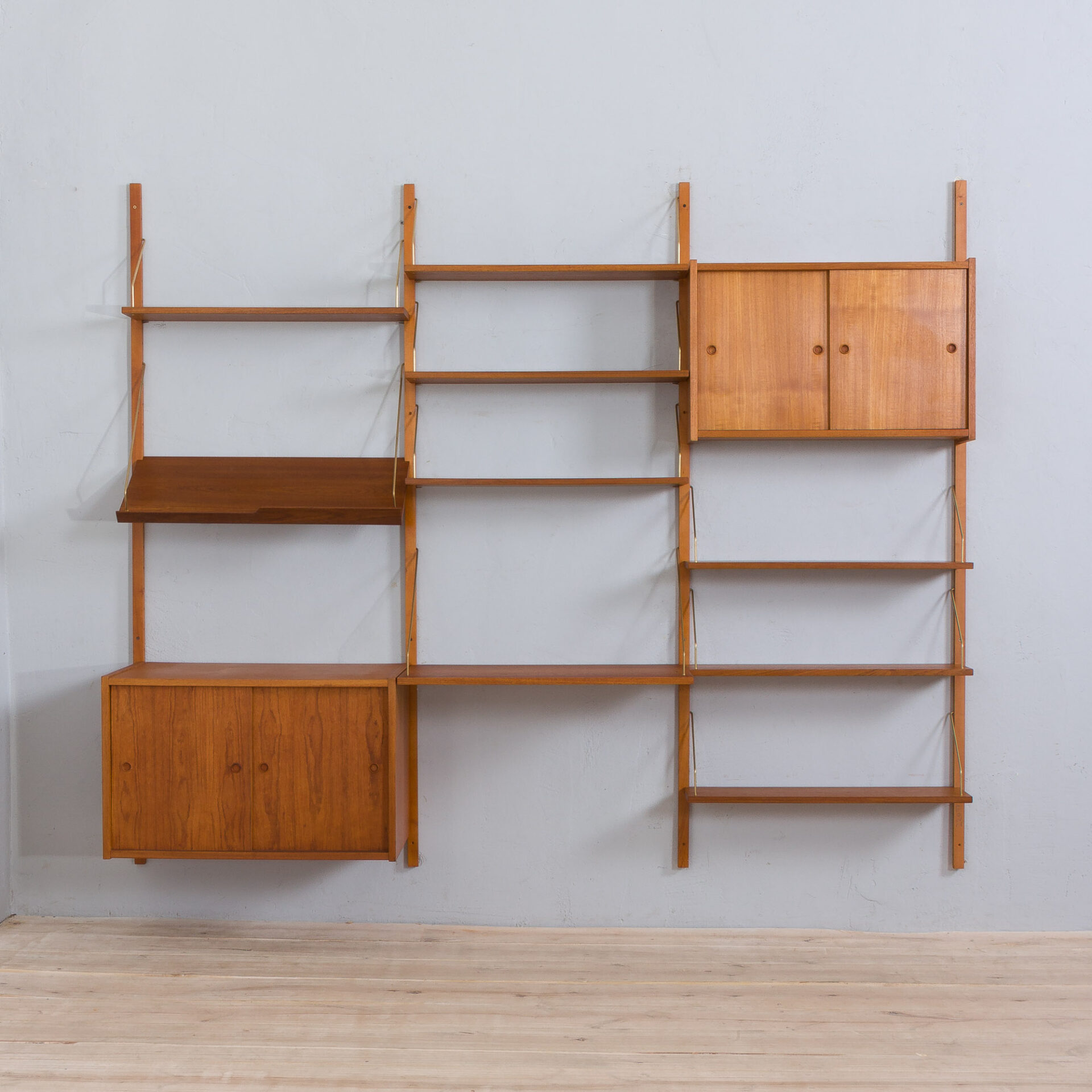 Modular teak wall unit with 2 cabinets and home office desk, PS Sorensen Cadovius shelving system, Denmark 60s