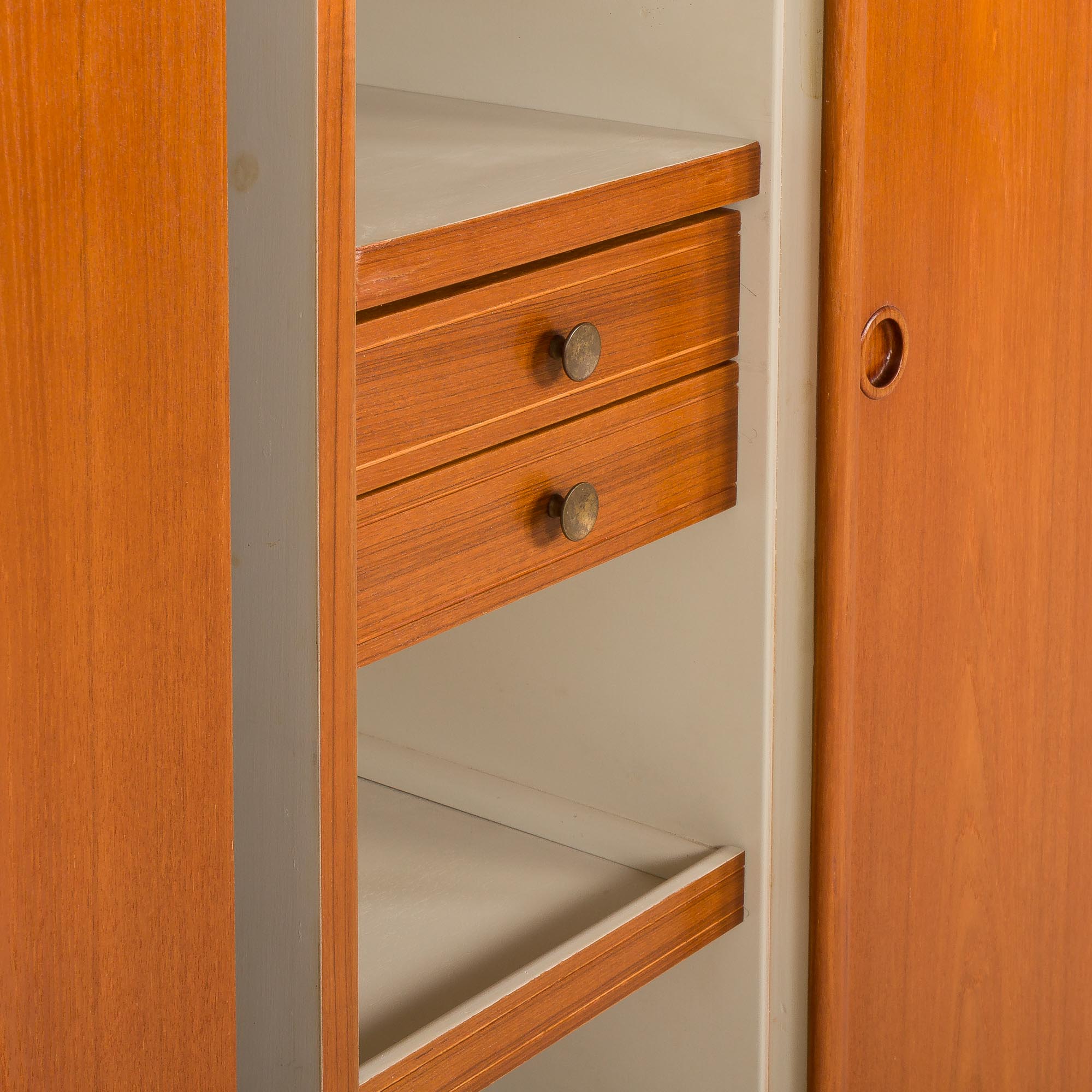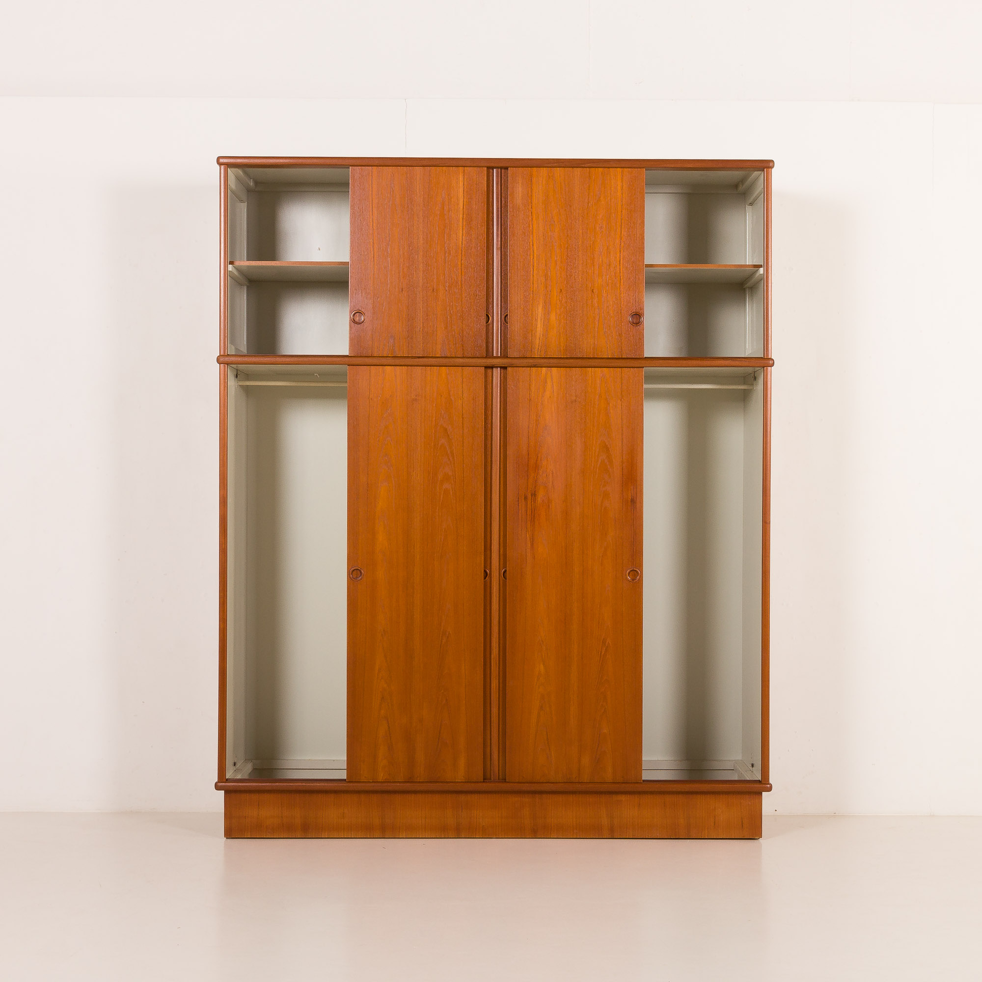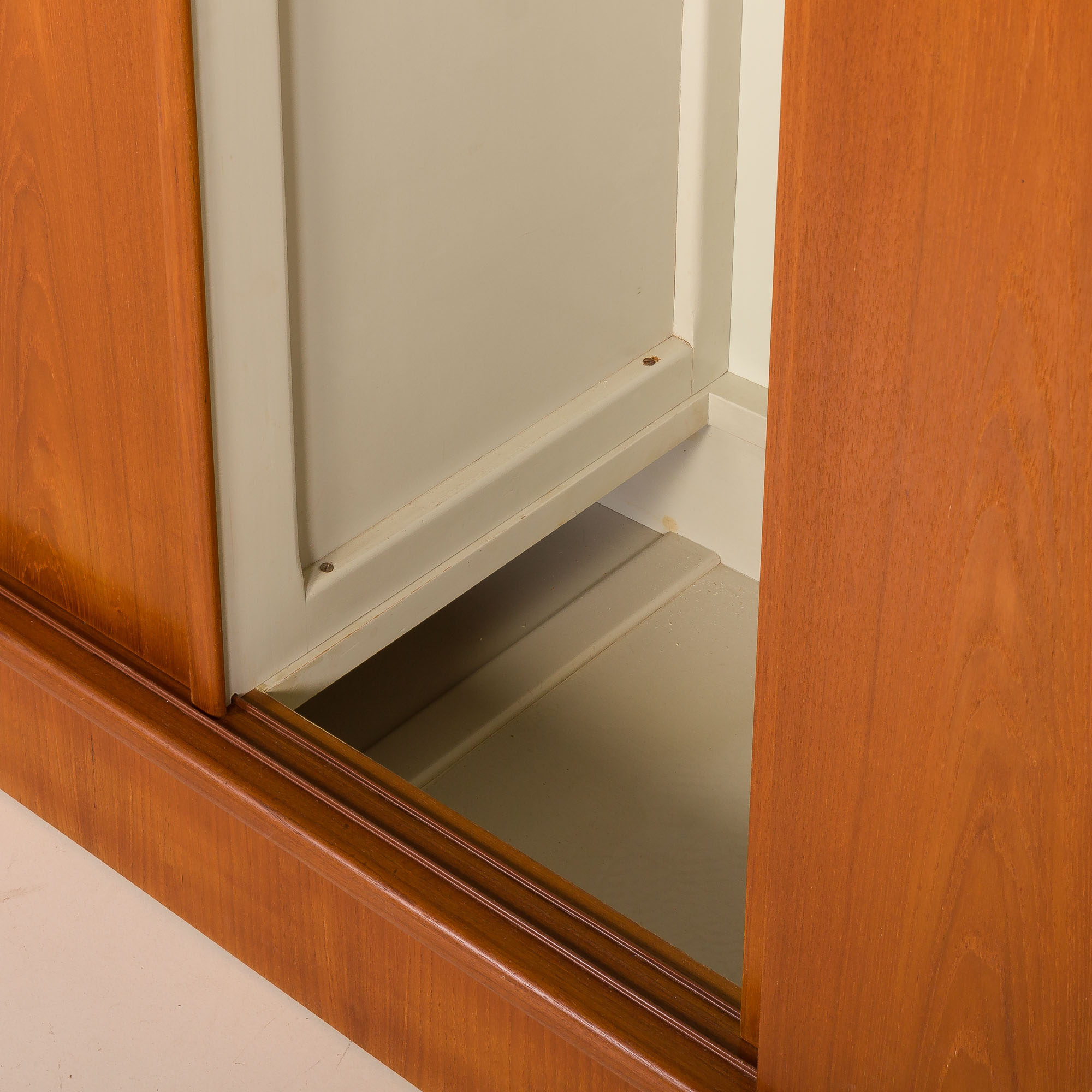 The wardrobe features eight sliding doors with matching teak veneer and slightly curved edges, a space-saving solution that enhances its practicality in any room. The wardrobe’s interior is designed for ample storage, painted in an off-white color, offering a clean and bright contrast to the rich teak exterior. It has four separate compartments, each tailored to meet diverse storage needs. An unusual gadget in this wardrobe is a hidden mirror that can be pulled out. It is a perfect piece for a hallway, living room, or an office. Wherever storage must be organized with class and elegance. The wardrobe comes fully apart.