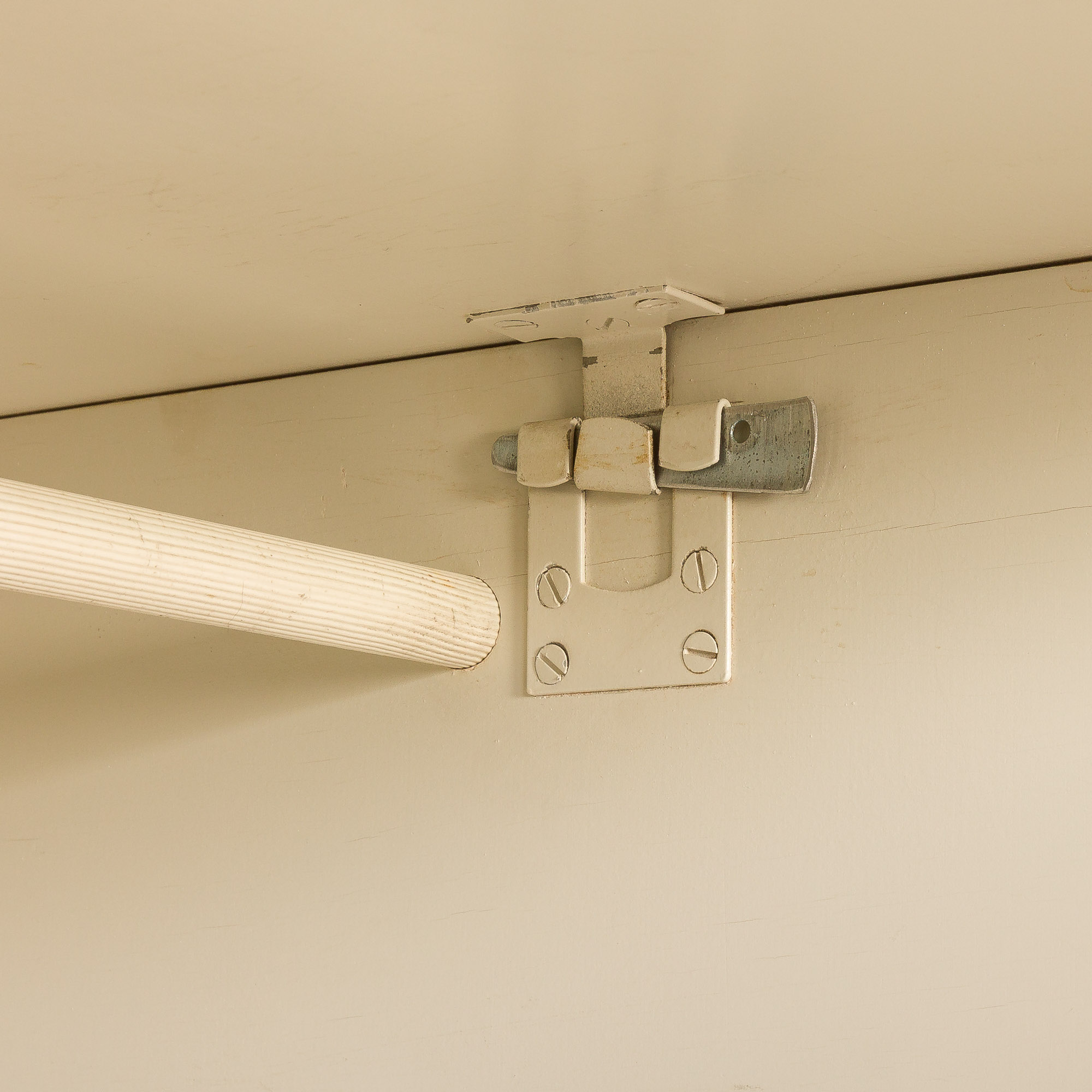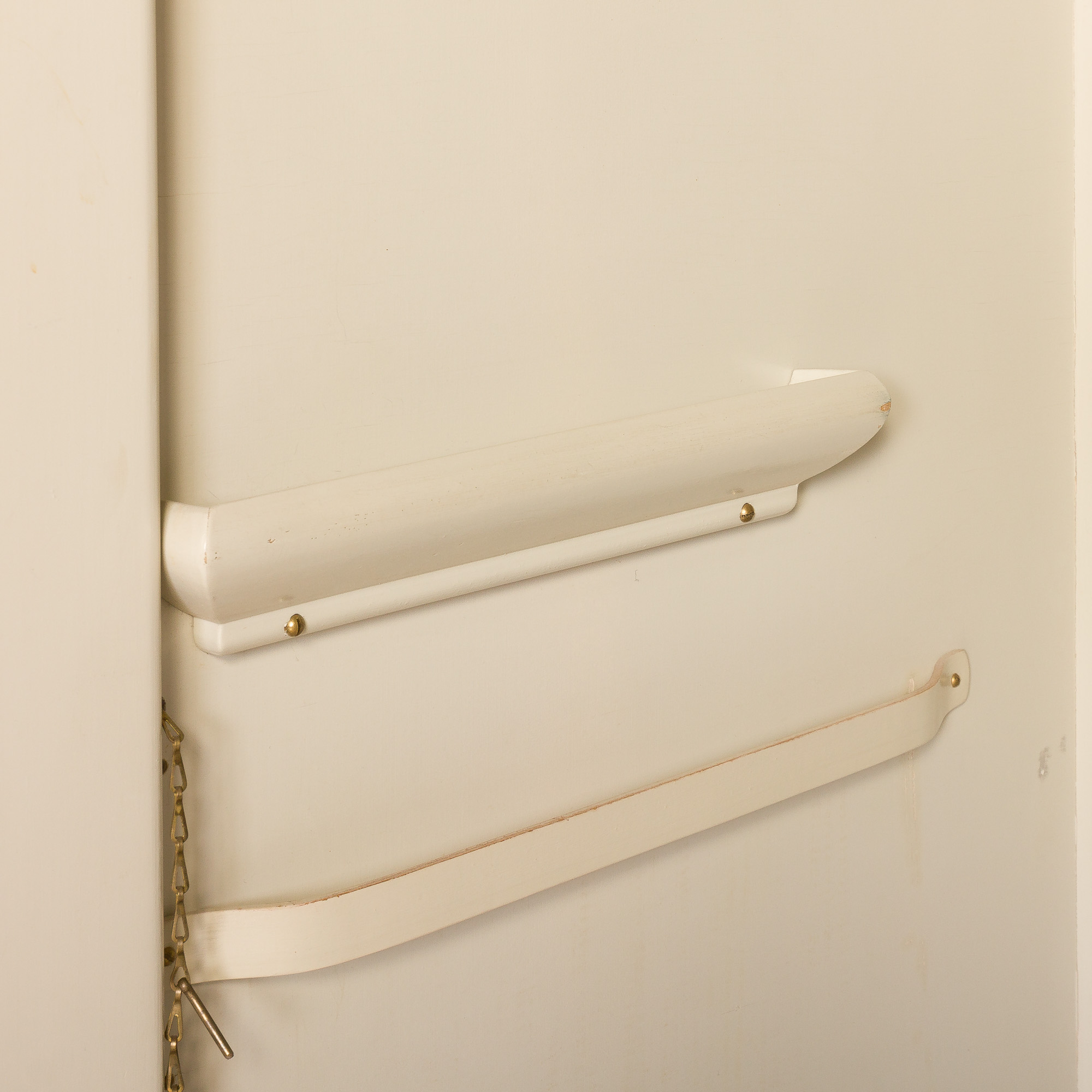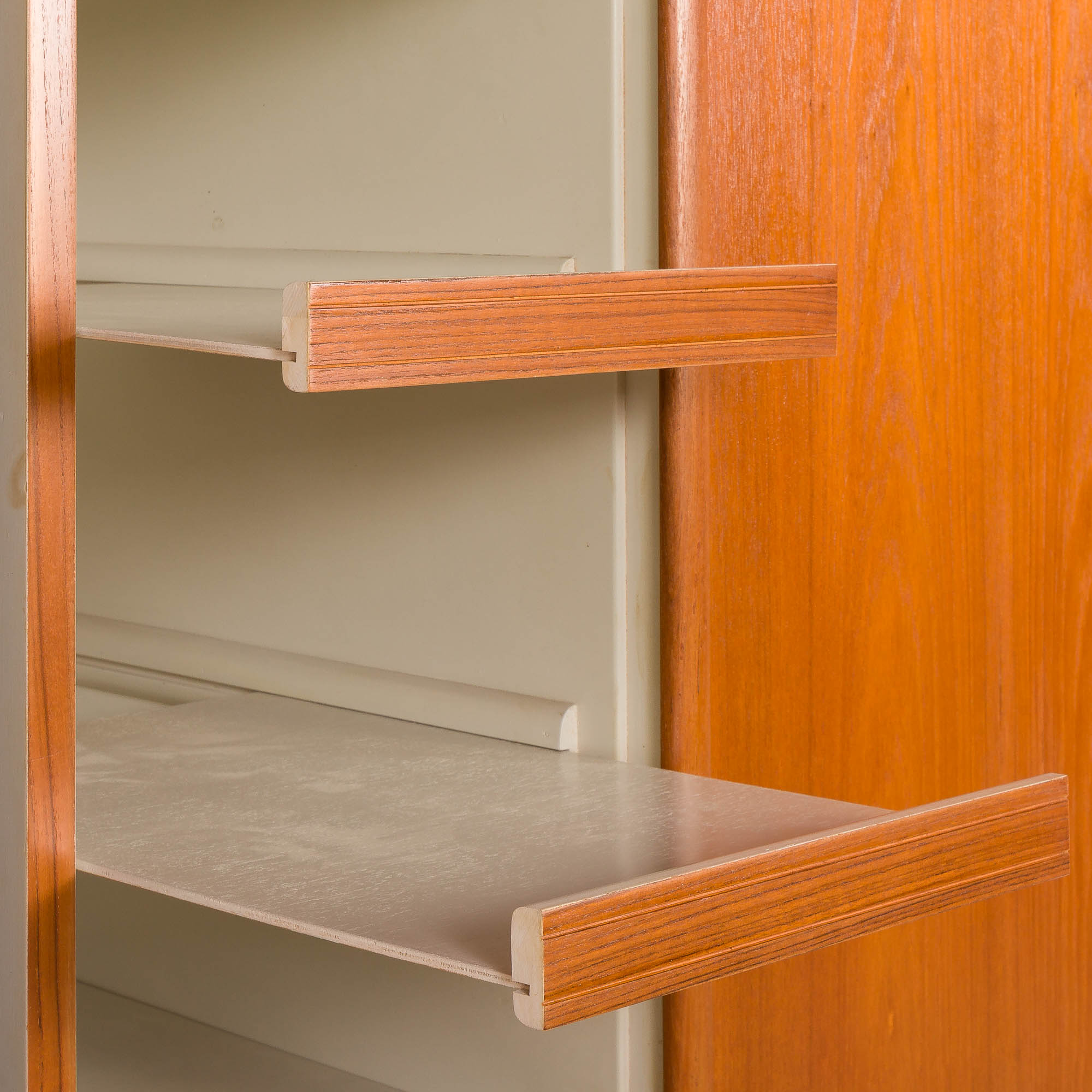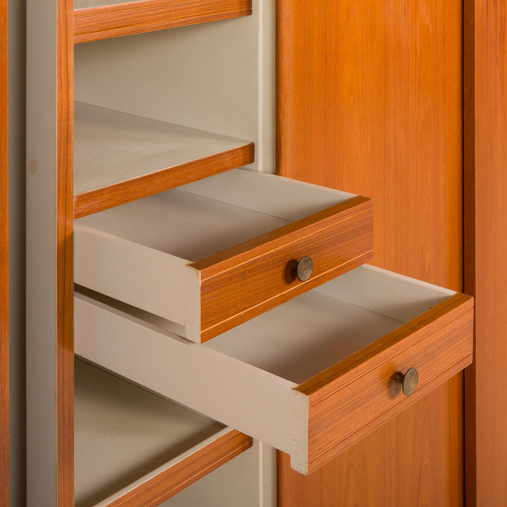 The wardrobe features eight sliding doors with matching teak veneer and slightly curved edges, a space-saving solution that enhances its practicality in any room. The wardrobe’s interior is designed for ample storage, painted in an off-white color, offering a clean and bright contrast to the rich teak exterior. It has four separate compartments, each tailored to meet diverse storage needs. An unusual gadget in this wardrobe is a hidden mirror that can be pulled out. It is a perfect piece for a hallway, living room, or an office. Wherever storage must be organized with class and elegance. The wardrobe comes fully apart.