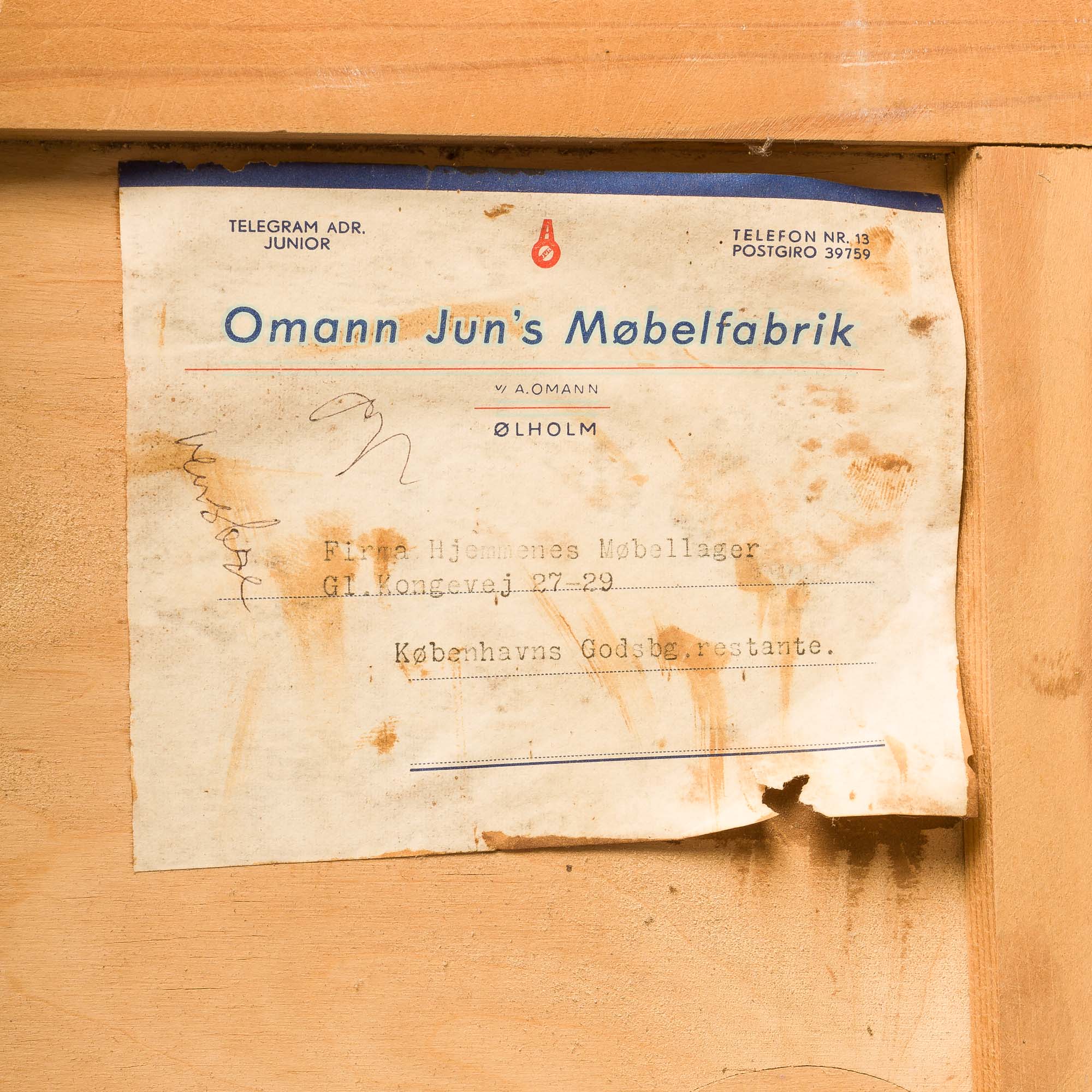 The wardrobe has been fully renovated. The wood has been cleaned and refreshed with layers of Danish oil. It enhances the grain look and provides protection. Doors work smoothly. Fantastic condition, ready to use in your home or office. The interior paint is original and in very good condition. It bears the original Omann Jun Møbelfabrik label on the back, confirming its authenticity and origin.