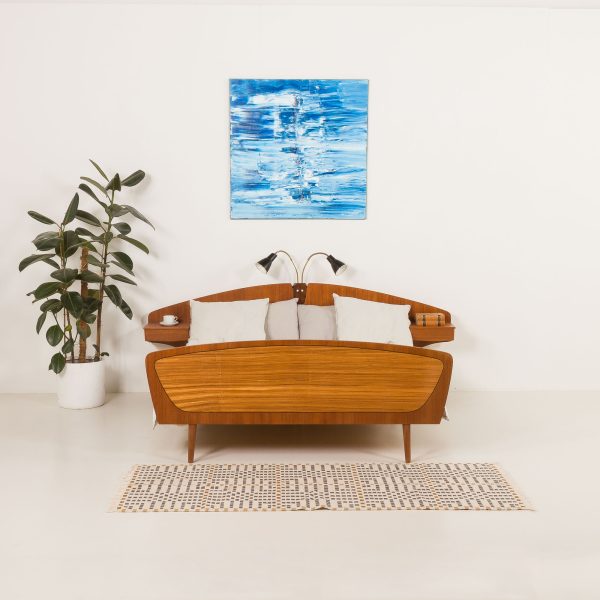 • Scandinavian mid century queen size bed with nightstands and a lamp, Norway 1950s
