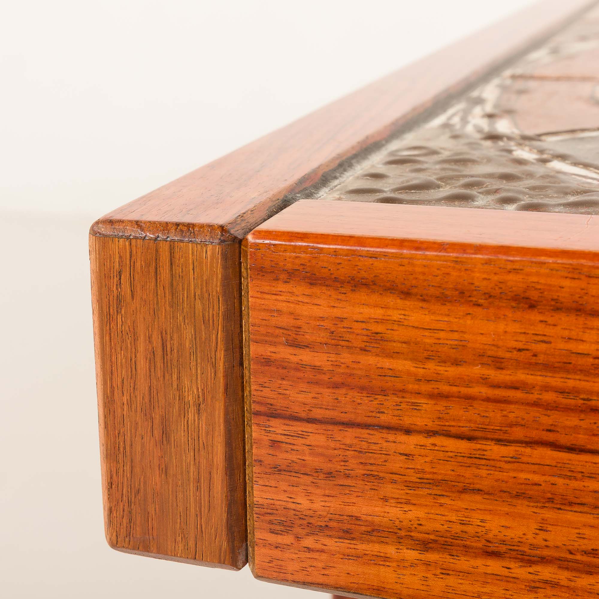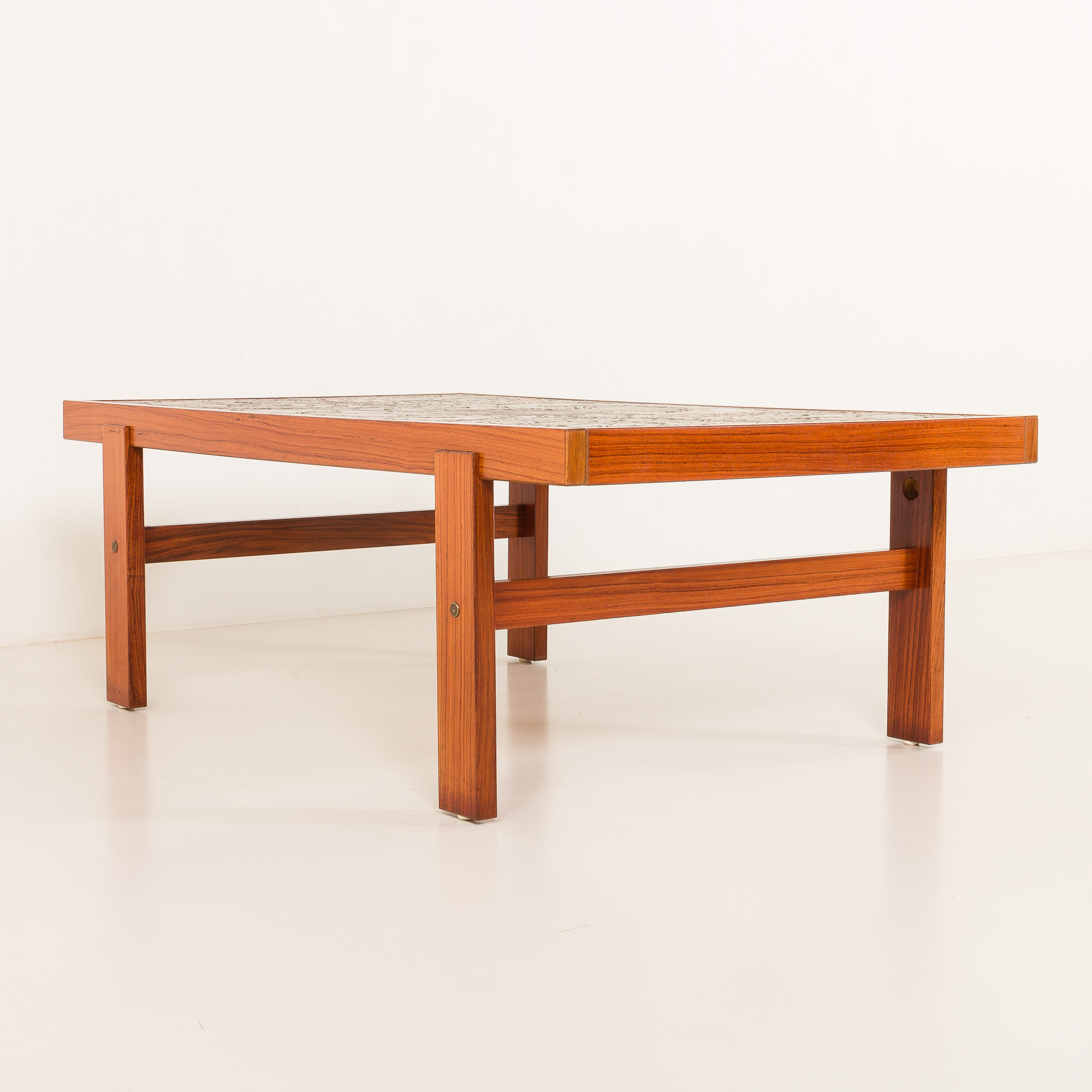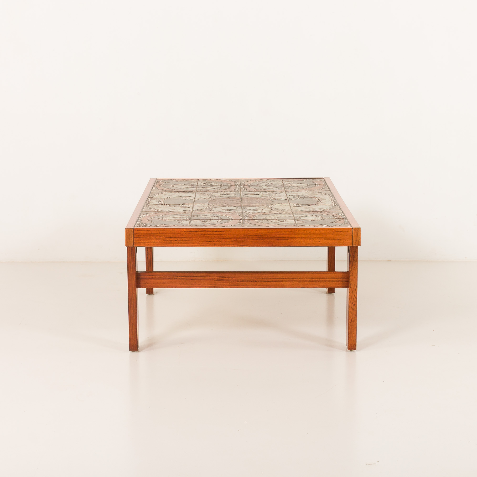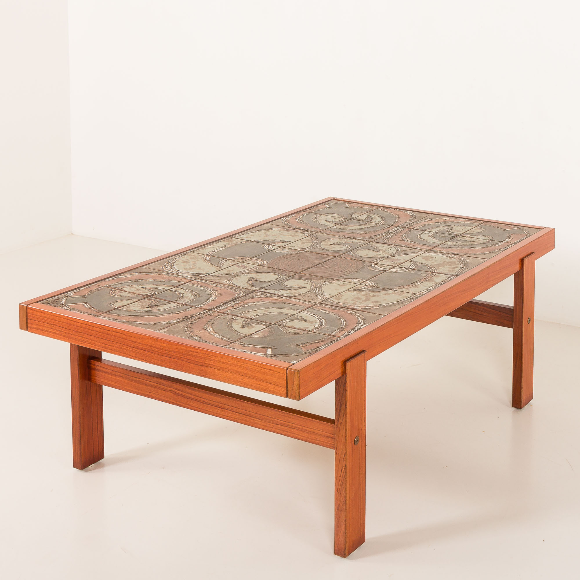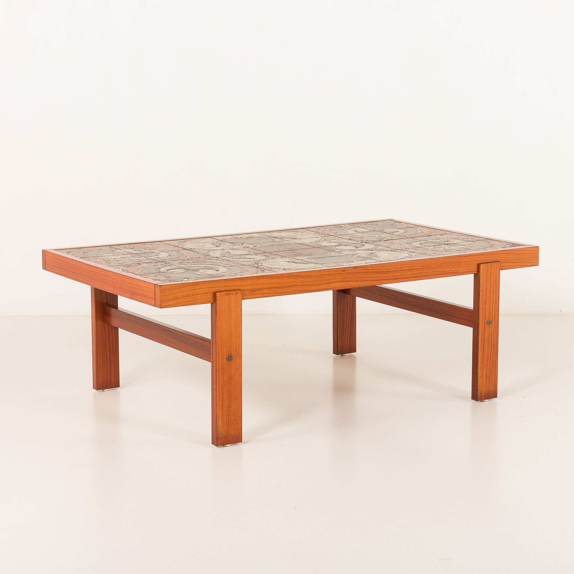 The rectangular teak frame is beautifully crafted, emphasizing clean Scandinavian lines and warm natural color. The ceramic inlay adds a sculptural and tactile dimension, turning the tabletop into a piece of art. Each tile is unique, reflecting the craftsmanship and creative spirit characteristic of Danish design from this period.