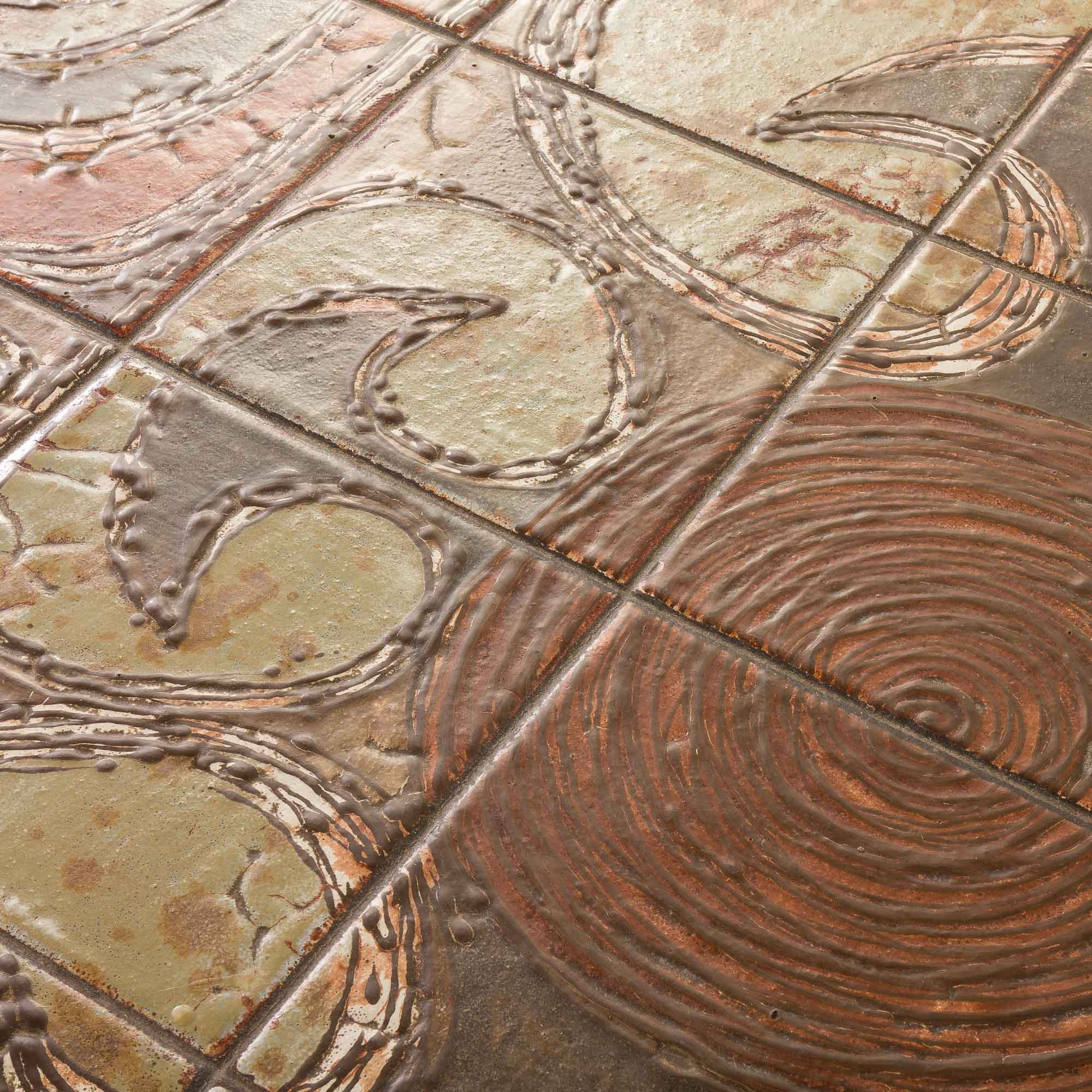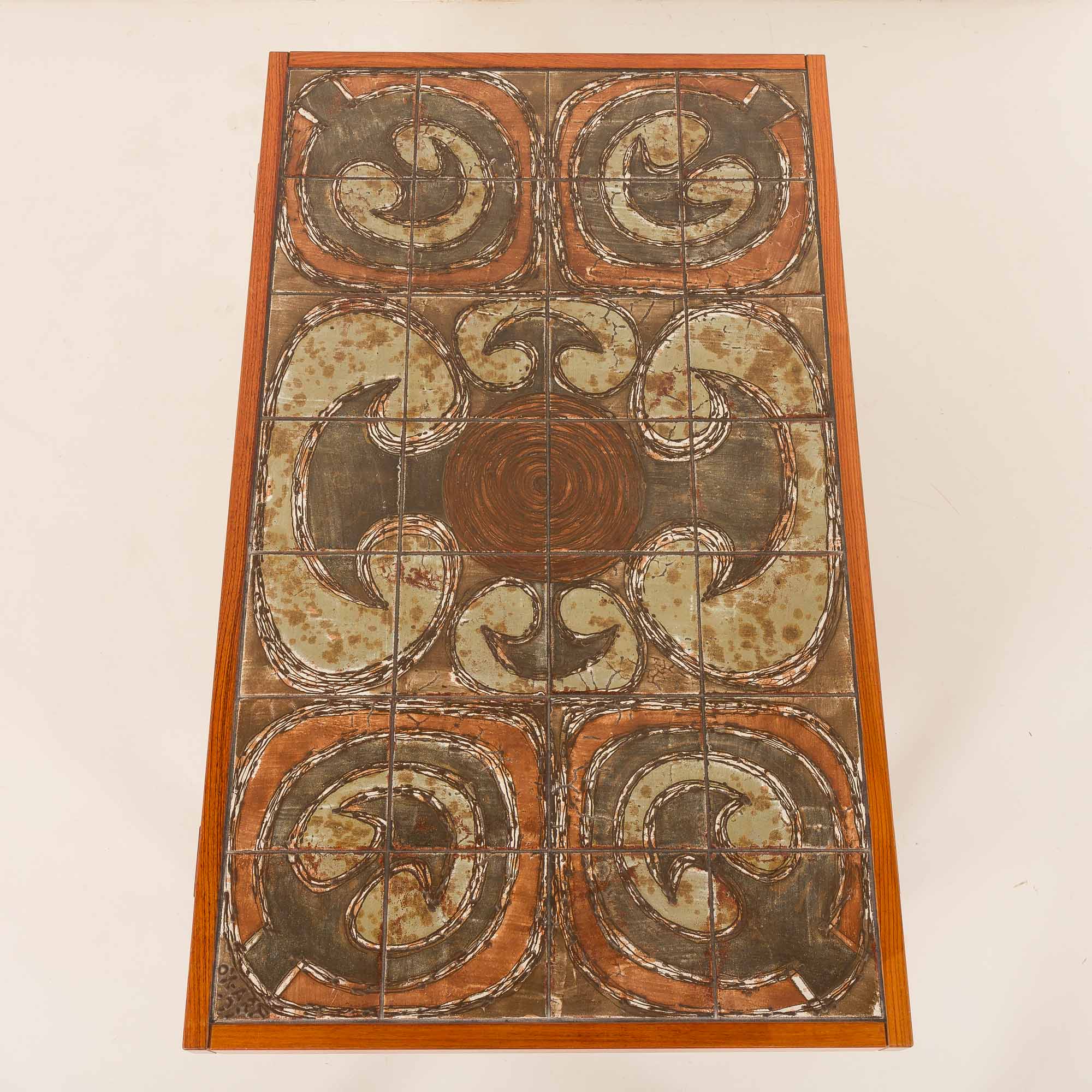 Striking Danish Ox Art extra-large coffee table from the 1970s, combining solid teak wood with a richly textured ceramic tile top. The table showcases the distinctive Ox Art style, known for its artistic compositions of hand-glazed tiles featuring abstract, organic patterns and earthy tones.