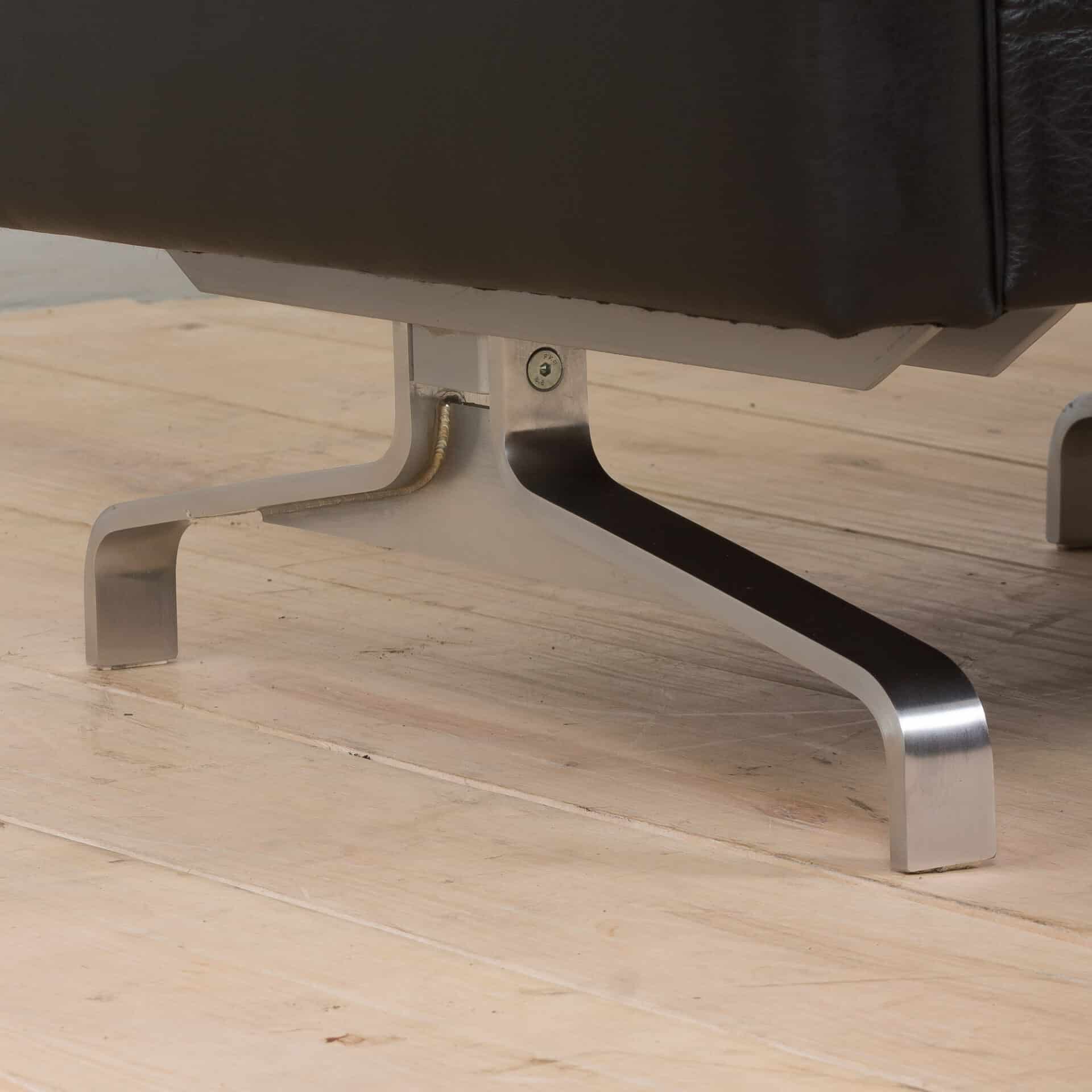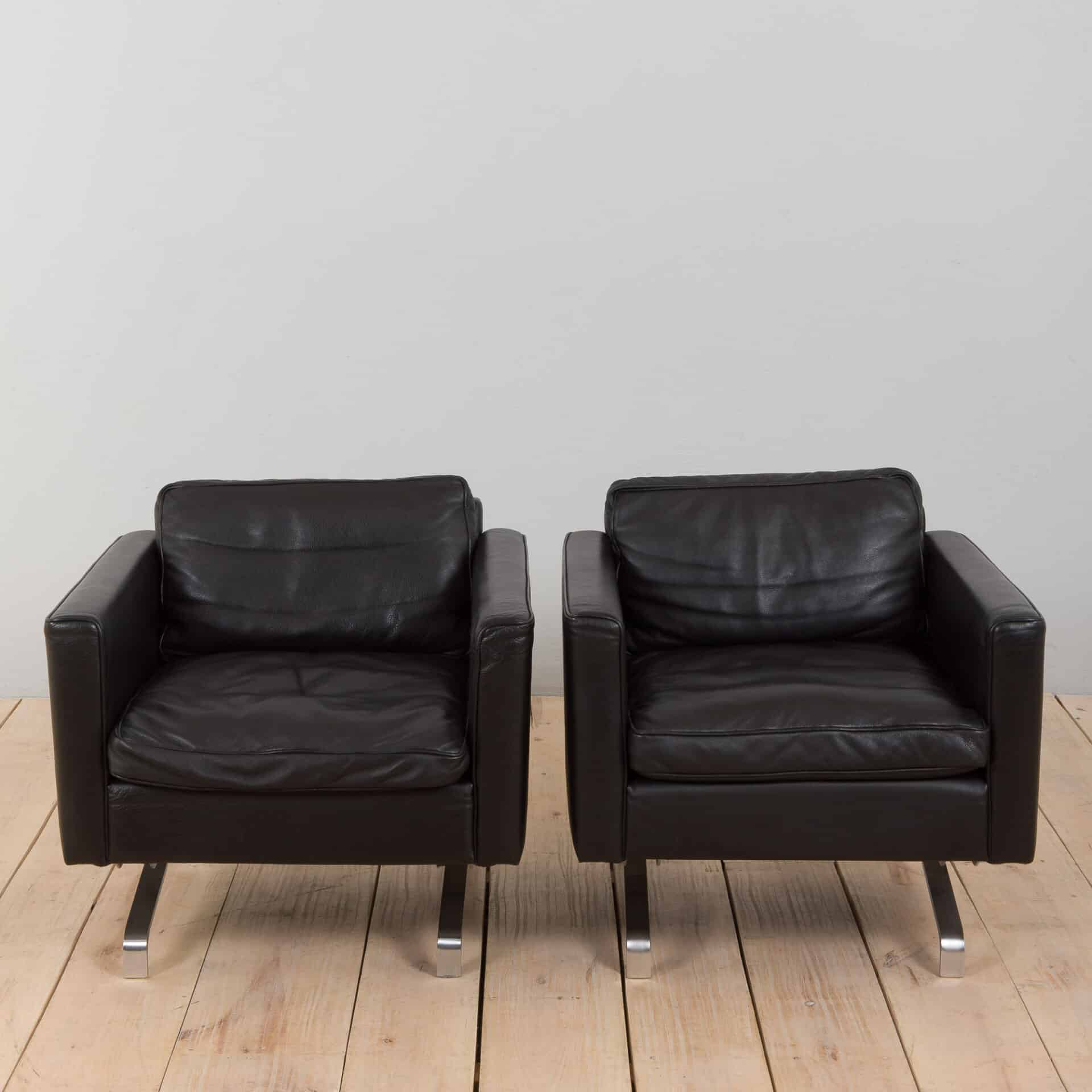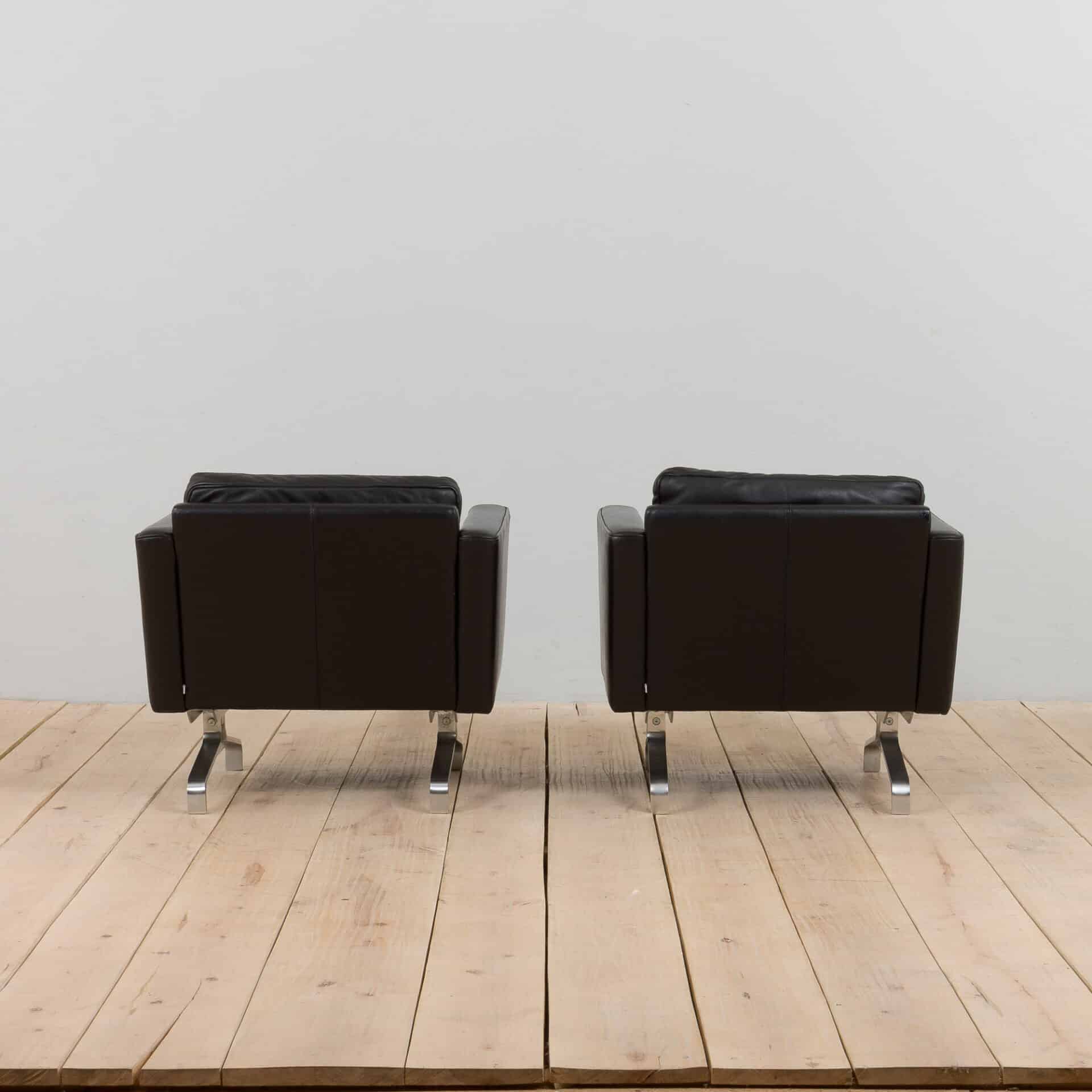 Pair of black leather and stainless steel lounge chairs closely corresponding to PK 31 chairs designed by Poul Kjaerholm. The armchairs are constructed of soft aniline leather and quality stainless steel combinig elegant luxury with comfort. The set is suitable for any environment, from lounges and waiting areas to private homes. Excellent vintage condition with minor traces and light patina. Clean liner under the loose cushions. The stainless steel is in perfect condition.