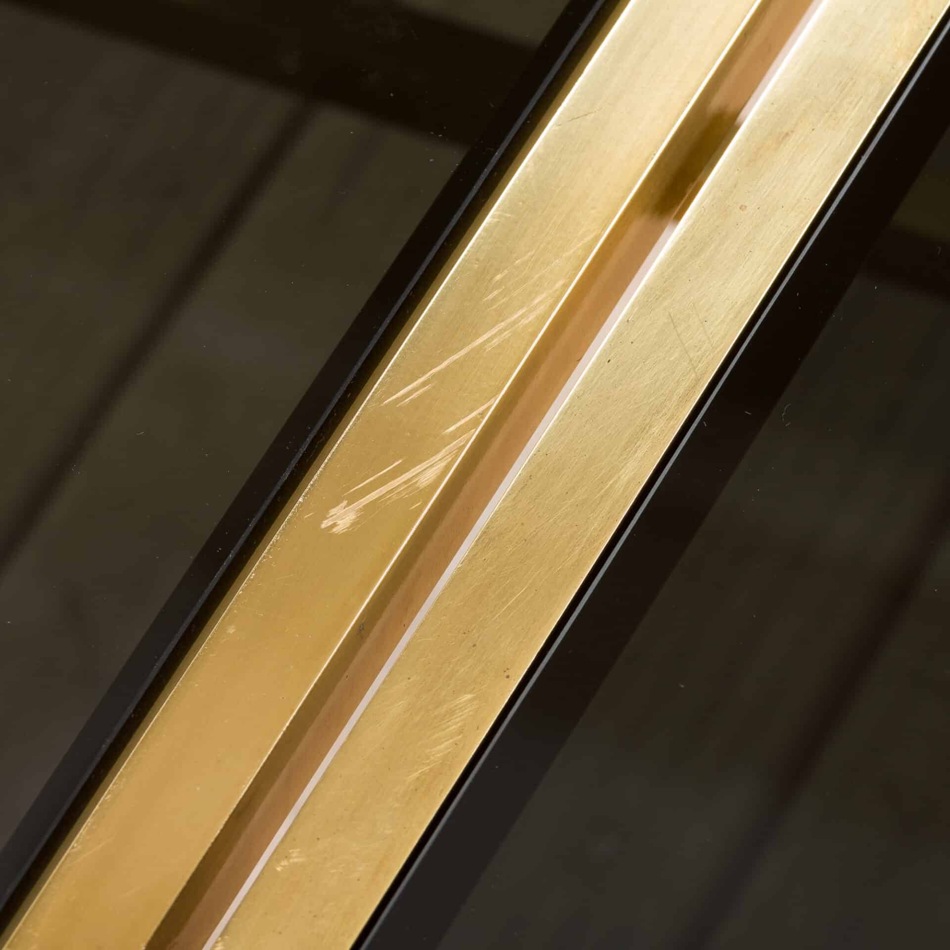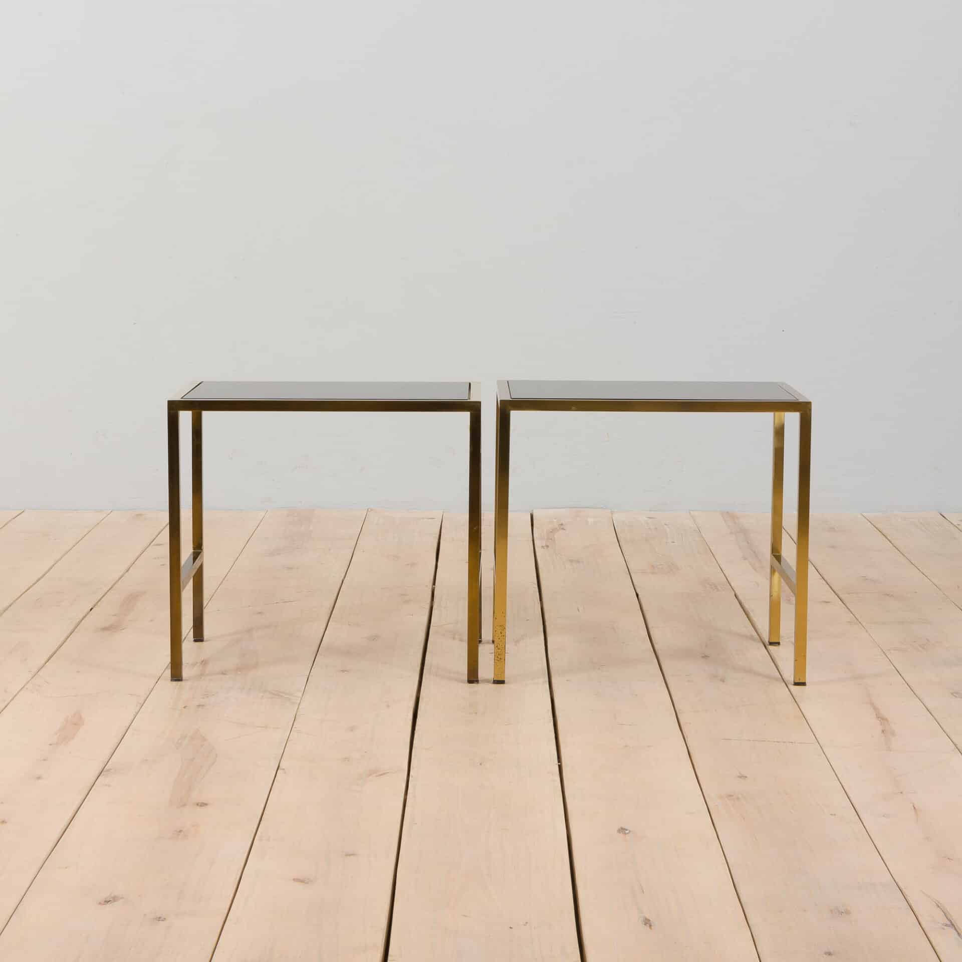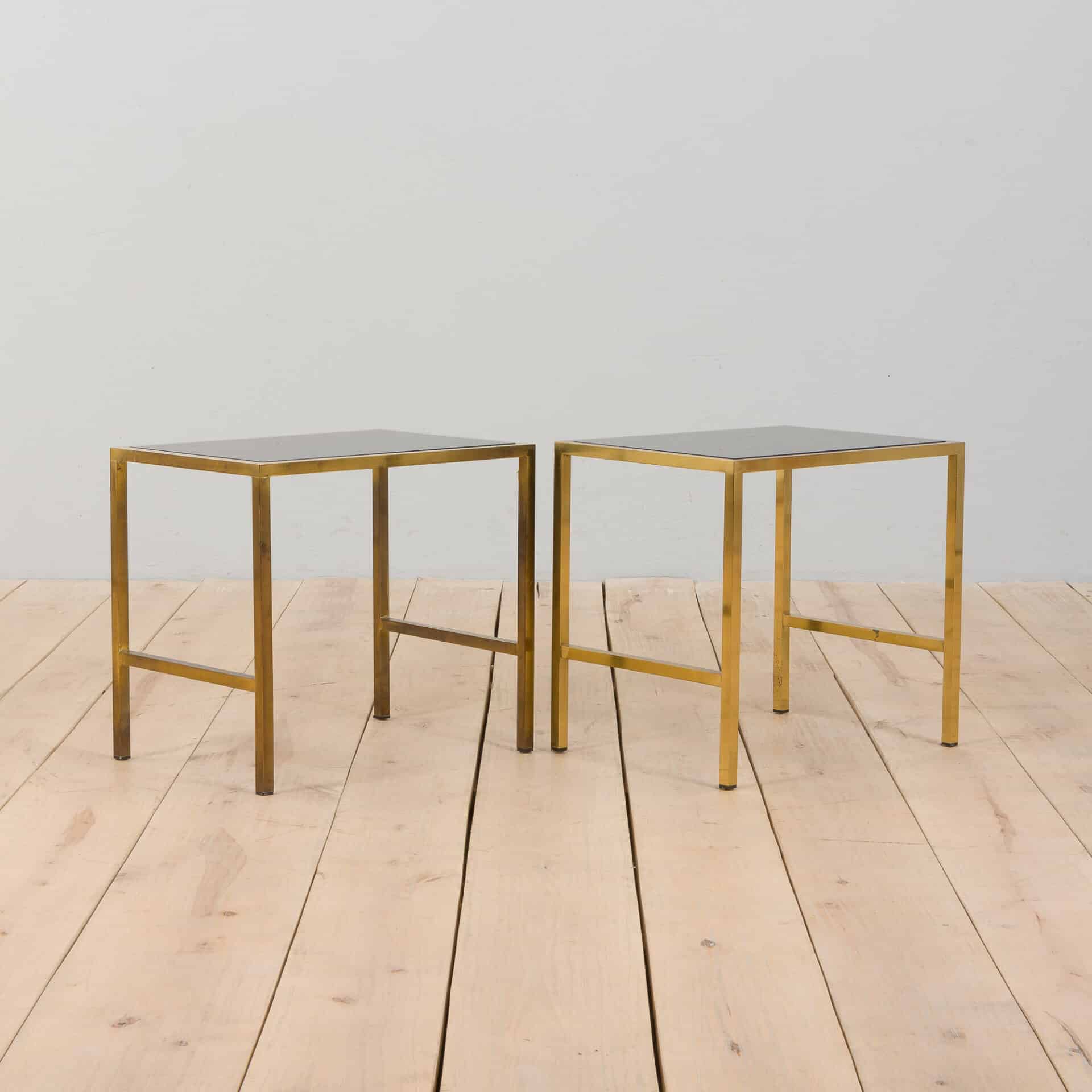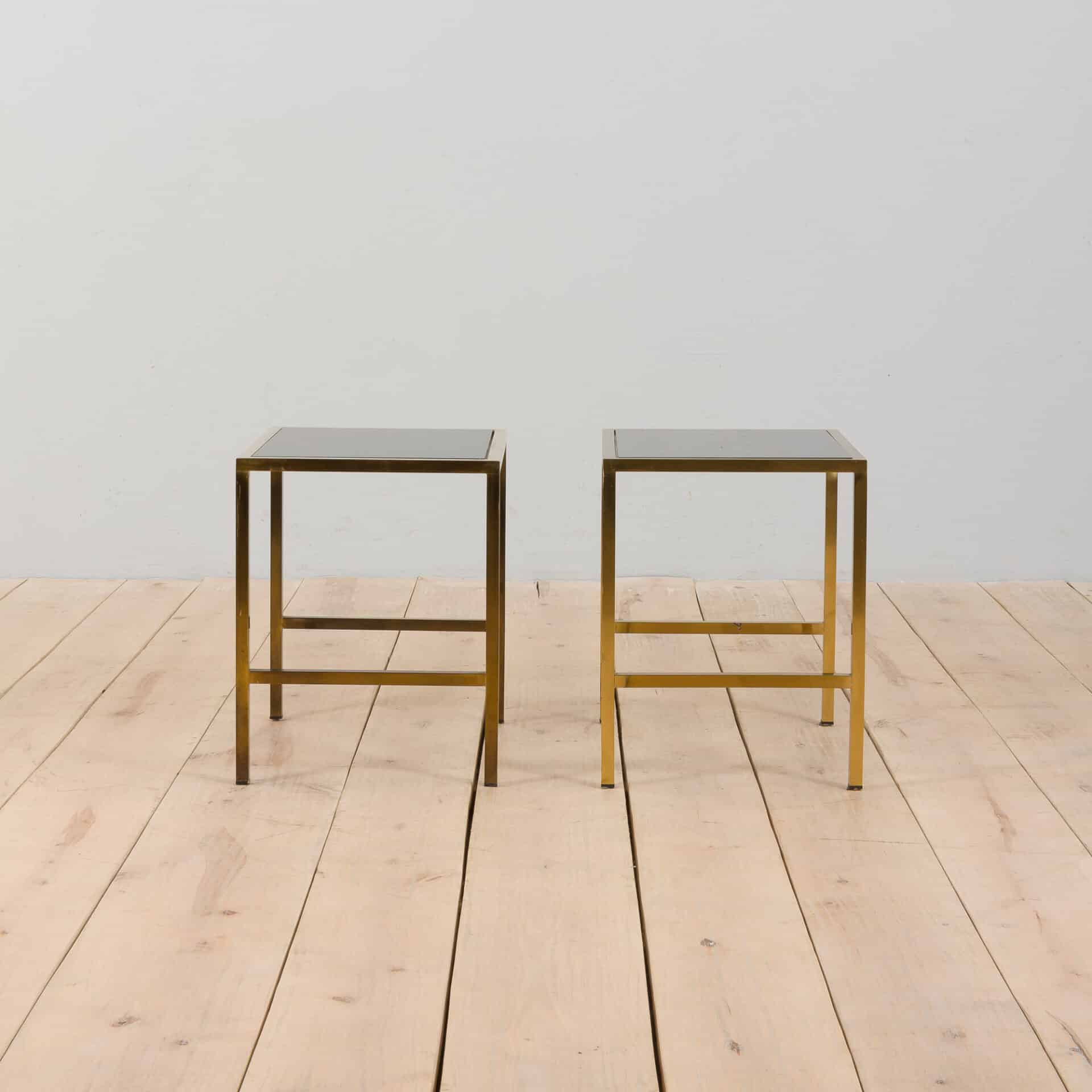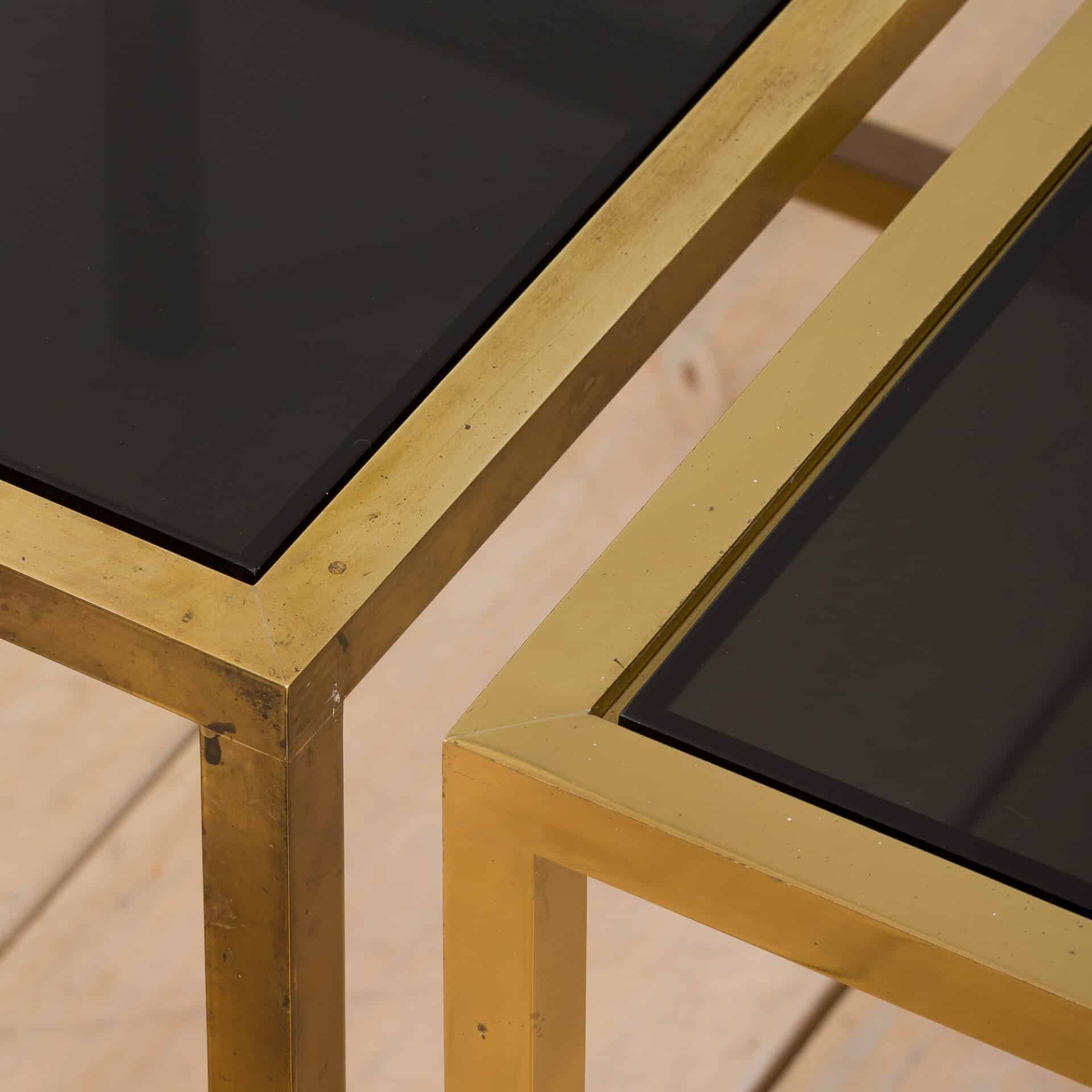 Brass metalwork in a strict and minimalistic design with smoked glass tabletop represents the Italian-modern style of the mid-century period. They can be used both as a side table or nightstand. Very good vintage original condition with rich patina and some traces related to age and use. Glass tabletops are in fantastic condition without noticeable scratches or chips.