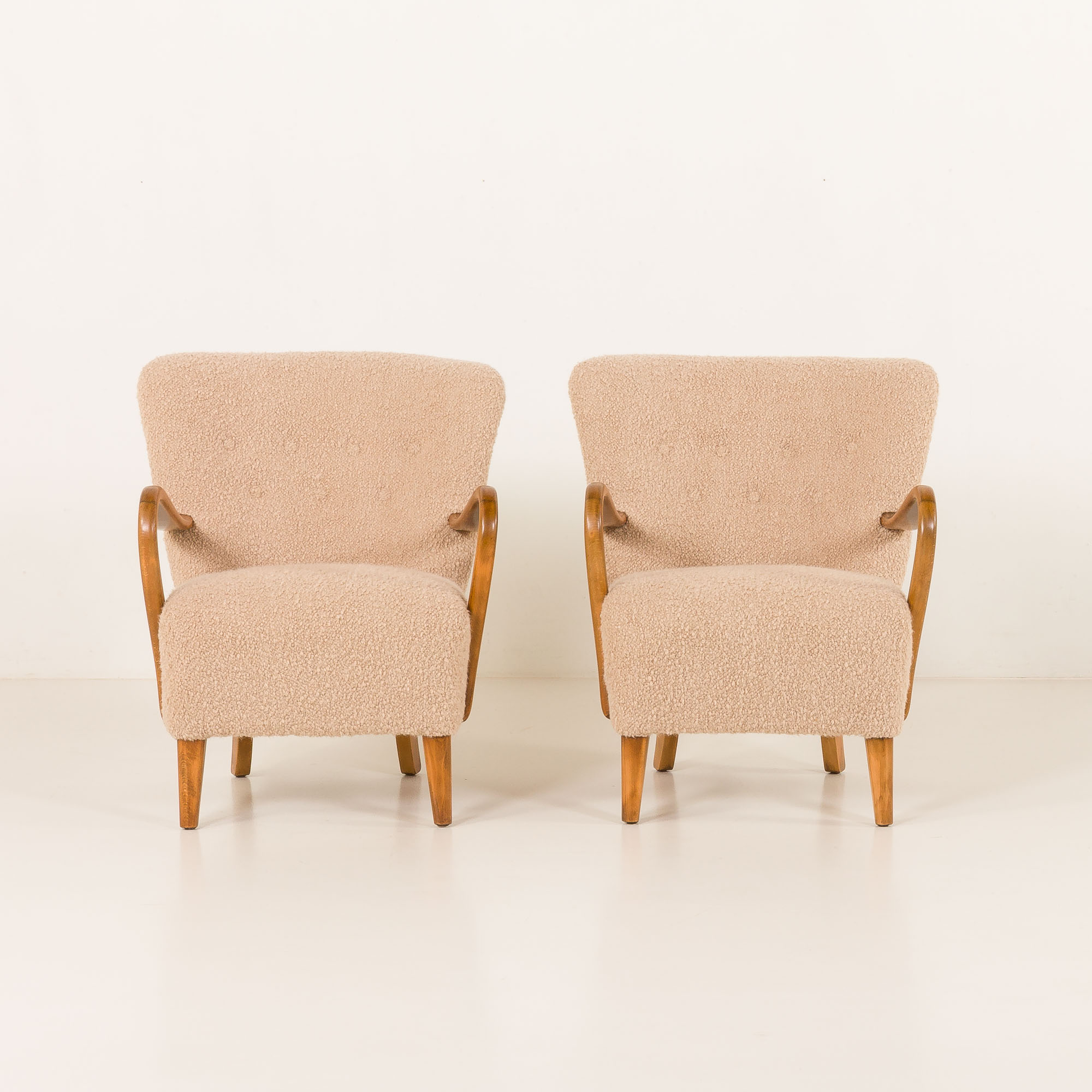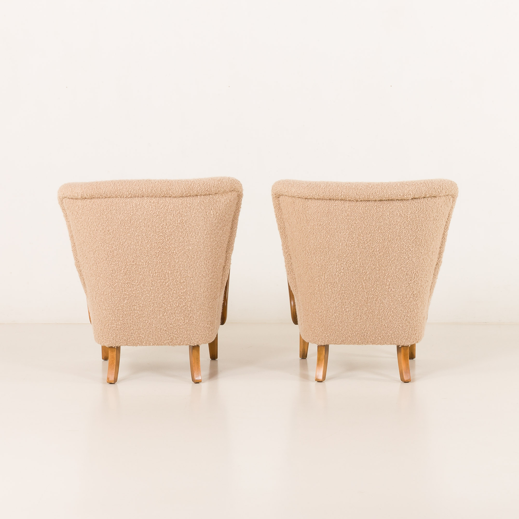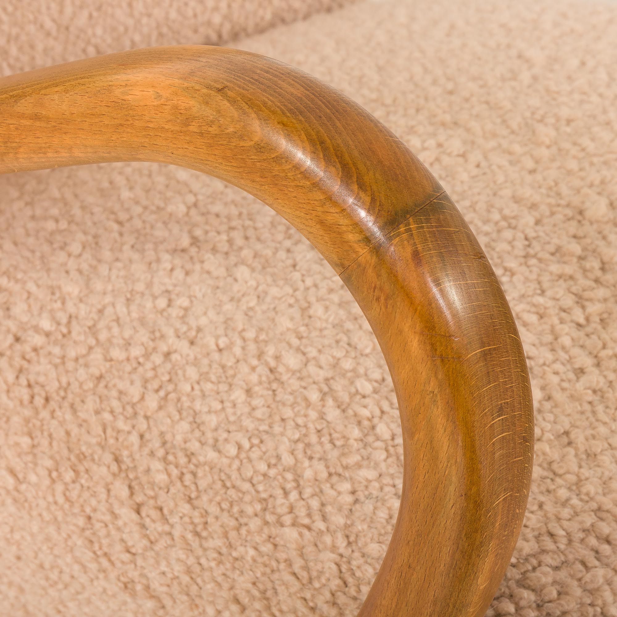 Lite drewniane ramy zostały w pełni odnowione, a następnie polakierowane na nowo, w celu podkreślenia usłojenia drewna. Siedziska i oparcia zostały starannie odnowione beżową wełną bouclé z nową pianką, co zapewnia trwałość i komfort. Ta ponadczasowa para foteli łączy w sobie funkcjonalność i elegancję, idealnie nadając się do dodania odrobiny stylu mid-century do salonu, pokoju wypoczynkowego lub innego pomieszczenia.
