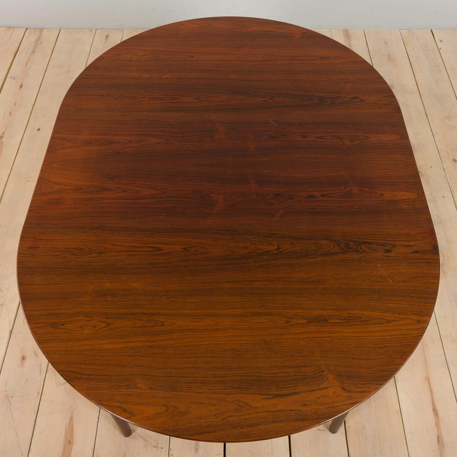 Elegancki okrągły do owalnego palisandrowy stół do jadalni zaprojektowany przez Arne Voddera dla Sibast w Danii w latach 60-tych. Główna powierzchnia blatu oraz dodatkowe skrzydło z cargą są w bardzo dobrym stanie z niewielkimi śladami zużycia, dlatego wymagały jedynie oczyszczenia i wypolerowania. Drugi dodatkowy blat bez cargi wykonany z innego drewna został pomalowane palisandrową bejcą i pokryte półmatowym lakierem. Stół ten posiada dwa wysuwane liście o szerokości 50 cm, dzięki czemu stół rozkłada się z okrągłej średnicy 120 cm do szerokości 170 cm z jednym wysuwanym liściem i 230 cm przy całkowitym rozłożeniu. Wymiar w pełni rozłożone